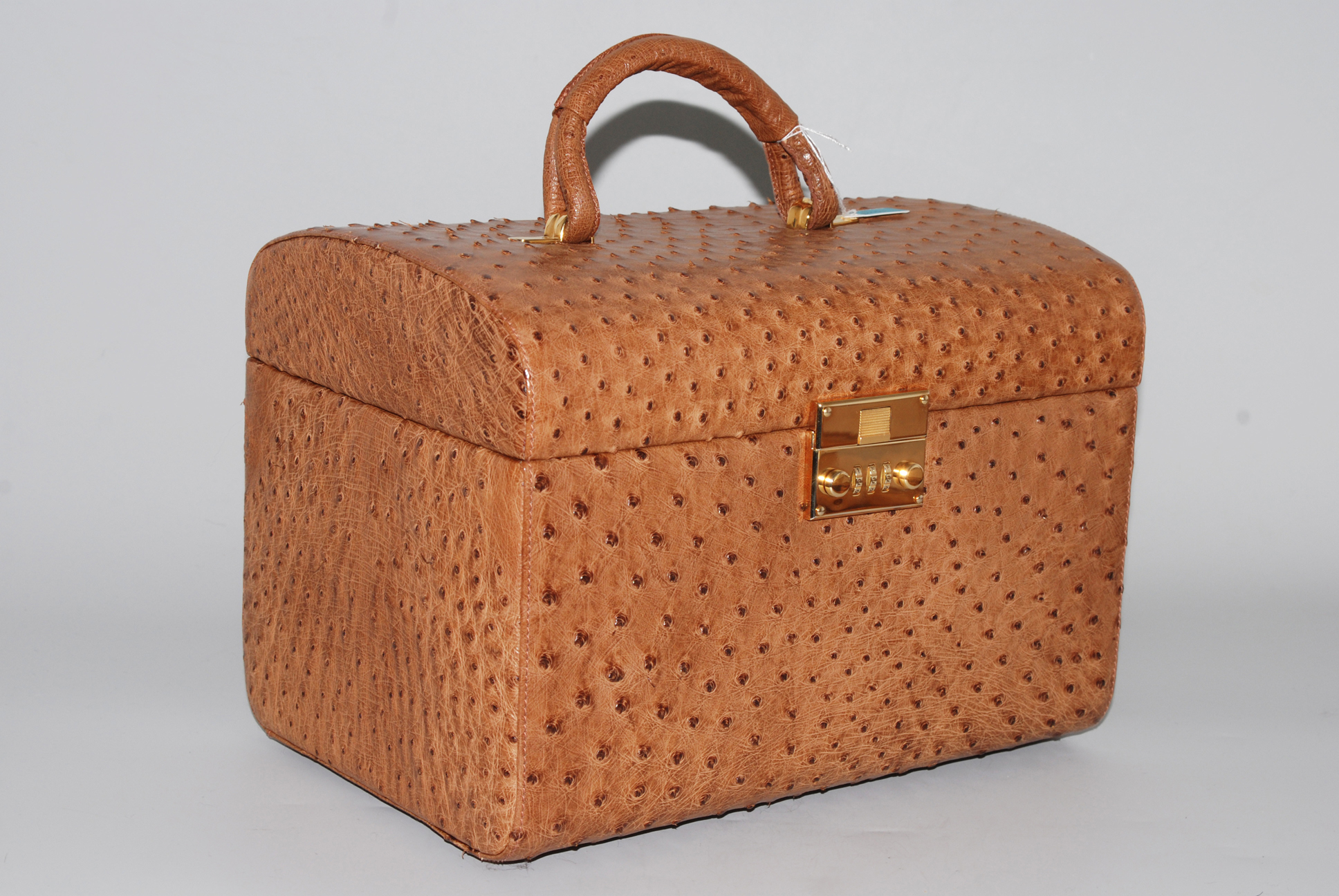 Braunes Straussenleder. Tragegriff. Zahlenschloss. Innen ein grosses Fach mit verstellbaren Schlaufen für Fläschchen und ein flaches Fach für Schmuck. In Original-Schutzbeutel. 30x21x20 cm. Sehr guter Zustand.