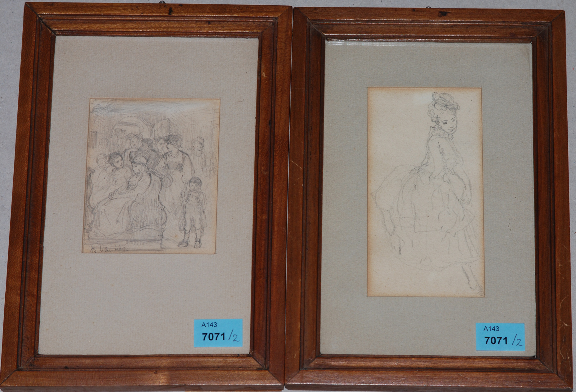 Eine Dame und eine Familienszene. Zwei Bleistiftzeichnungen (Entwürfe für Buchillustration?). Ca. 9x7 und 12x6,5 cm. Beide gerahmt. - Beigelegt: Vautiermonographie von A. Rosenberg, 1897 (Knackfuss-Künstlermonographien).