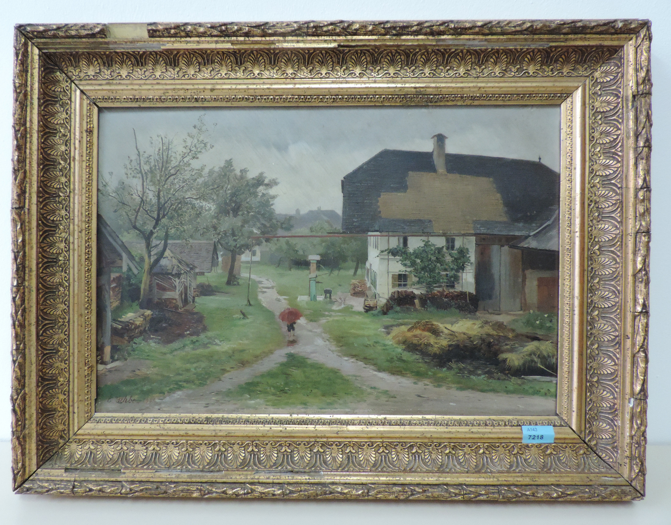 "Salzburger Bauernhof bei Regenwetter". 1884. Öl auf Holz. Unten links signiert und datiert. 26x40 cm.