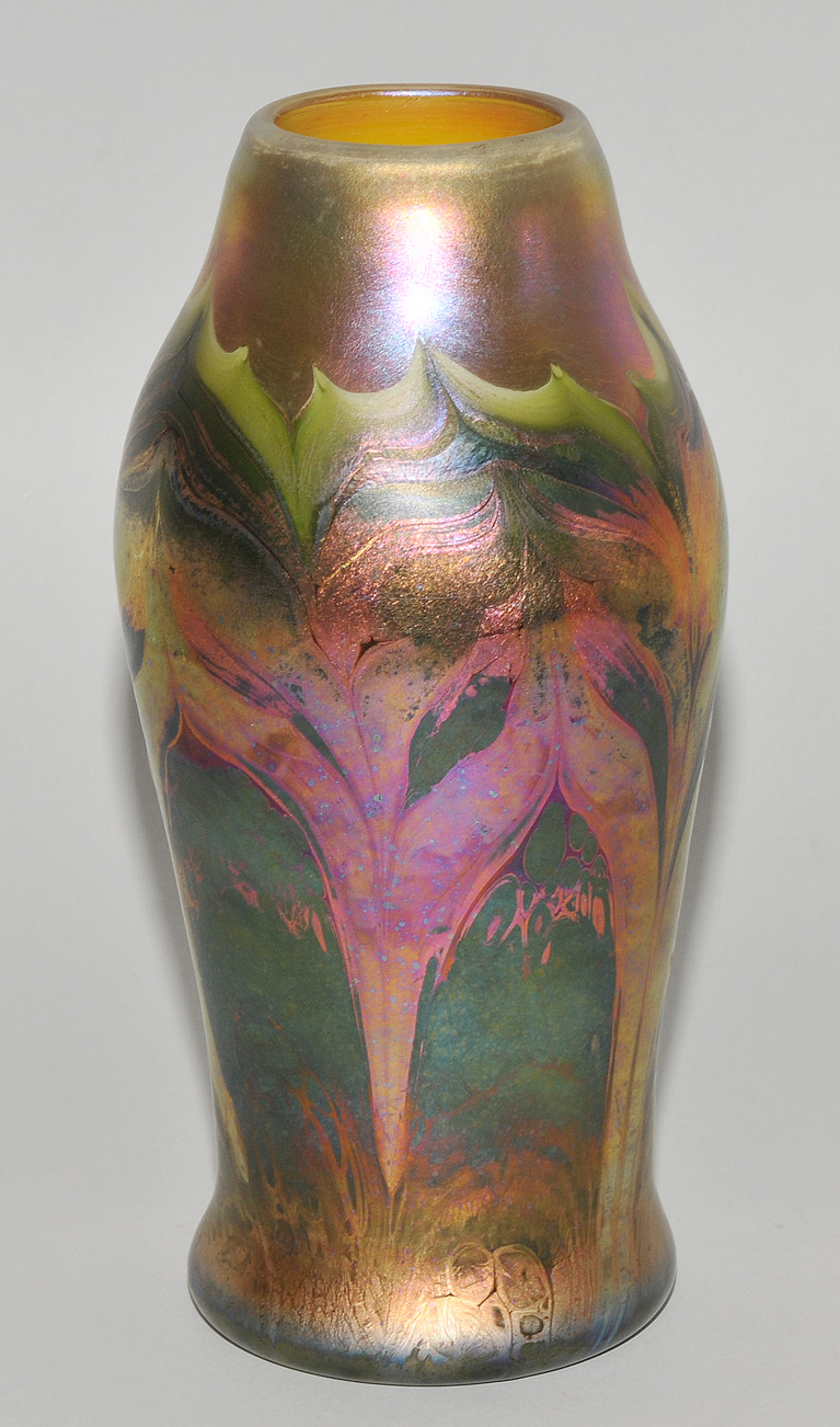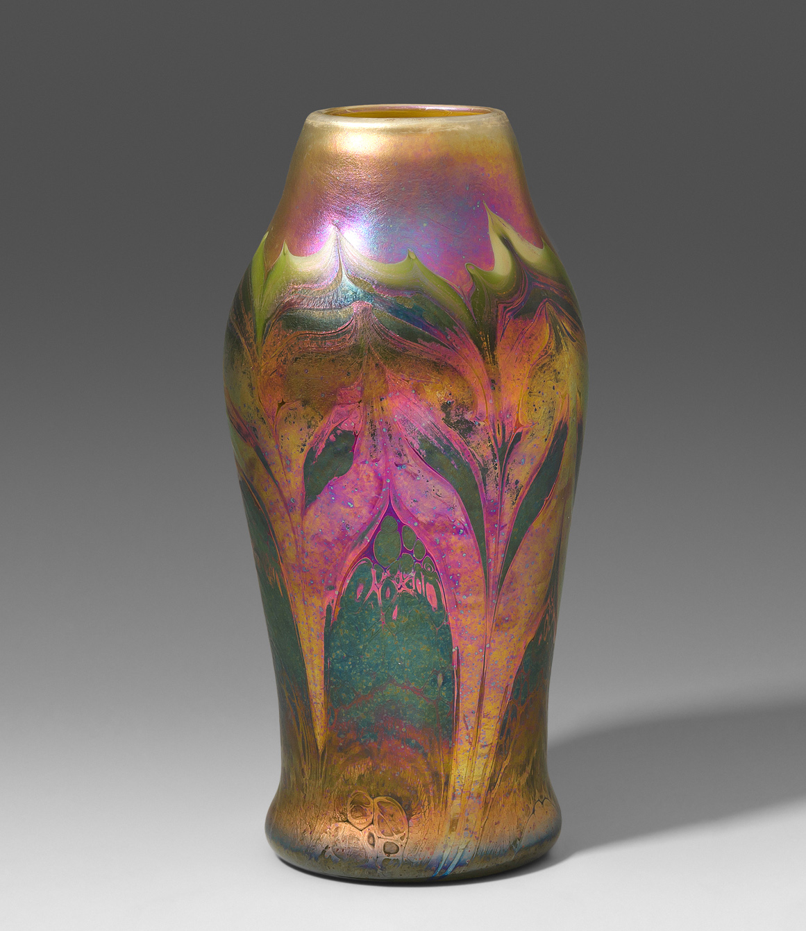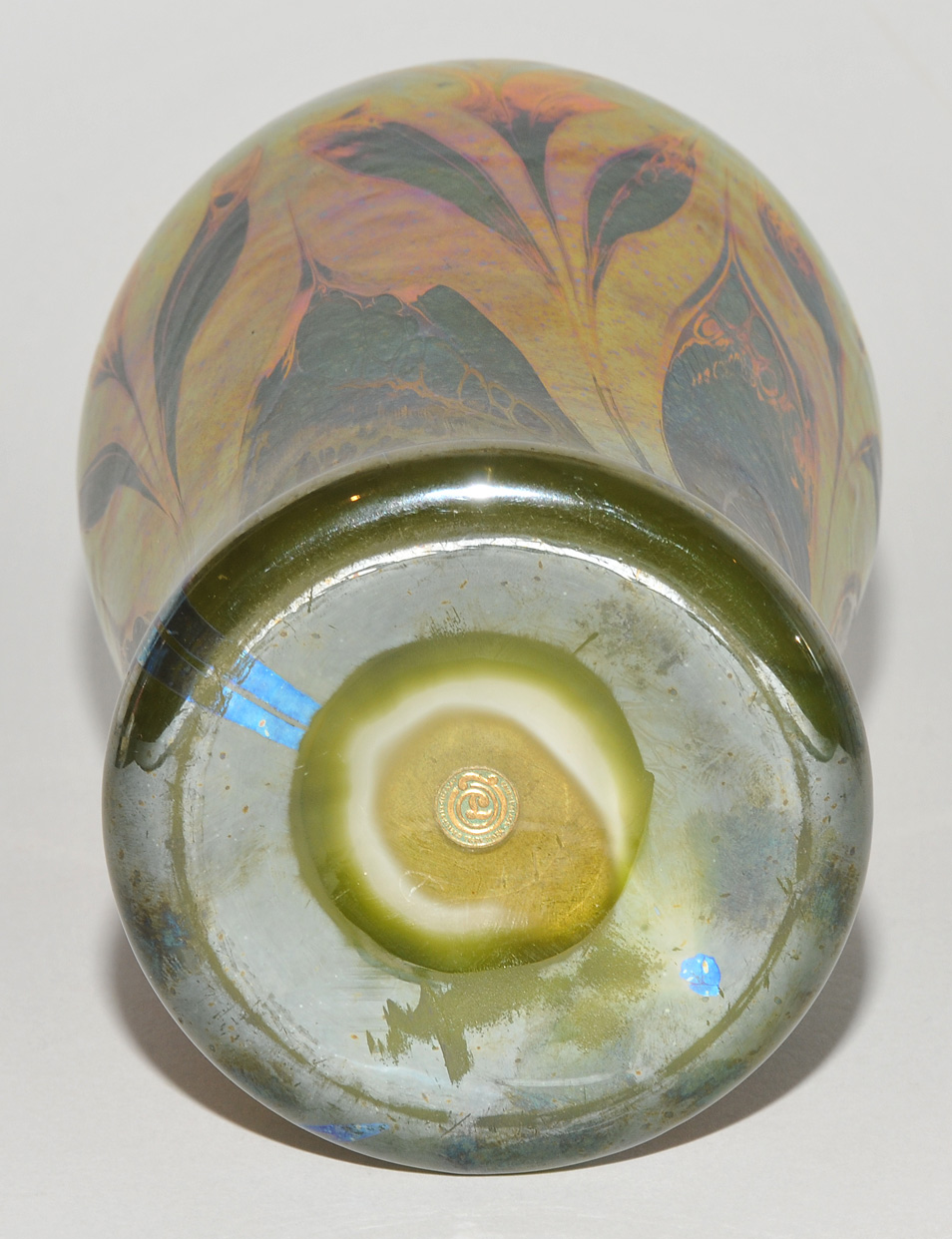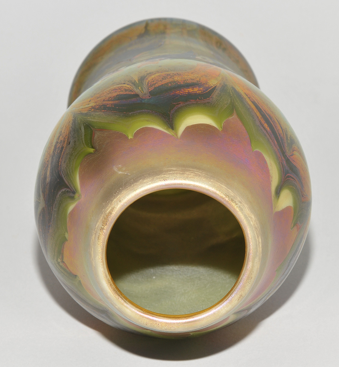 Um/nach 1902. New York. Farbloses Glas, weiss-grün überfangen, gekämmter Fadendekor, lüstriert und matt irisiert. Bezeichnet: Firmenmarke (Papieretikett). H 22 cm.
