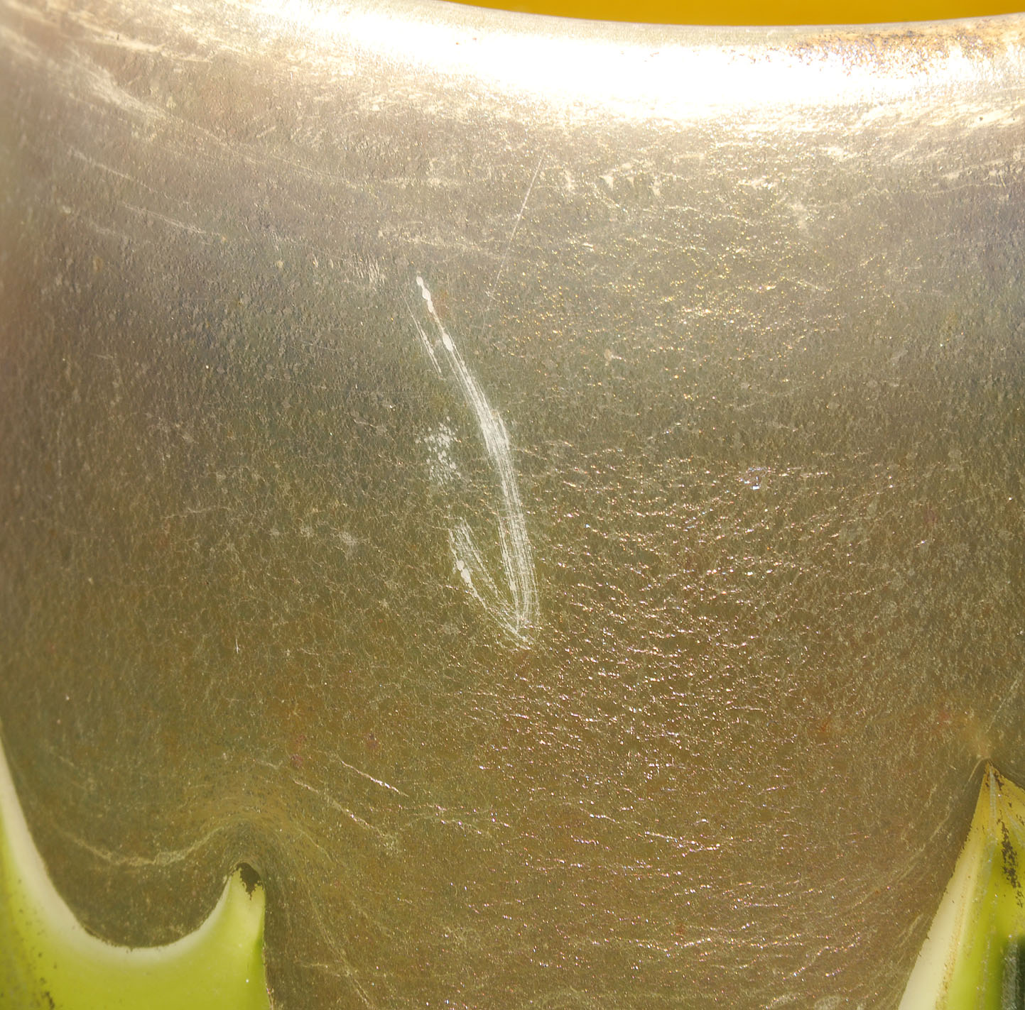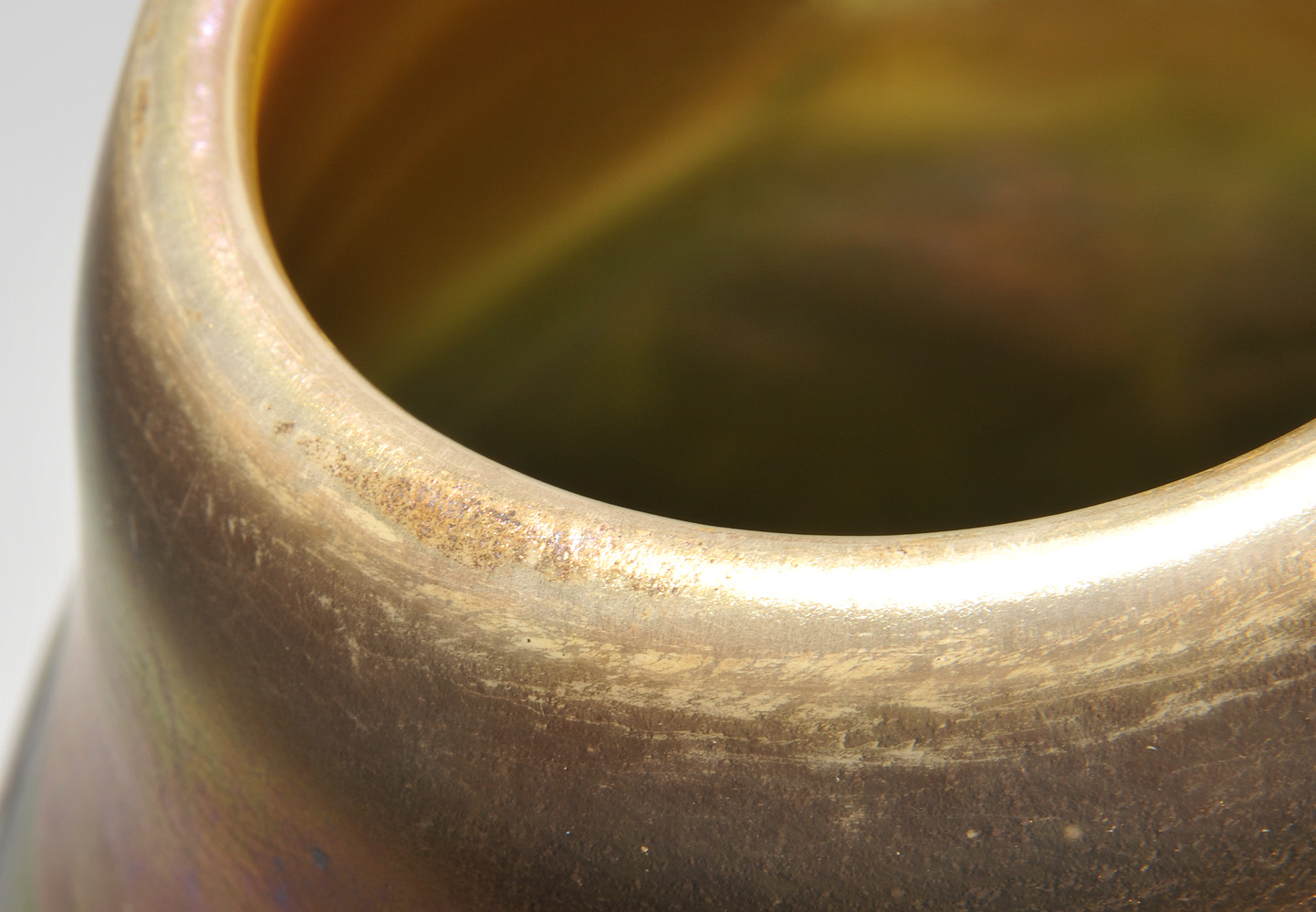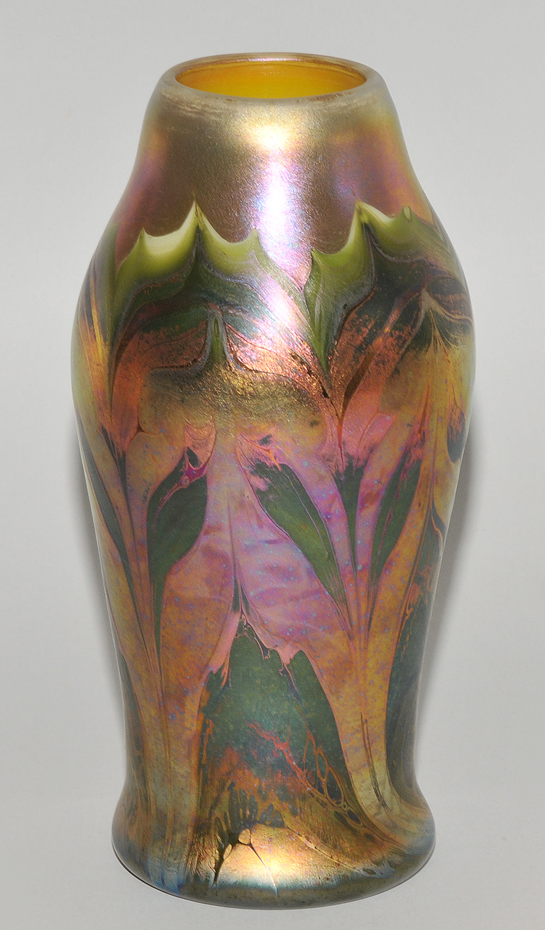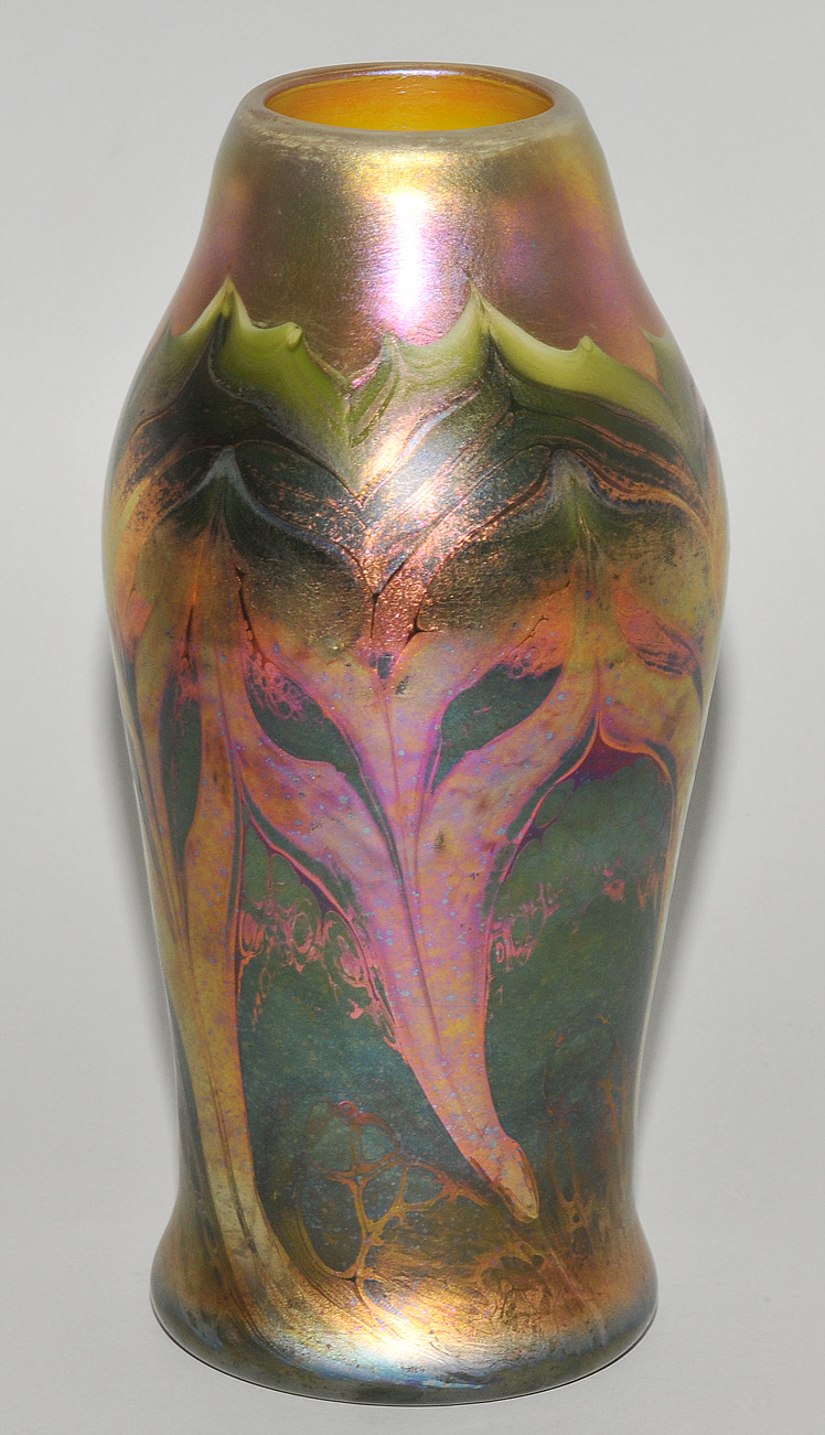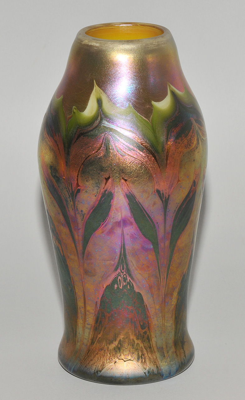 Um/nach 1902. New York. Farbloses Glas, weiss-grün überfangen, gekämmter Fadendekor, lüstriert und matt irisiert. Bezeichnet: Firmenmarke (Papieretikett). H 22 cm.