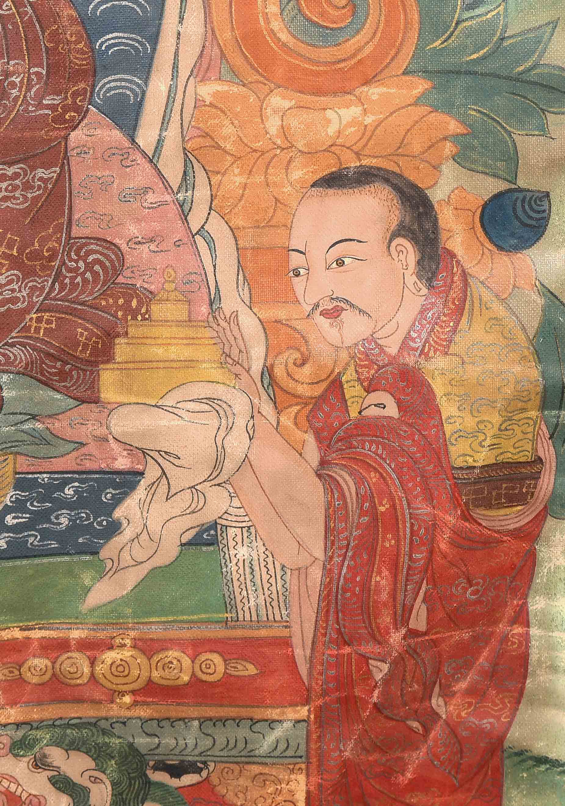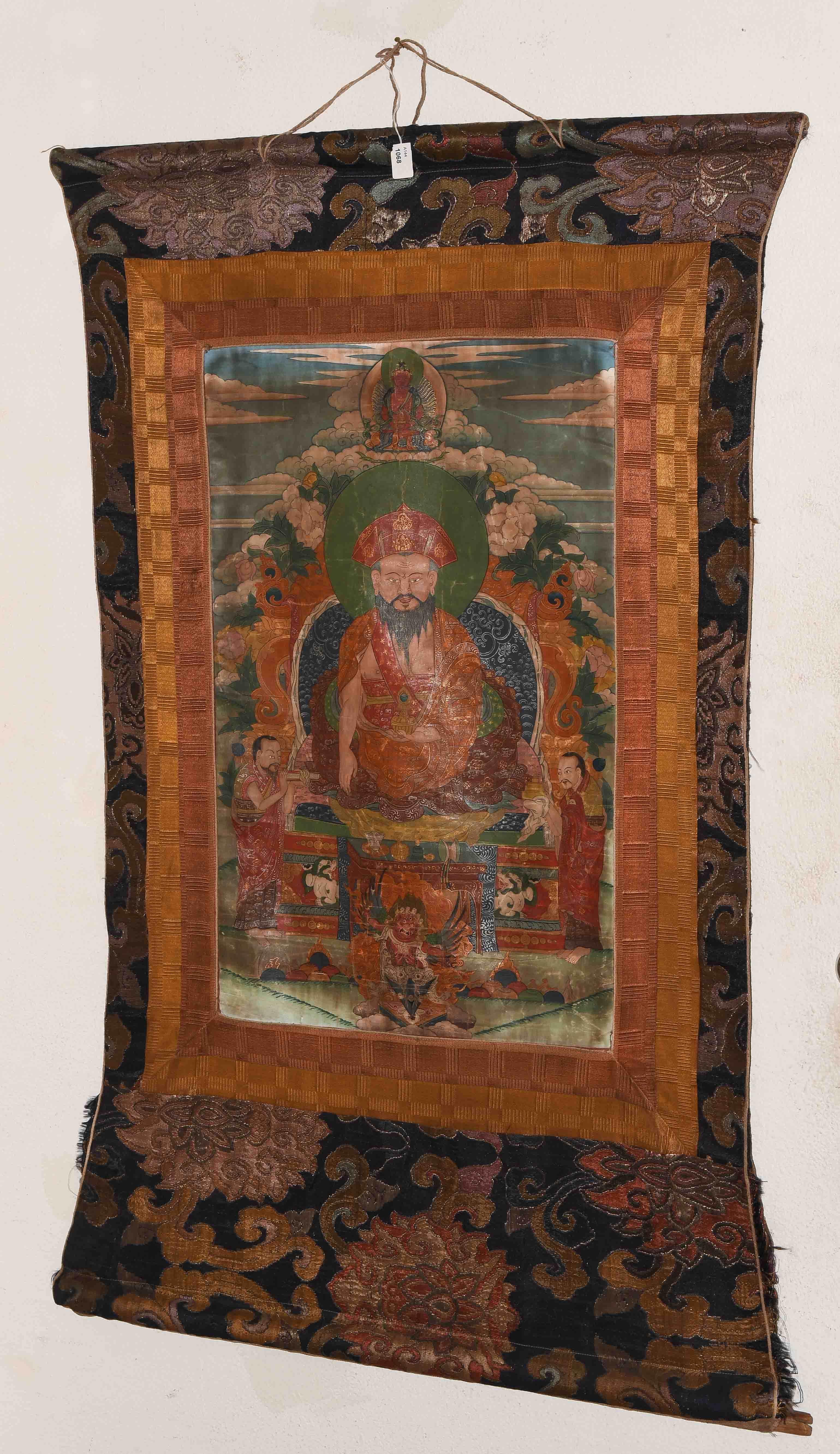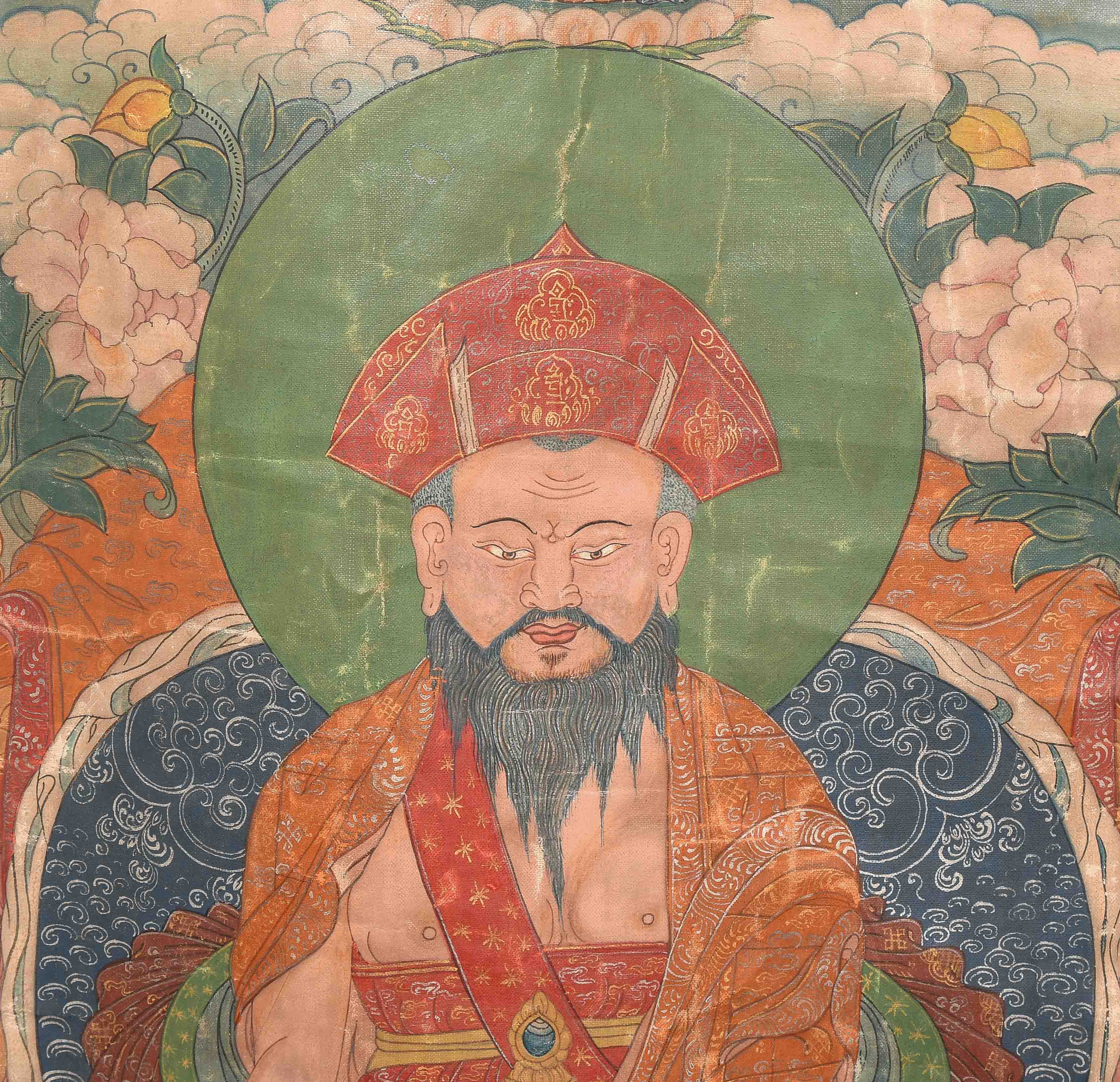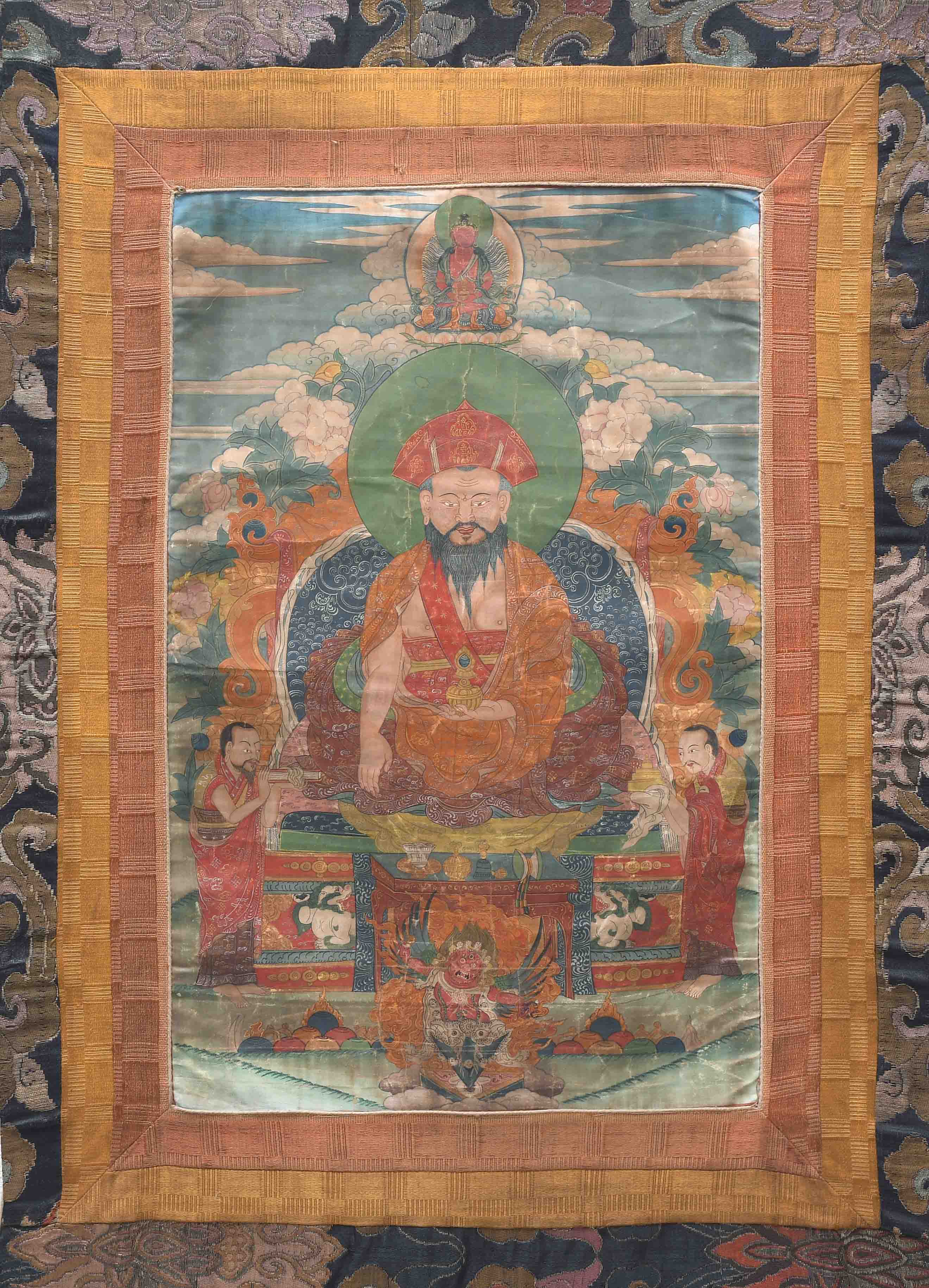 Nepal, 20.Jh. Farbe und Gold auf Leinwand. Darstellung von Shabdrung sitzend im Zentrum auf einem Kissen und gekleidet in reich verziertem Brokatgewand in Orange und Rot. Sein bärtiges Gesicht mit konzentriertem Ausdruck, sein Haupt bedeckt mit der charakteristischen Mütze und umgeben von einer grünen Aureole. In der Linken hält er eine Schale. Er wird flankiert von zwei Mönchen. Fleckig, Knitter. 58x36,5 cm. Brokatrahmen mit Lotos-/Rankendekor. Risse. 102x60.