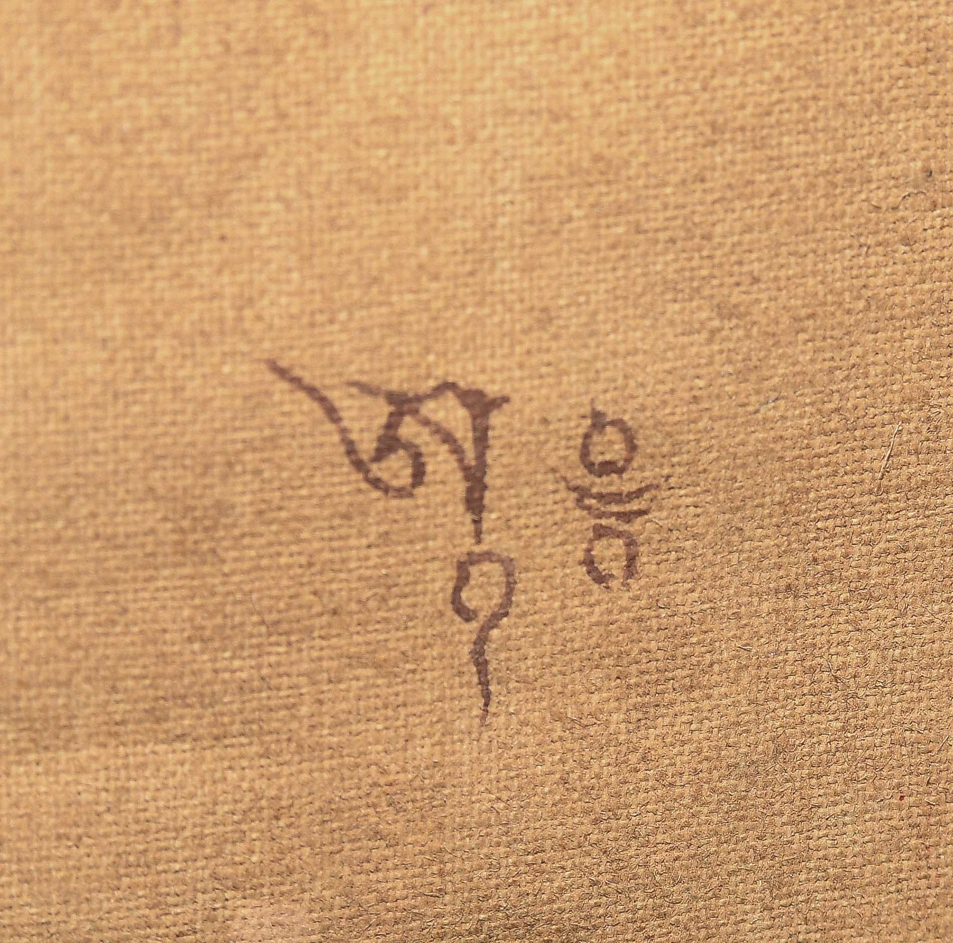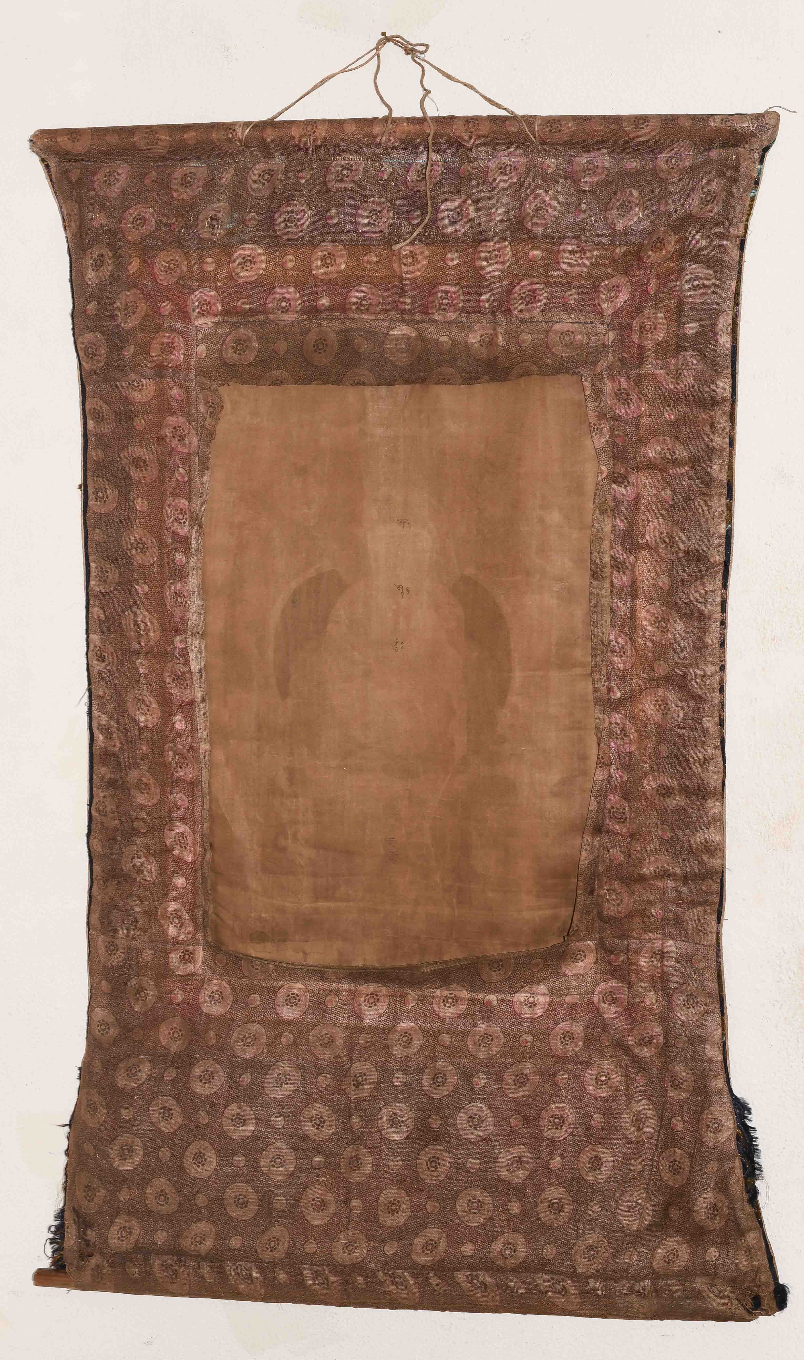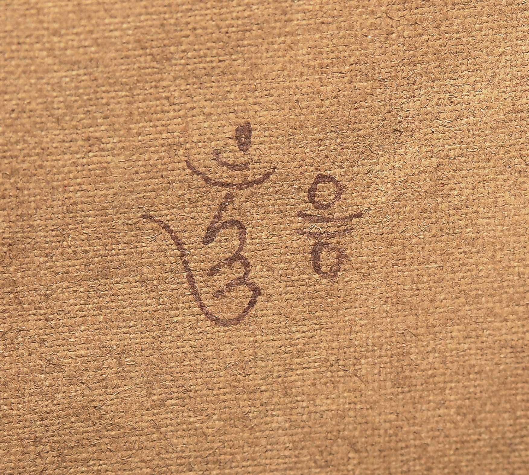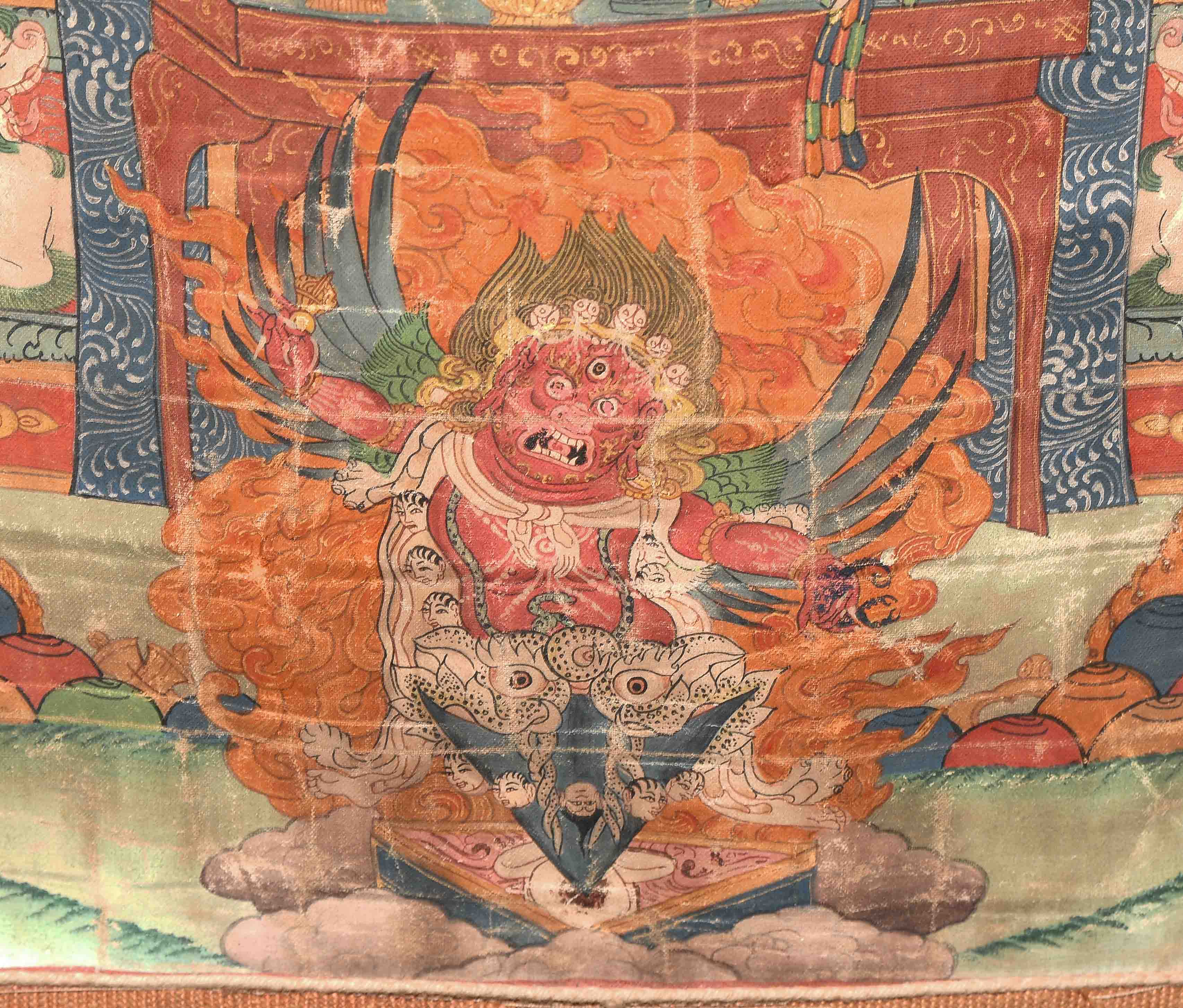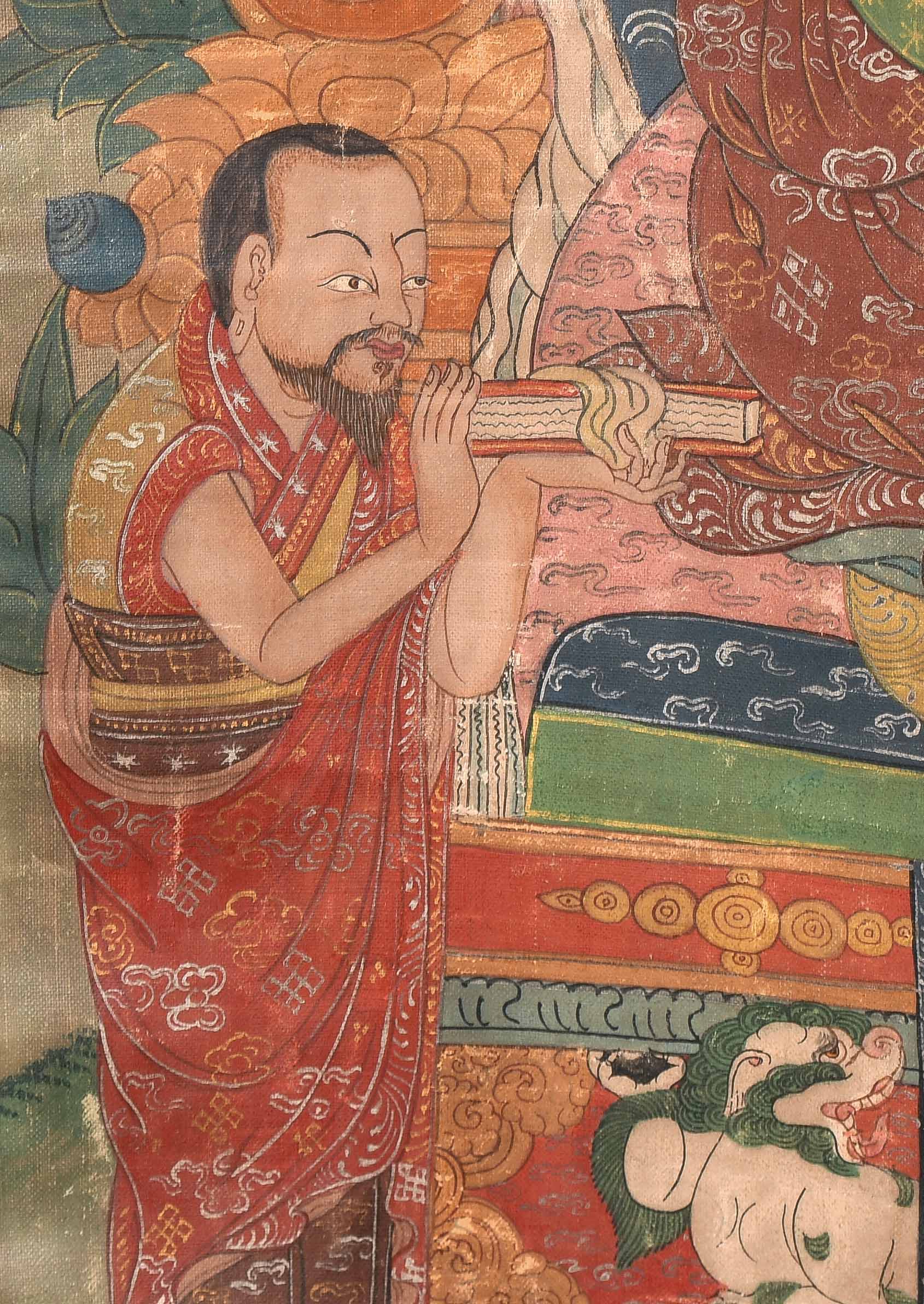 Nepal, 20.Jh. Farbe und Gold auf Leinwand. Darstellung von Shabdrung sitzend im Zentrum auf einem Kissen und gekleidet in reich verziertem Brokatgewand in Orange und Rot. Sein bärtiges Gesicht mit konzentriertem Ausdruck, sein Haupt bedeckt mit der charakteristischen Mütze und umgeben von einer grünen Aureole. In der Linken hält er eine Schale. Er wird flankiert von zwei Mönchen. Fleckig, Knitter. 58x36,5 cm. Brokatrahmen mit Lotos-/Rankendekor. Risse. 102x60.