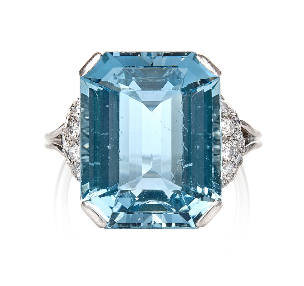 750 Weissgold. Eleganter Ring mit 1 feinen Aquamarin von ca. 11.50 ct, flankiert von 30 Diamanten von zus. ca. 0.40 ct. Gr. 55,5, 7,3 g. Versicherungsschätzung.
