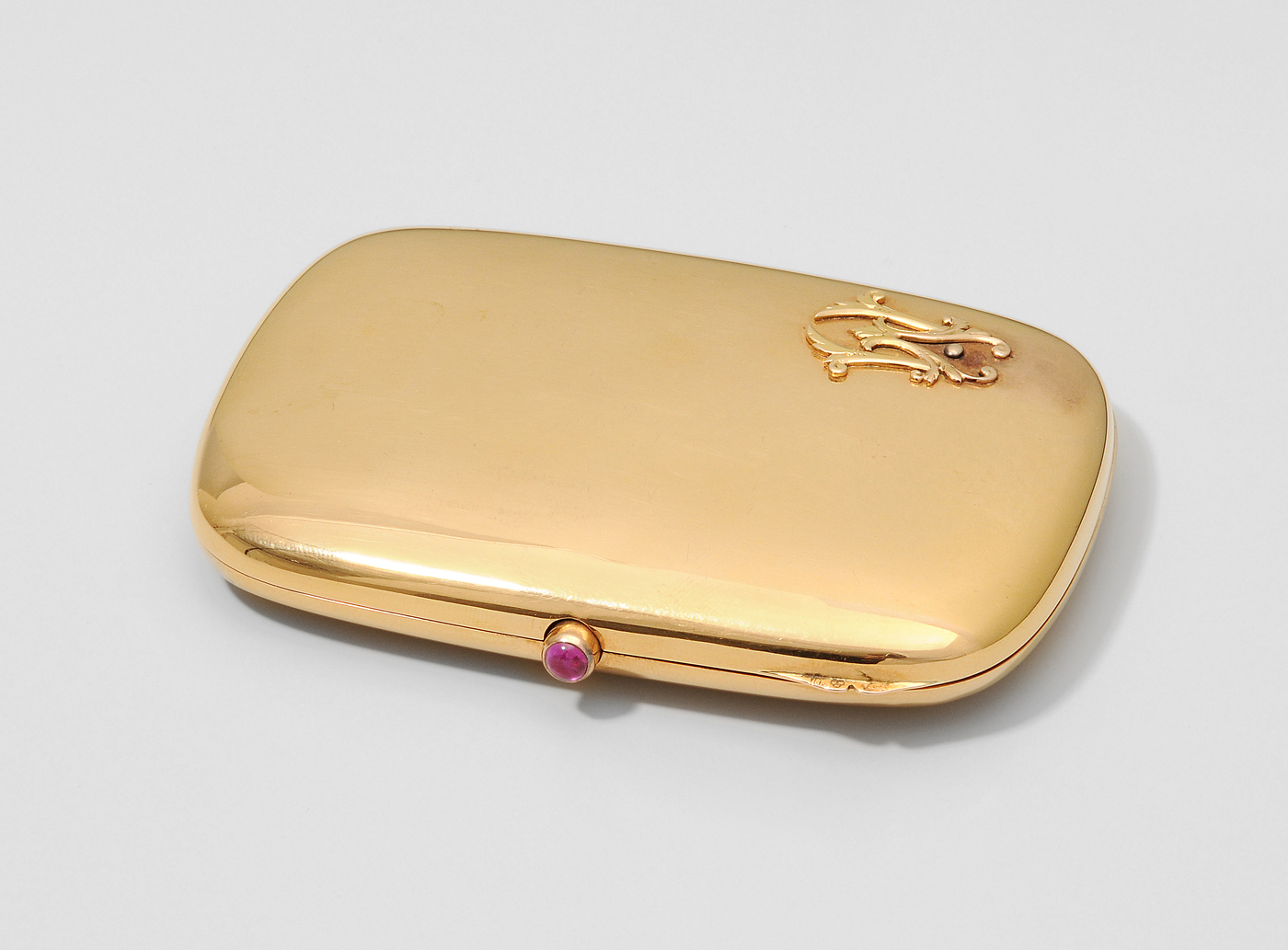 Stockholm, um 1900. Rotgold 18 ct. Meistermarke Karl Anderson. Gerundete Rechteckform, Verschluss mit Farbstein besetzt. Auf Deckel applizierte Ligaturinitialen. Garantie-, Meistermarke K.A, Feingehalt 750. 6x9x1 cm/ ca. 94 g.