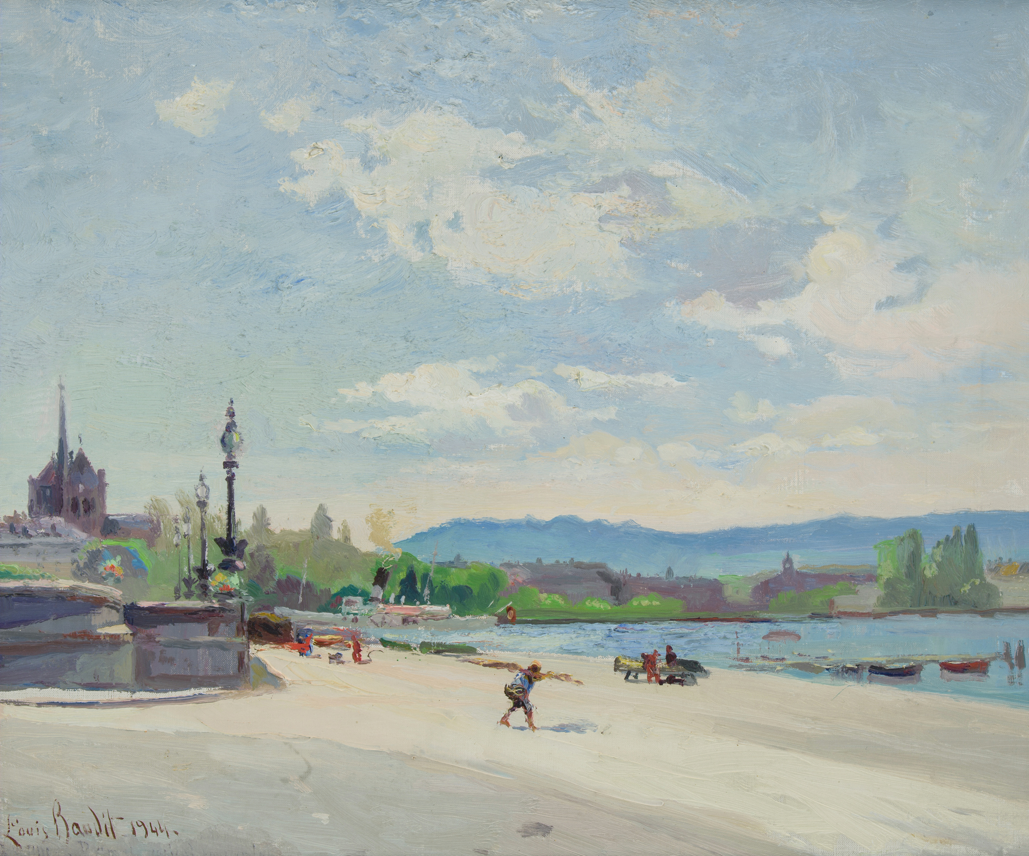 "Après midi dans le port, Genève", 1944. Öl auf Leinwand. Unten links signiert und datiert, verso bezeichnet. 38,5x46,5 cm. -Übermalte Dedikation in der linken unteren Ecke.