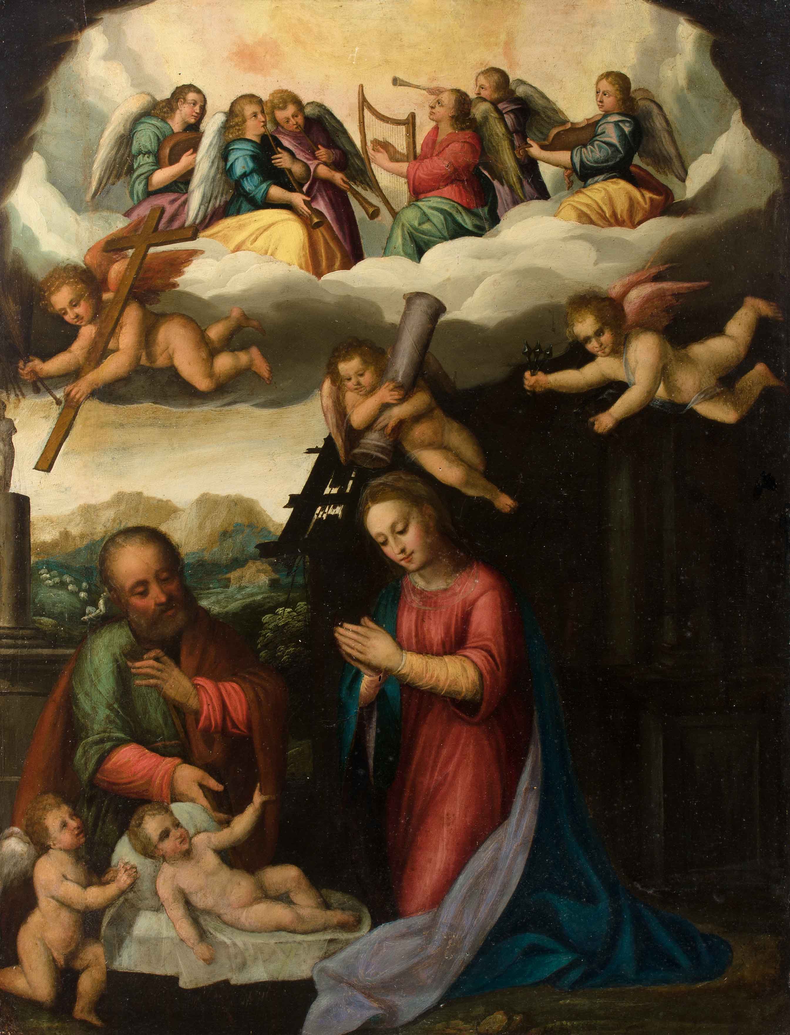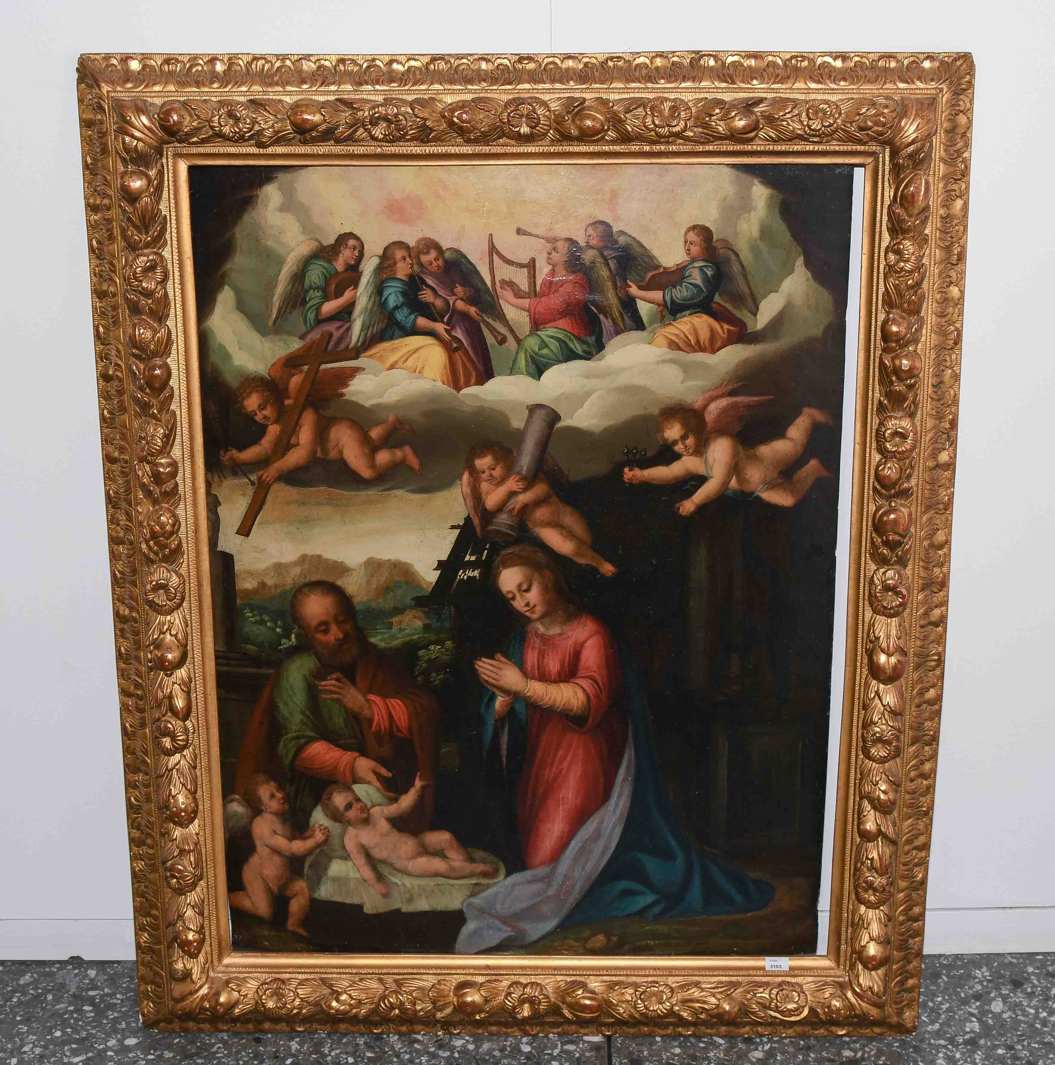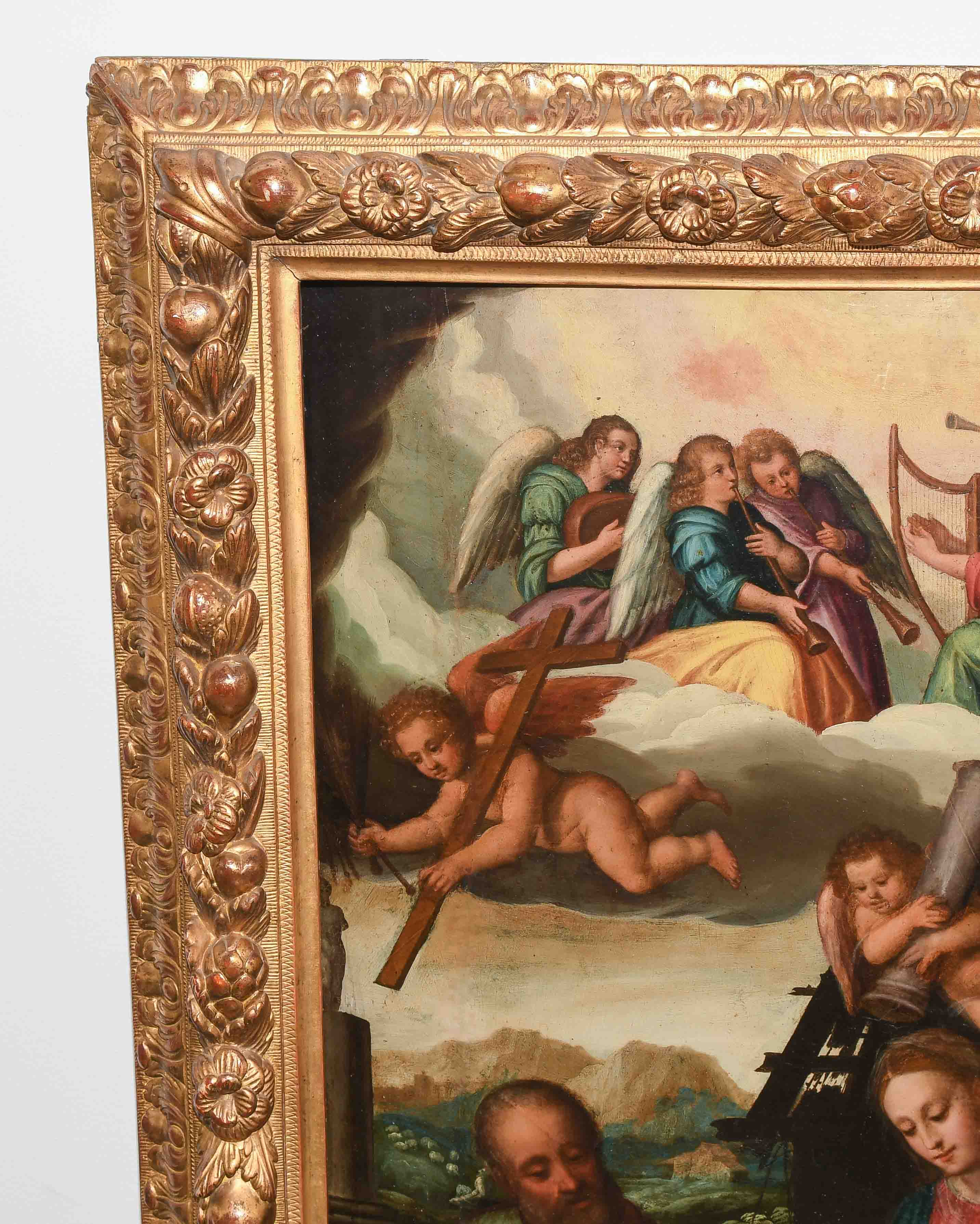 Heilige Familie mit Johannesknaben und Engeln. Öl auf Holz. 86x64,5 cm.