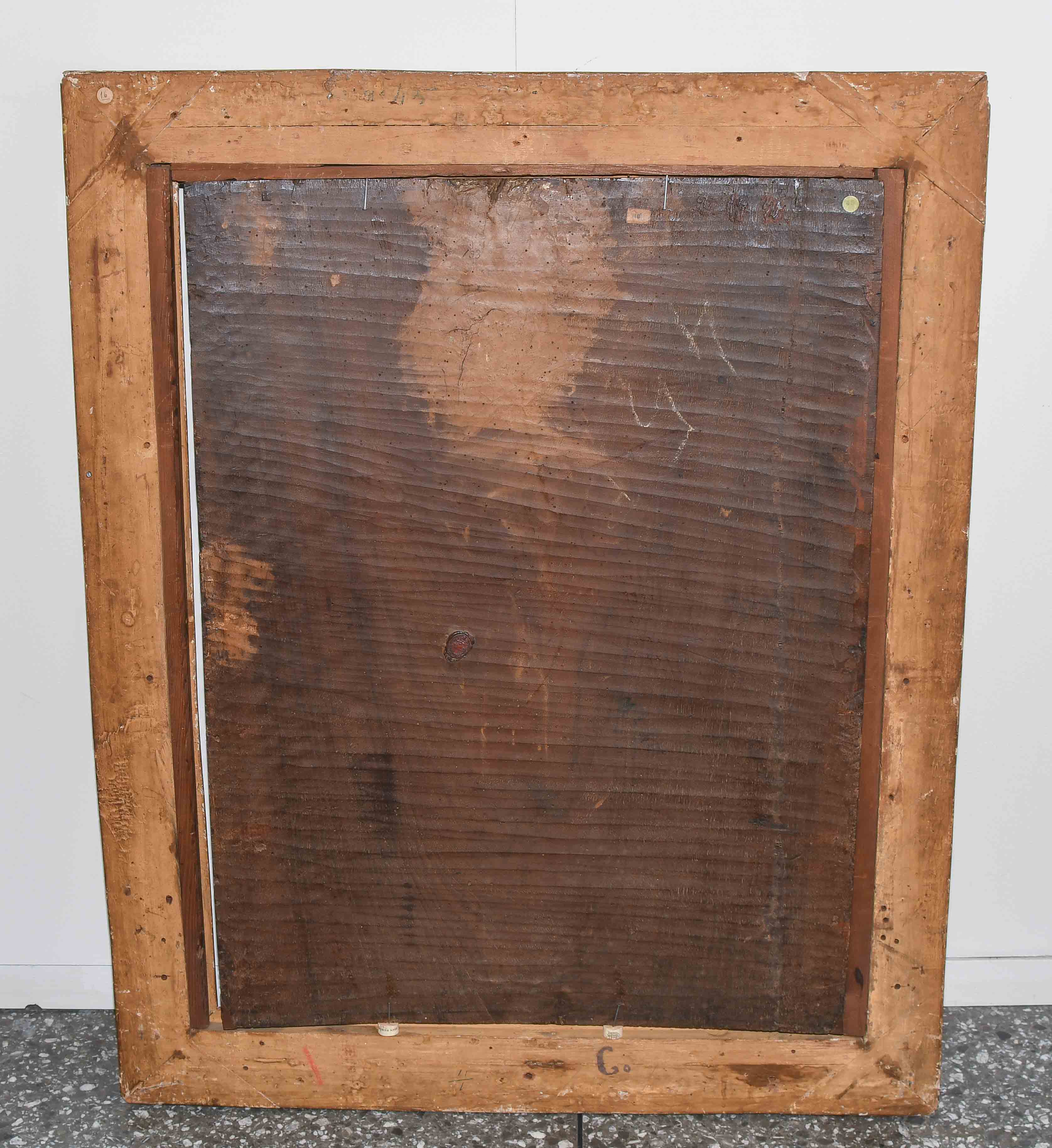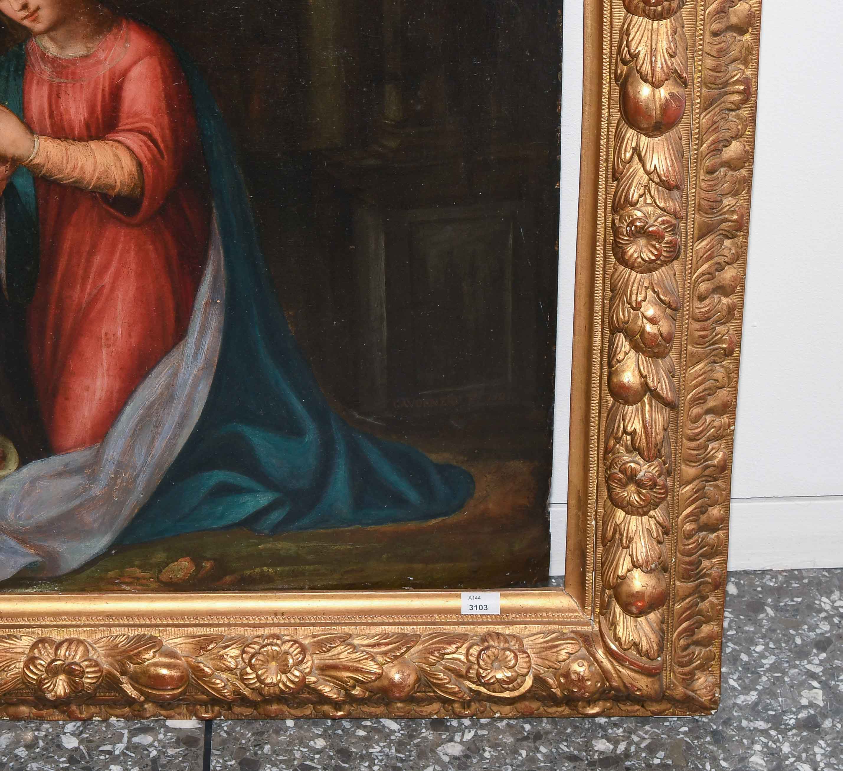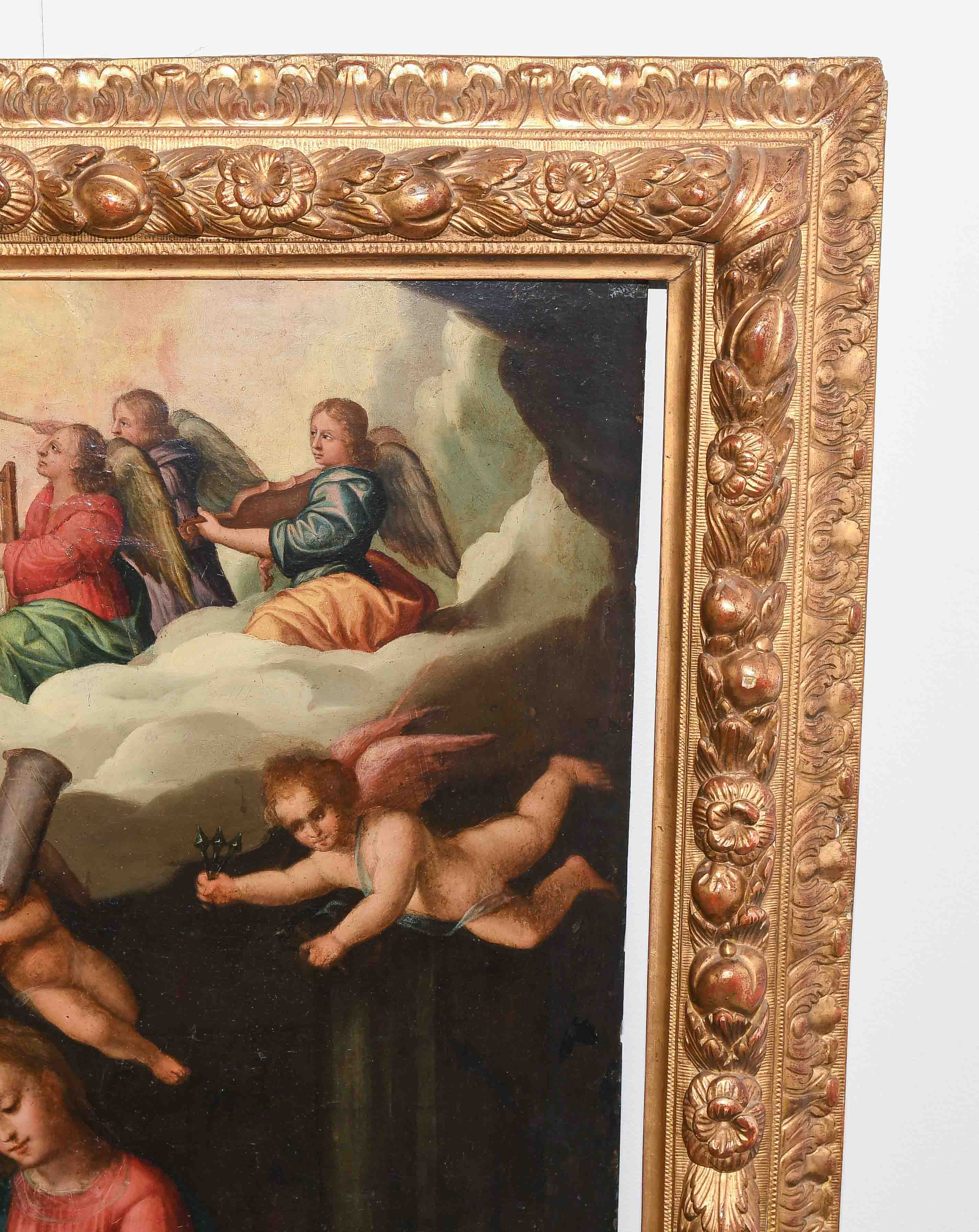 Heilige Familie mit Johannesknaben und Engeln. Öl auf Holz. 86x64,5 cm.
