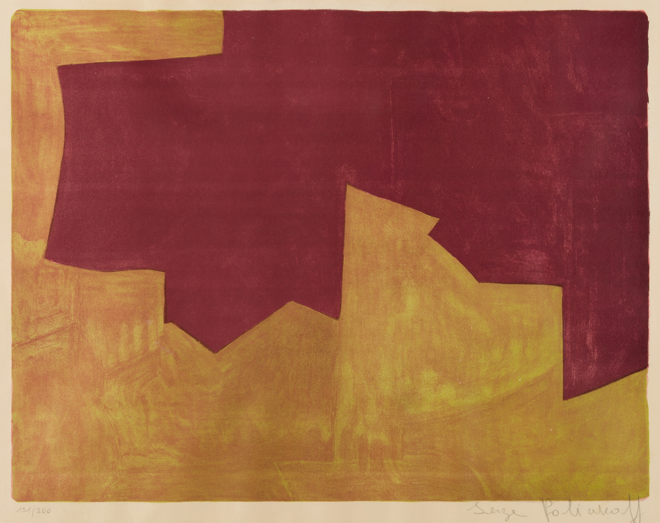 "Composition lie-de-vin et orange". 1963. Farblithographie. 131/300. Unten rechts in Bleistift signiert. Verso Stempel: "Jahresausgabe der Kestner-Gesellschaft". Blattgrösse 64,3x76 cm. Gerahmt. -Blatt gebräunt. Lichtrand. Knitter. Ränder und Ecken leicht bestossen. Verso leichter Papierabrieb an den oberen Ecken. Verso am oberen Rand an Passepartout montiert.