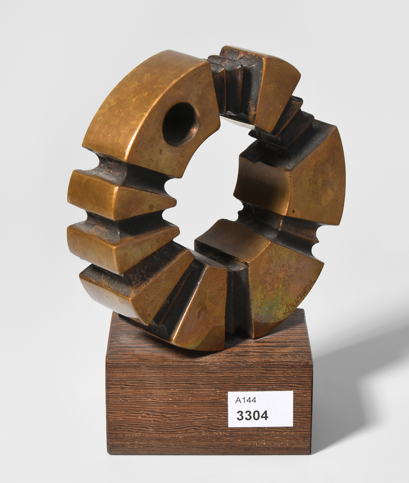 Kreis. Bronze. Auf der Bronze signiert. H 11 auf Holzsockel 15 cm. -Patina. Leicht schmutzig.
