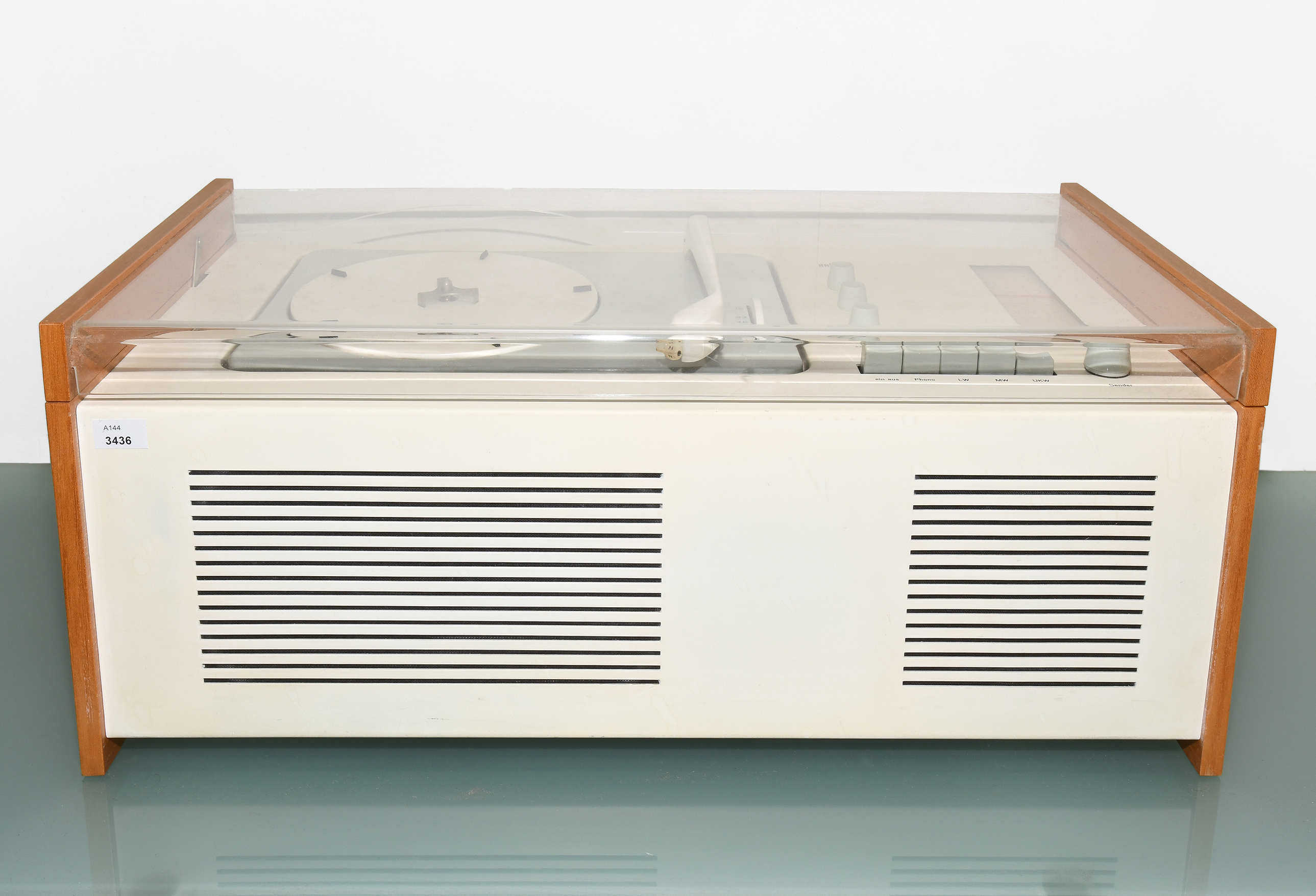 Plattenspieler mit Radio, Modell SK 5, Entwurf 1956. Hersteller Braun GmbH, Deutschland. Plexiglasabdeckung, Holzrahmen und Plastikgehäuse. Funktionsfähig. Gebrauchsspuren.