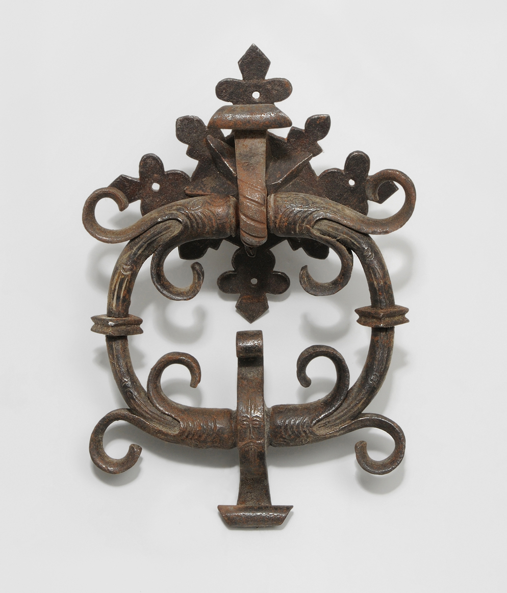 Deutsch, Renaissance. Eisen. Ring geschmiedet und geschnitten, Tierköpfe mit eingerollten Blattenden. Sternförmige, ausgehauene Anschlagplatte. Gewindestange mit Vierkant-Mutter. H 22 cm.