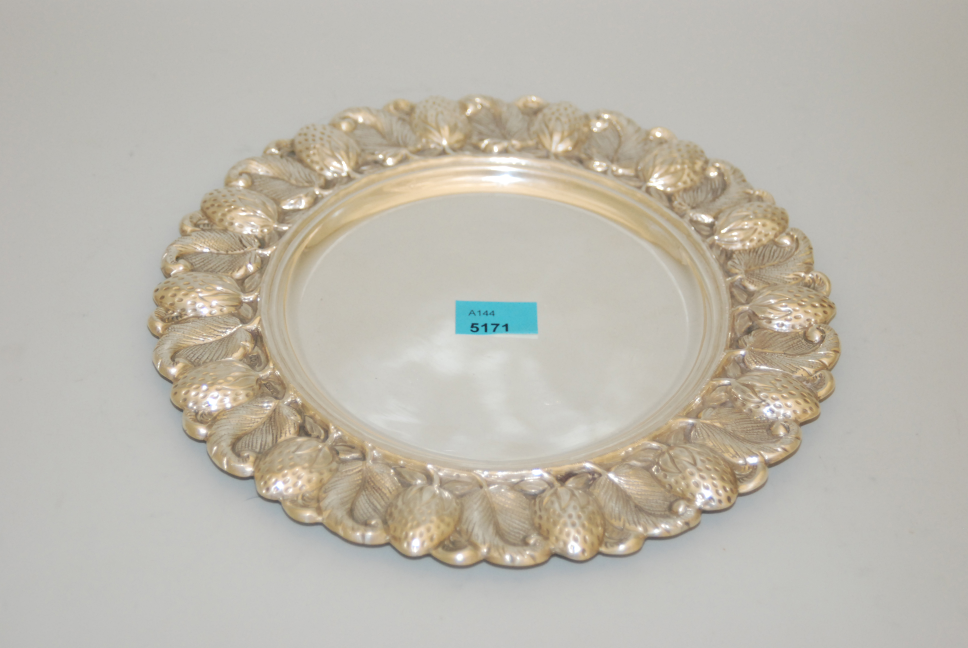 20.Jh. Silber. Marke K.INCE. Rundform, umrandet mit reliefiertem Erdbeerdekor. Feingehalt 800. D 20.5 cm/ ca. 220 g.