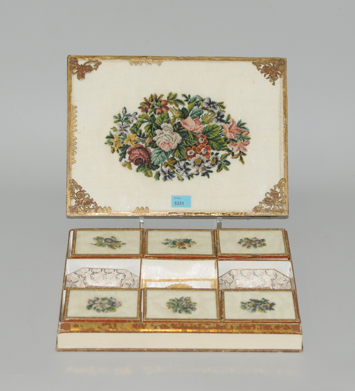 Um/Nach 1900. Rechteckiger Korpus aus weiss bzw. goldig bemaltem Karton. Abnehmbarer Deckel mit floraler Stickerei hinter Glas und ornamentalen Verzierungen aus goldfarbenem Papier. Darin 6 kleine Schatullen im gleichen Stil und 3 abgeteilte Fächer. 28x20,5x5,5 cm.
