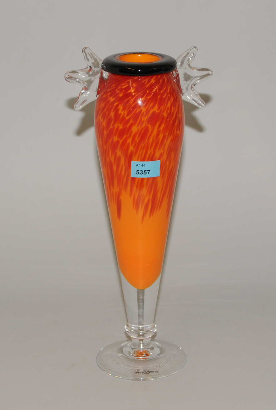 Strömbergshyttan, Sweden. 20.Jh. Farbloses Kristallglas, orange, rot und schwarz unterfangen. Applizierter Dekor am Lippenrand. Am Fussteller: "Strömbergshyttan AB. Studioglas. Sweden". H 28,5 cm.