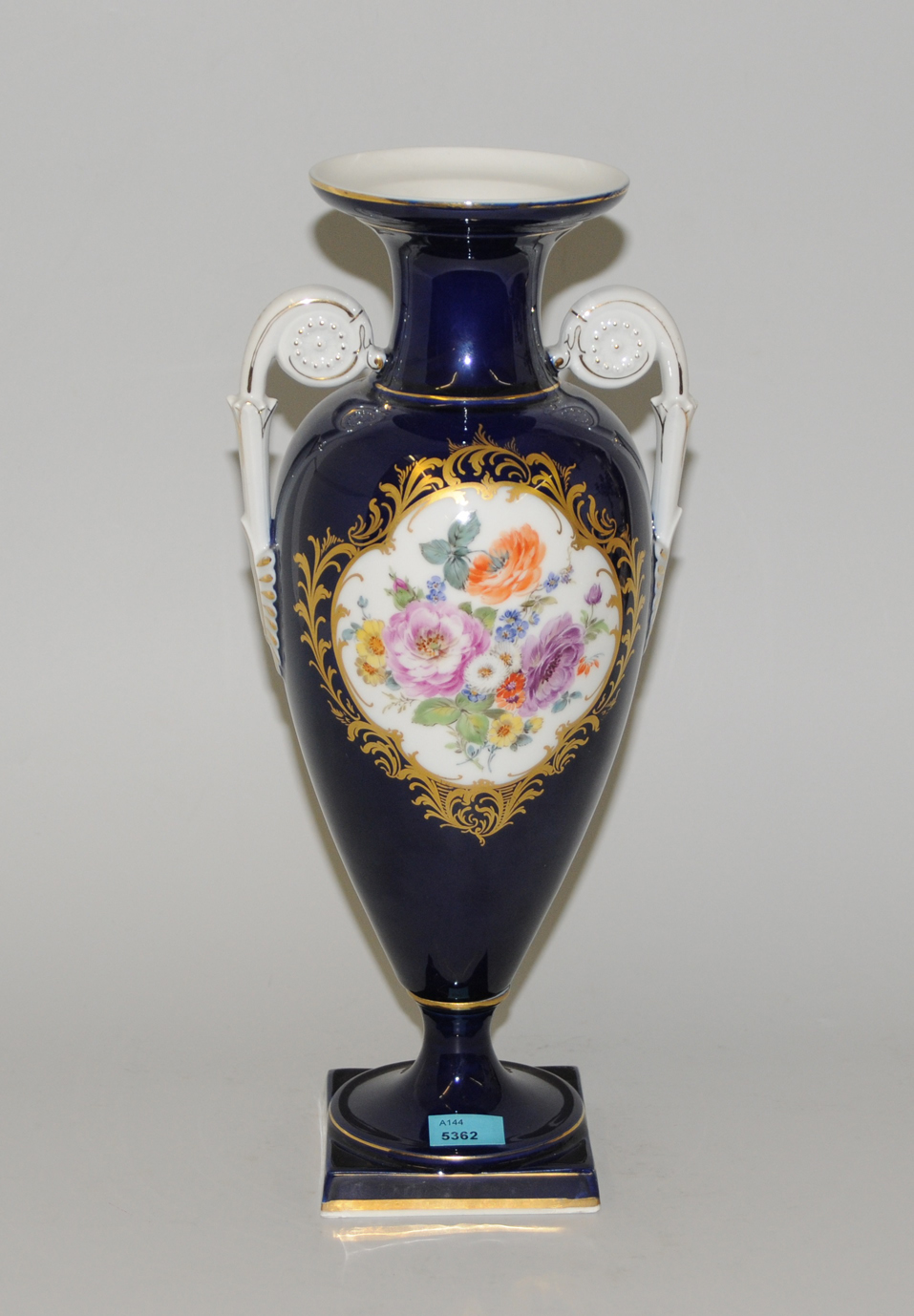 Meissen, 20. Jh. Porzellan, kobaltblauer Fond. Polychrome Blumenmalerei in passiger Reserve mit Goldstaffierung. H 34 cm.