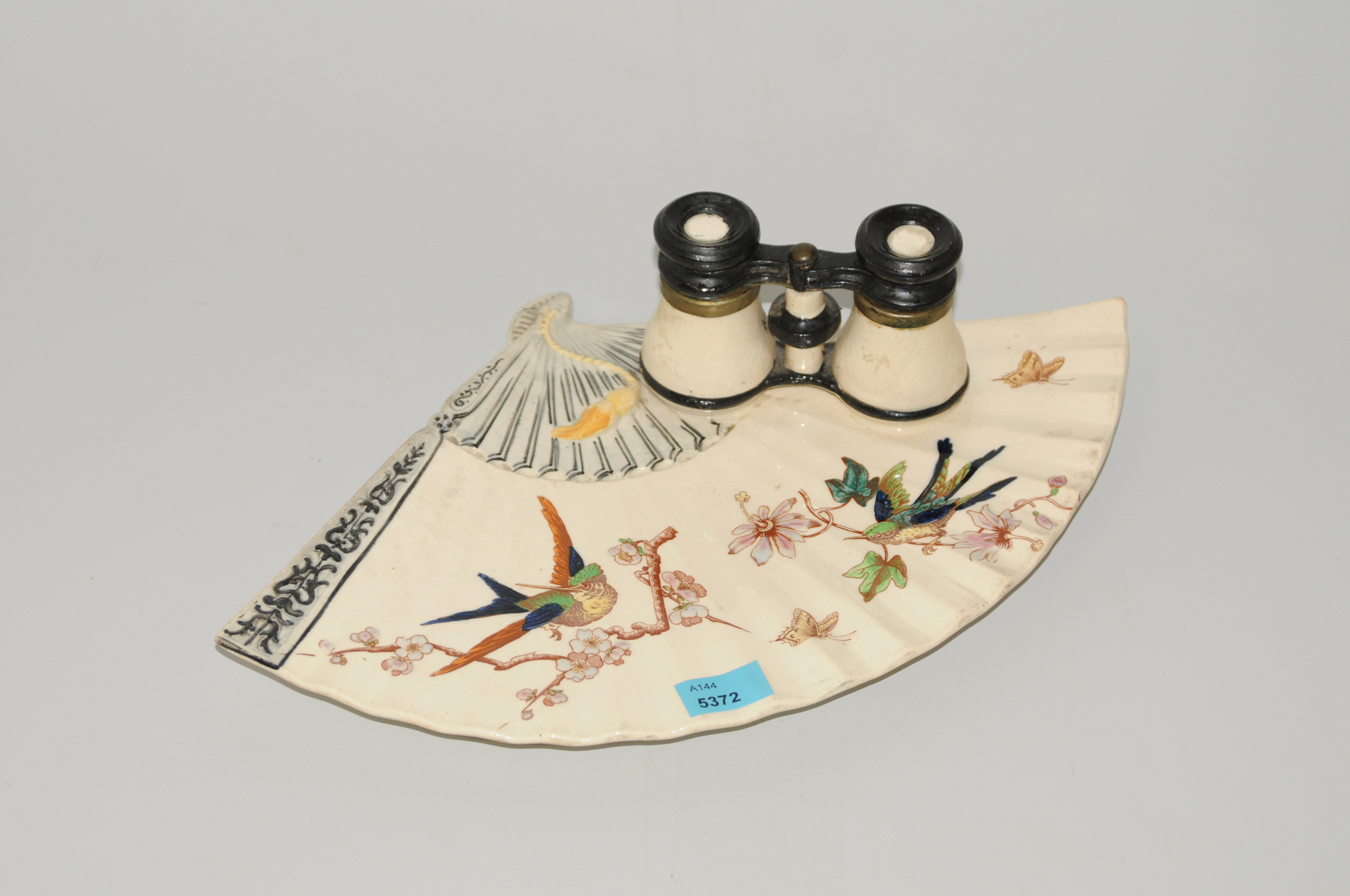 Um 1900. Frankreich. Keramik. Trompe-l’œil. Tintenfässchen mit scharniertem Deckel in Form eines Opernguckers. Auf einer Platte in Fächerform montiert. Polychrom übermalter Druckdekor mit ein Paar Vögel auf Blütenzweigen. Am Boden bezeichnet: "G. D. Paris. Depose". H (Fässchen) 6 bzw. L (Platte) 31 cm.