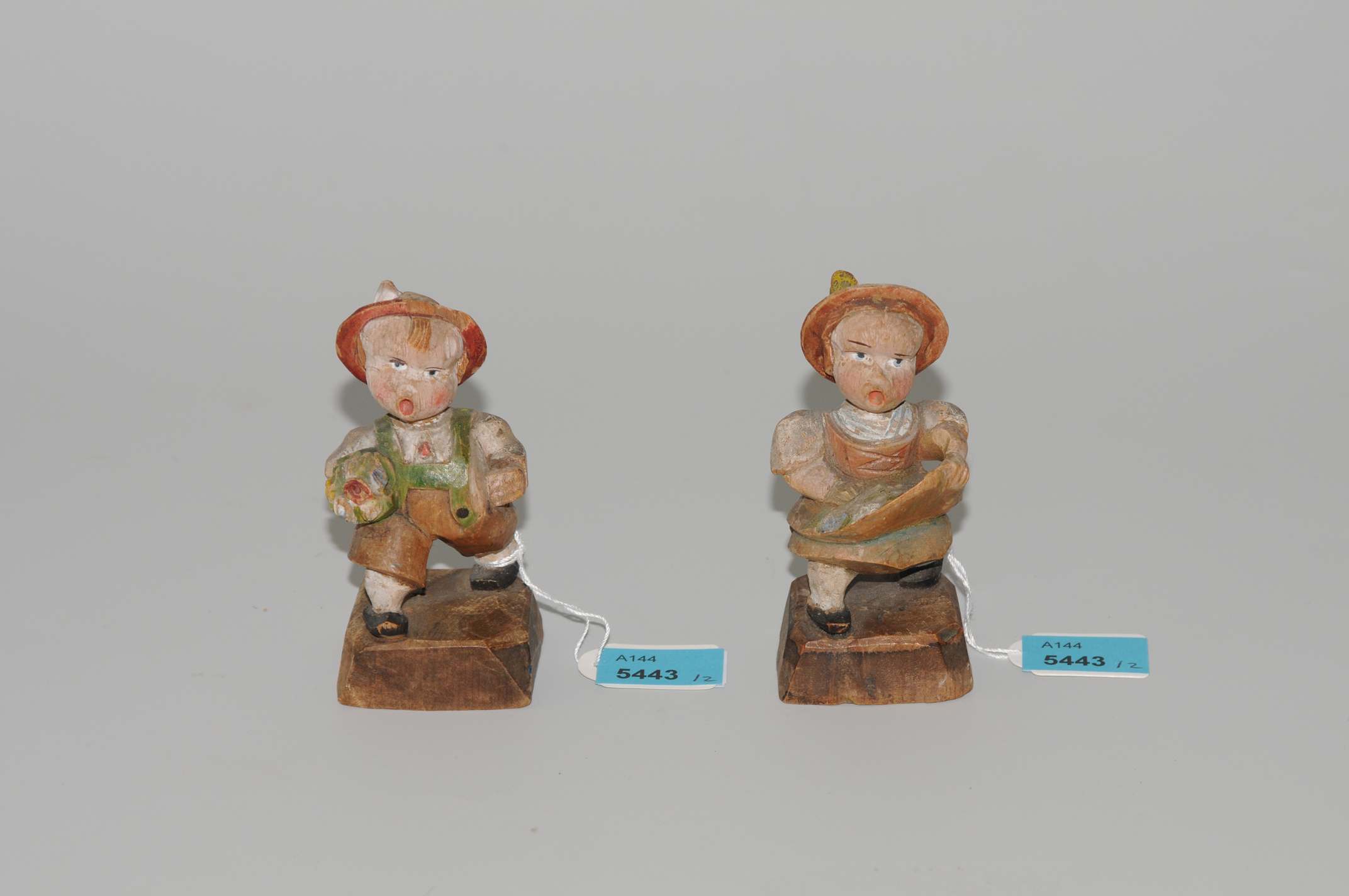 Brienz, um/nach 1900. Holz, geschnitzt und polychrom bemalt. Mädchen und Junge in Tracht. H 8,5 cm.