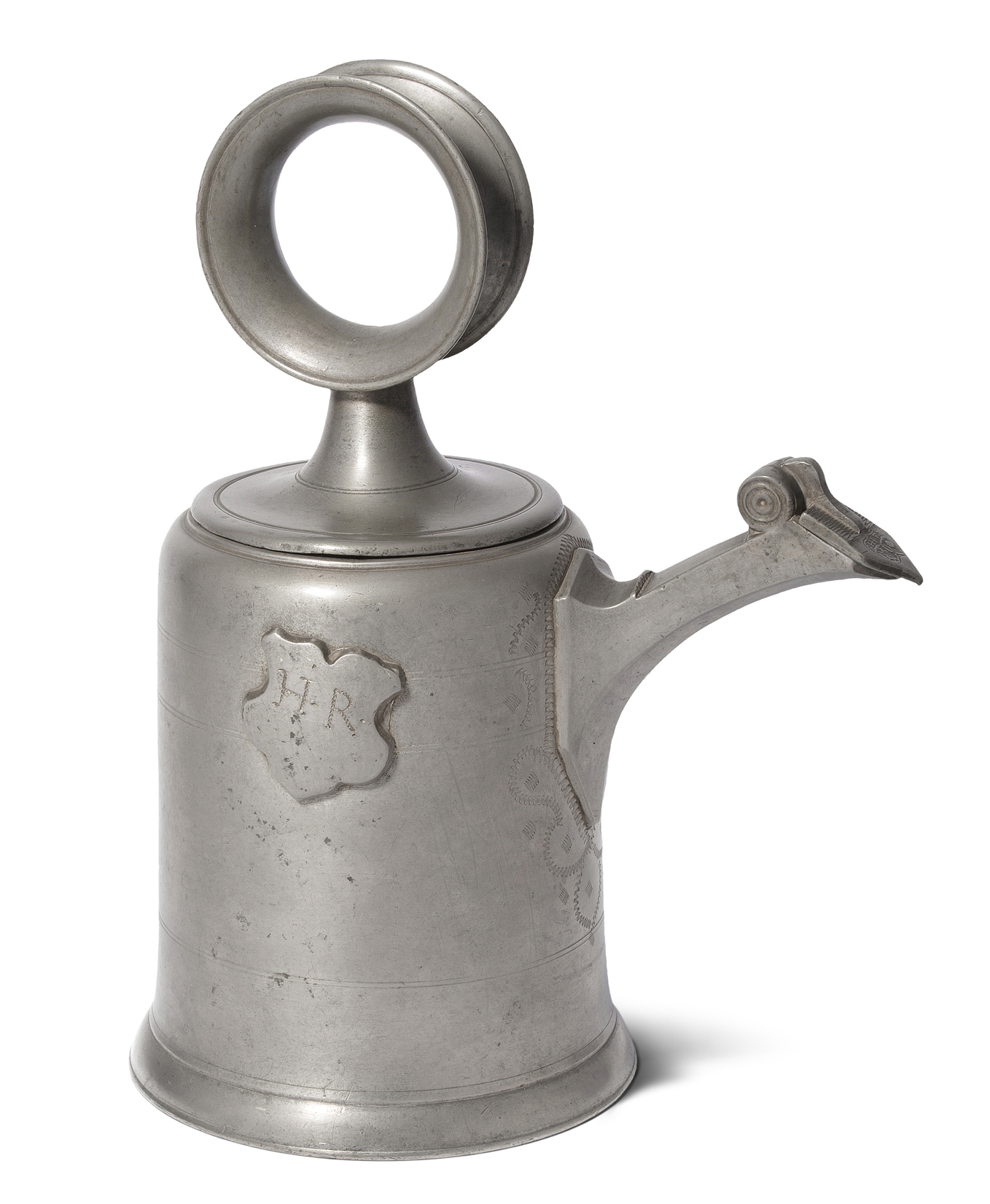Winterthur, um 1800. Zinn. Marke des Hans Heinrich Forrer (1748–1819). Ringhenkel mit Bajonettverschluss. Schild mit eingravierten Initialen "H R". Vorn ornamentale Gravuren. H 26 cm.