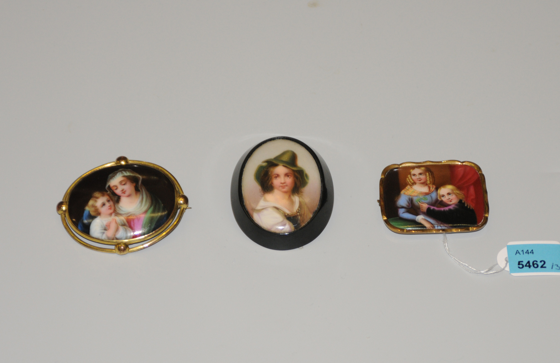 Um 1900. Porzellan/Metall/Kunststoff. Rechteck bzw. Ovalform. (1) Poträtminiatur einer jungen Dame mit Haube und Kind in Weissrock. (2) Poträtminiatur einer jungen Dame mit Lockenfrifeur und dem Knabe. (3) Poträtminiatur einer jungen Frau mit grünem Hut. L 6; 5 bzw. 5,5 cm.