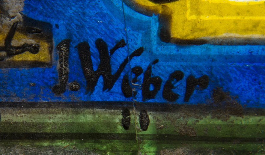 Schweiz, datiert 1674. Signiert "I.Weber". Jakob Weber II (1637–1685), Glasmaler aus dem Raum Zürich. Glas geätzt und polychrom bemalt. In Bleifassung. Mittelbild: Zwischen 2 Säulen die behelmten Wappen des Hans Heinrich bzw. des Georg Hagenbuch und ihrer Gemahlinnen. Oberlicht: Prophet Jesaja, umgeben von 3 Evangelisten-Symbolen sowie 3 Szenen zum Thema "Brunnen des Lebens". Kartusche mit Inschrift. Am Fuss 2 Inschriften und Jahreszahl. 30x20 cm. In Holzrahmen.