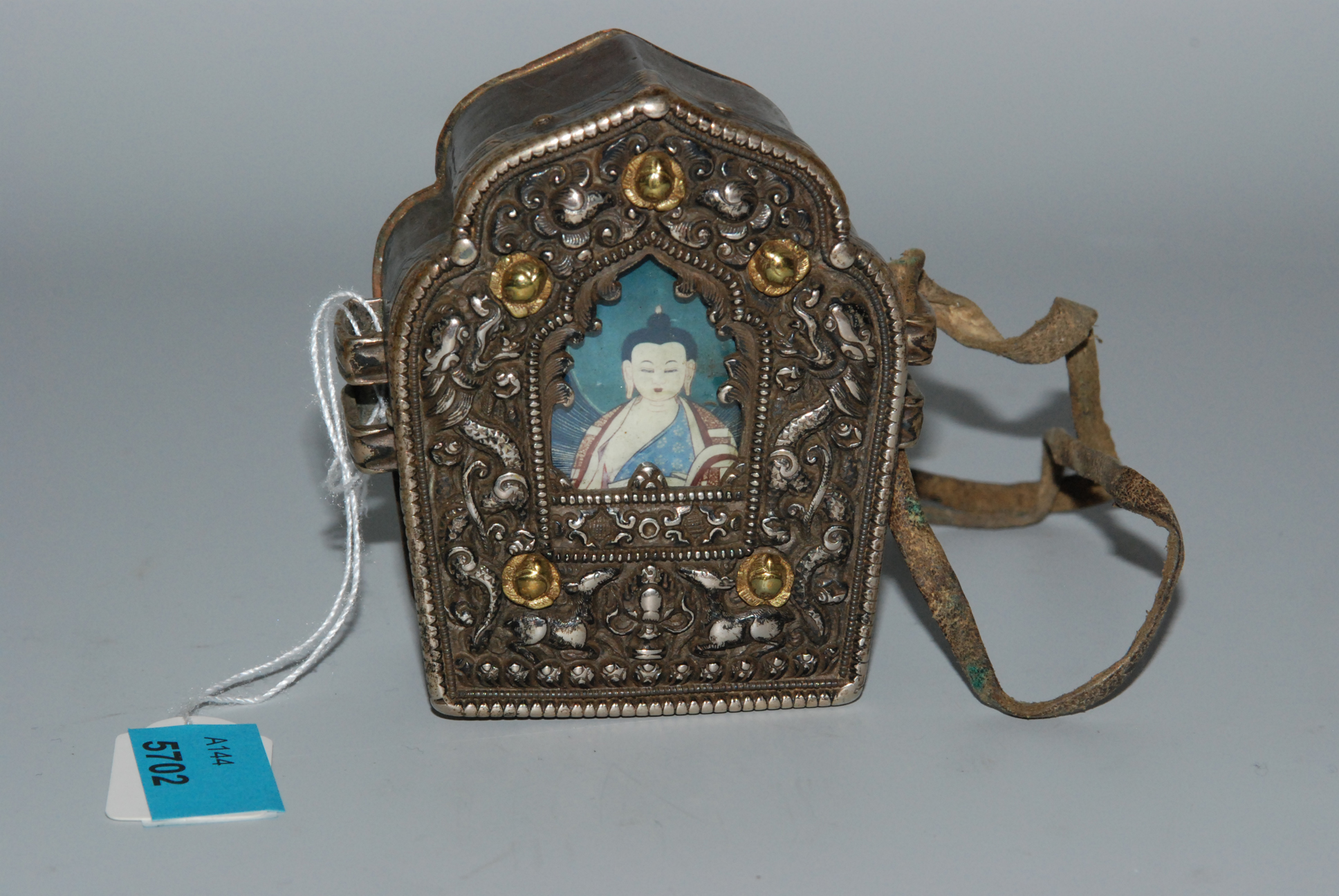 Tibet. Silber und Kupfer. Tragbarer Reiseschrein. Schauseite aus getriebenem Silber mit Drachendekor und mit "Fenster", dahinter eine Foto einer Abbildung von Buddha Shakyamuni. H 7,5, B 6 cm.