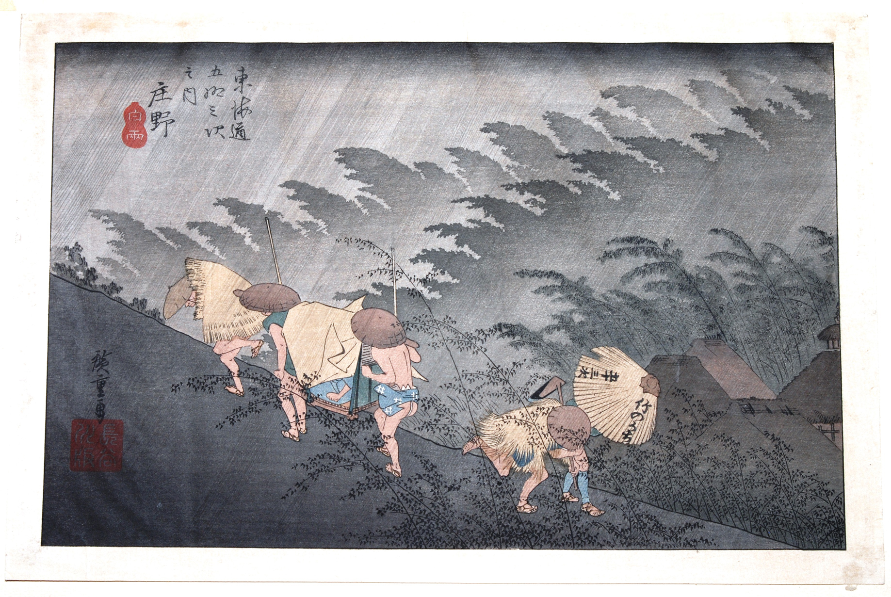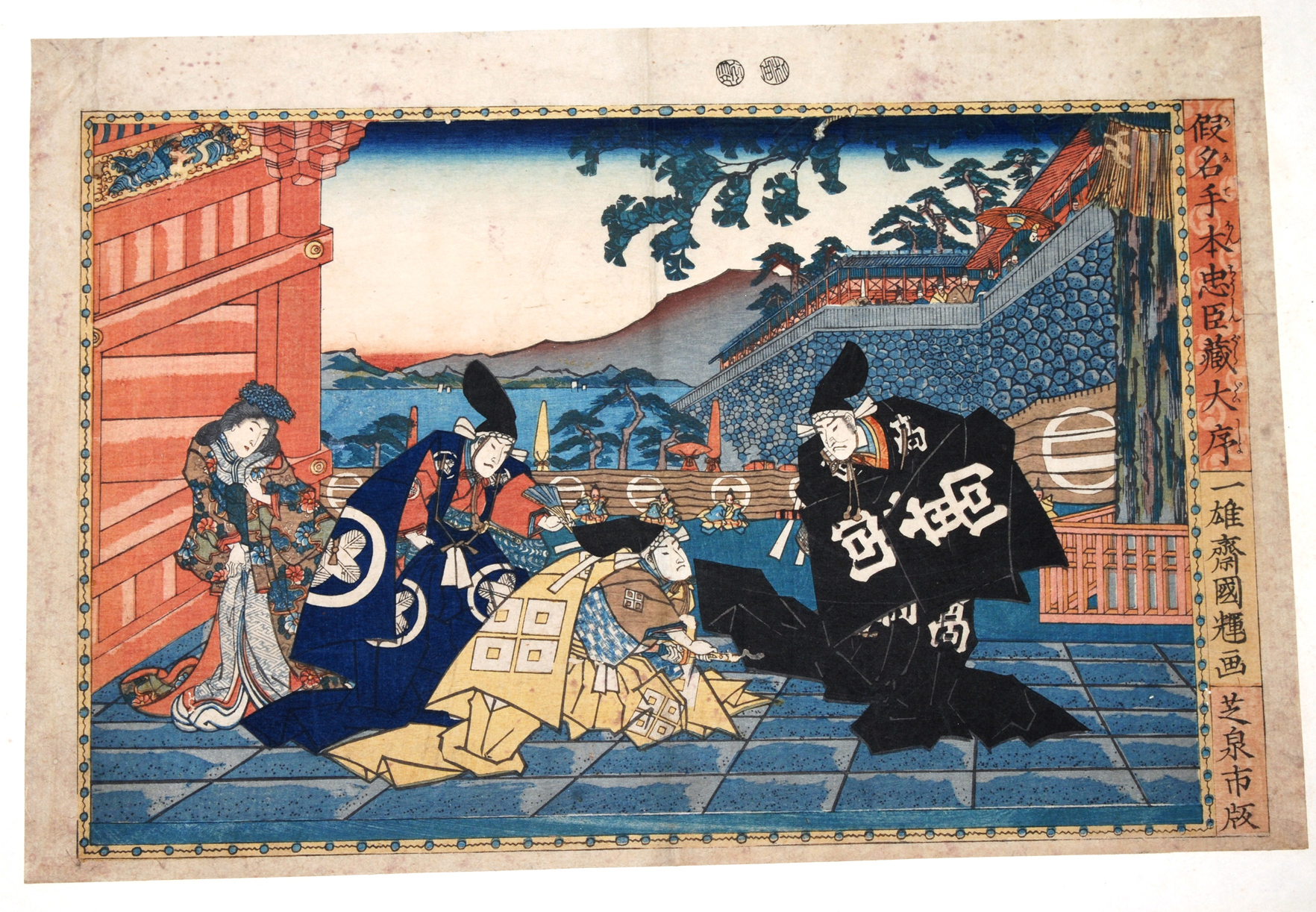 Japan. Utagawa Kuniteru. Aus der Serie "Kanadehon Chushingura Daijo". Ôban-Format. Stark gebräunt, Farbverlust. Mit Leim an den Ecken montiert. / Hiroshige. Nachdruck. Aus der Serie "Tôkaidô Gojûsan no Tsugi", betitelt "Shôno Hakuu". Ôban-Format. Mit Leim montiert.