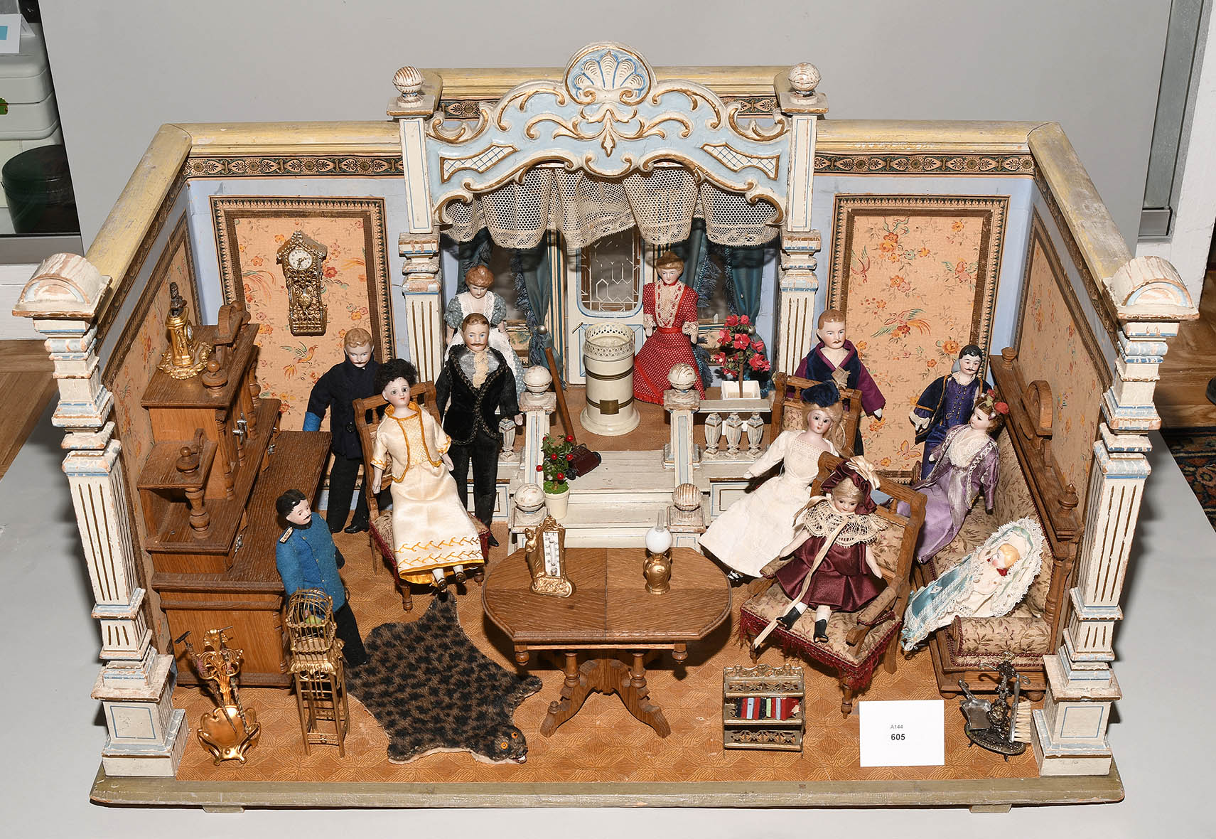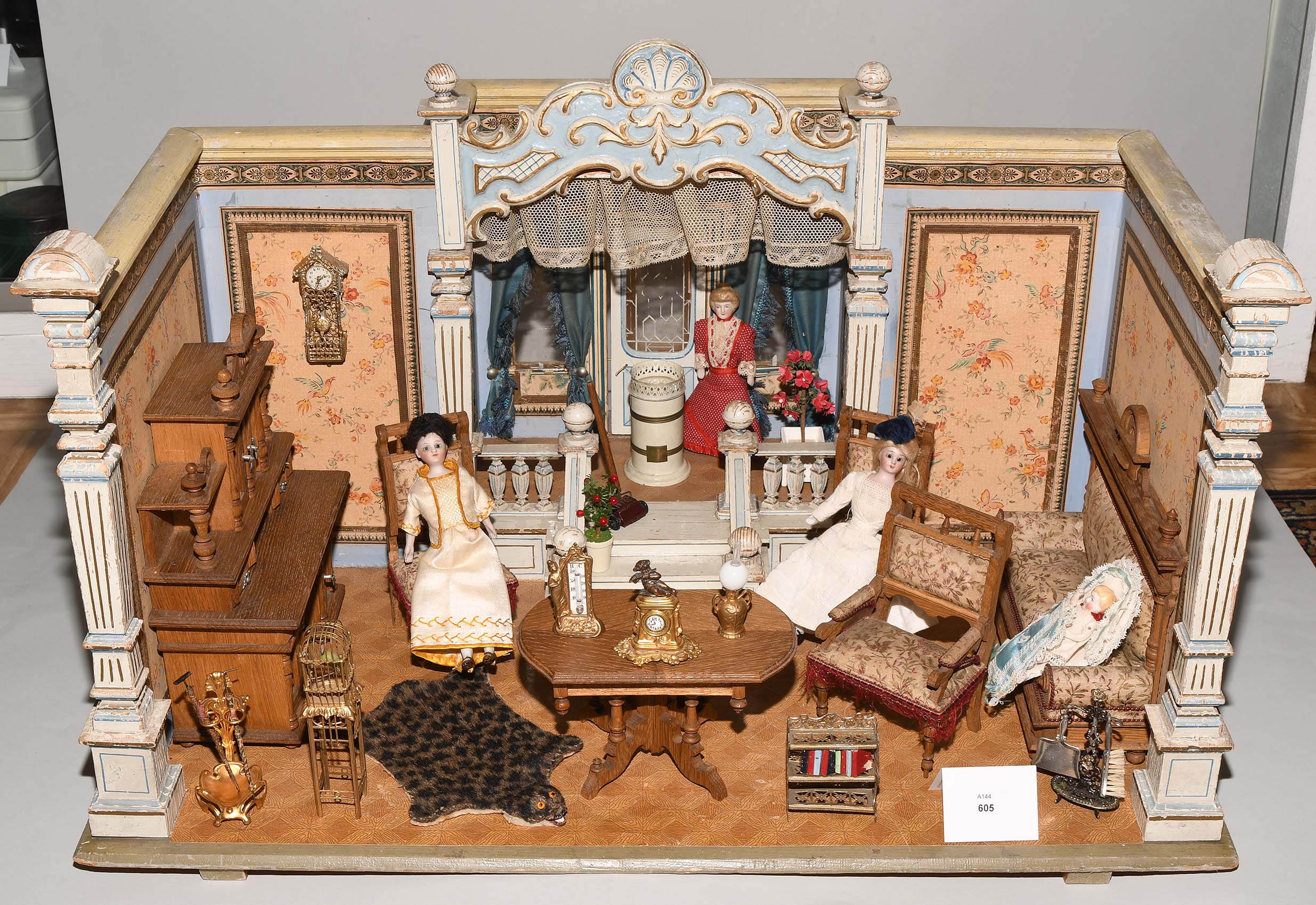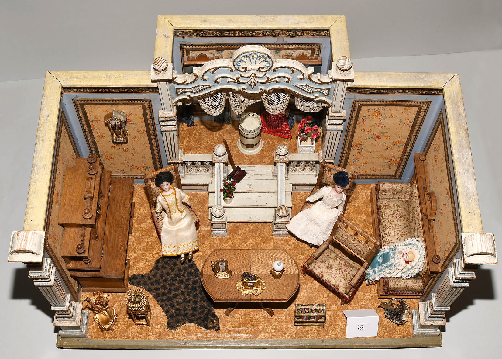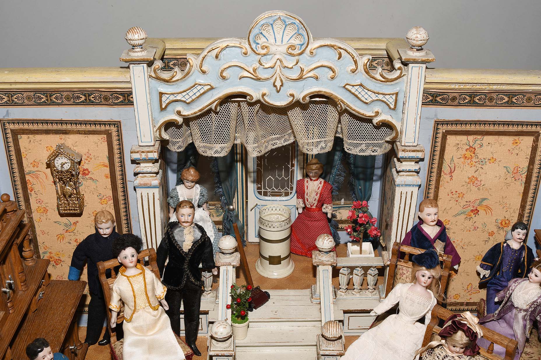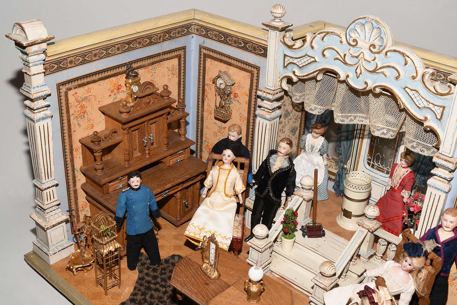 Deutschland, wohl Gottschalck, um 1910. Rechteckiges Holzgehäuse mit zentralem Erker. Aussen hellgelb bemalt. Innen tapeziert, Fussboden mit Parkett imitierender Tapete kaschiert. Treppenaufgang und Balustrade zum Erker mit Türe und 2 Fenstern. Reich bestückt mit Möbeln aus Holz (Schreibtisch mit Aufsatz, Tisch, Sofa, 1 Sessel, 2 Stühle), Zimmerofen und div. Einrichtungsgegenständen aus Metall (Uhr, Thermometer, vergoldeter Schirmständer, Vogelbauer, Büchergestell etc.). 12 Stubenpuppen mit Köpfen aus Biscuit-Porzellan. 66x44x40 cm.