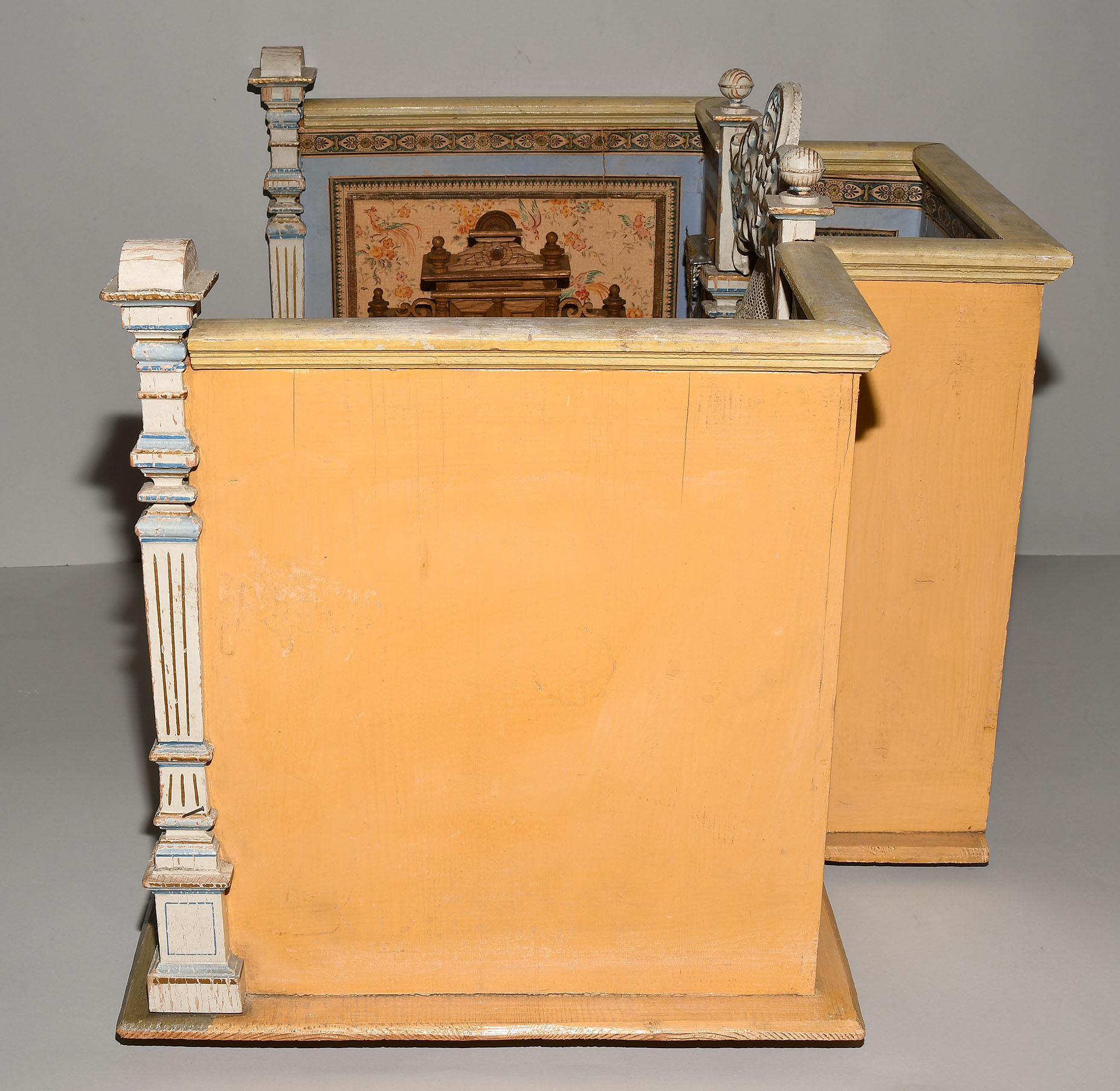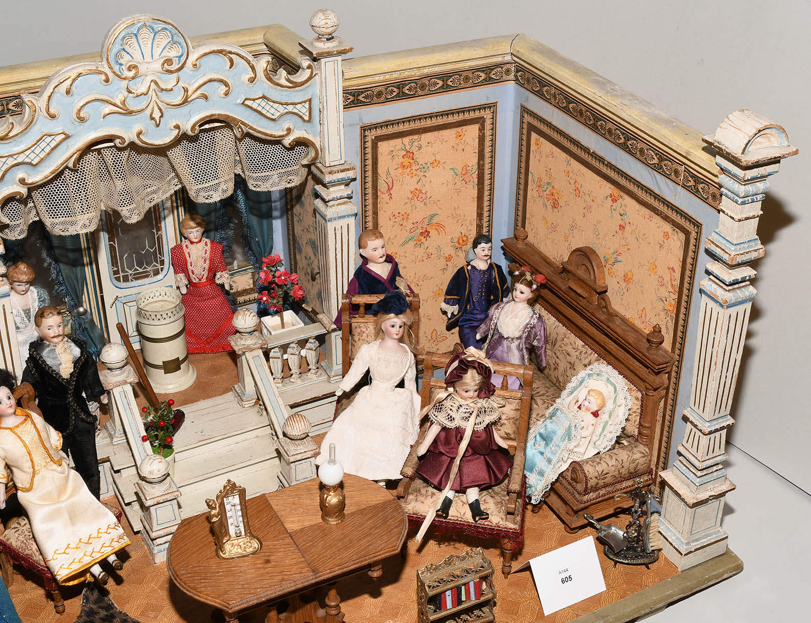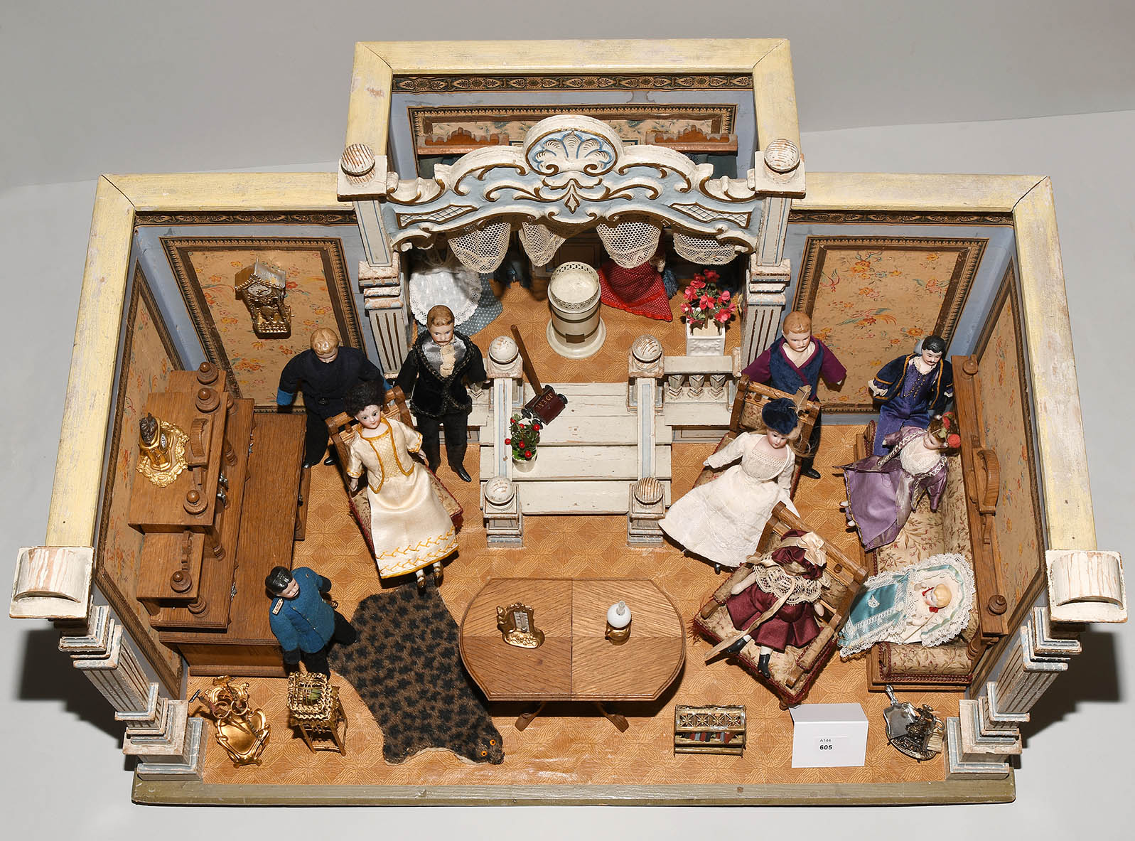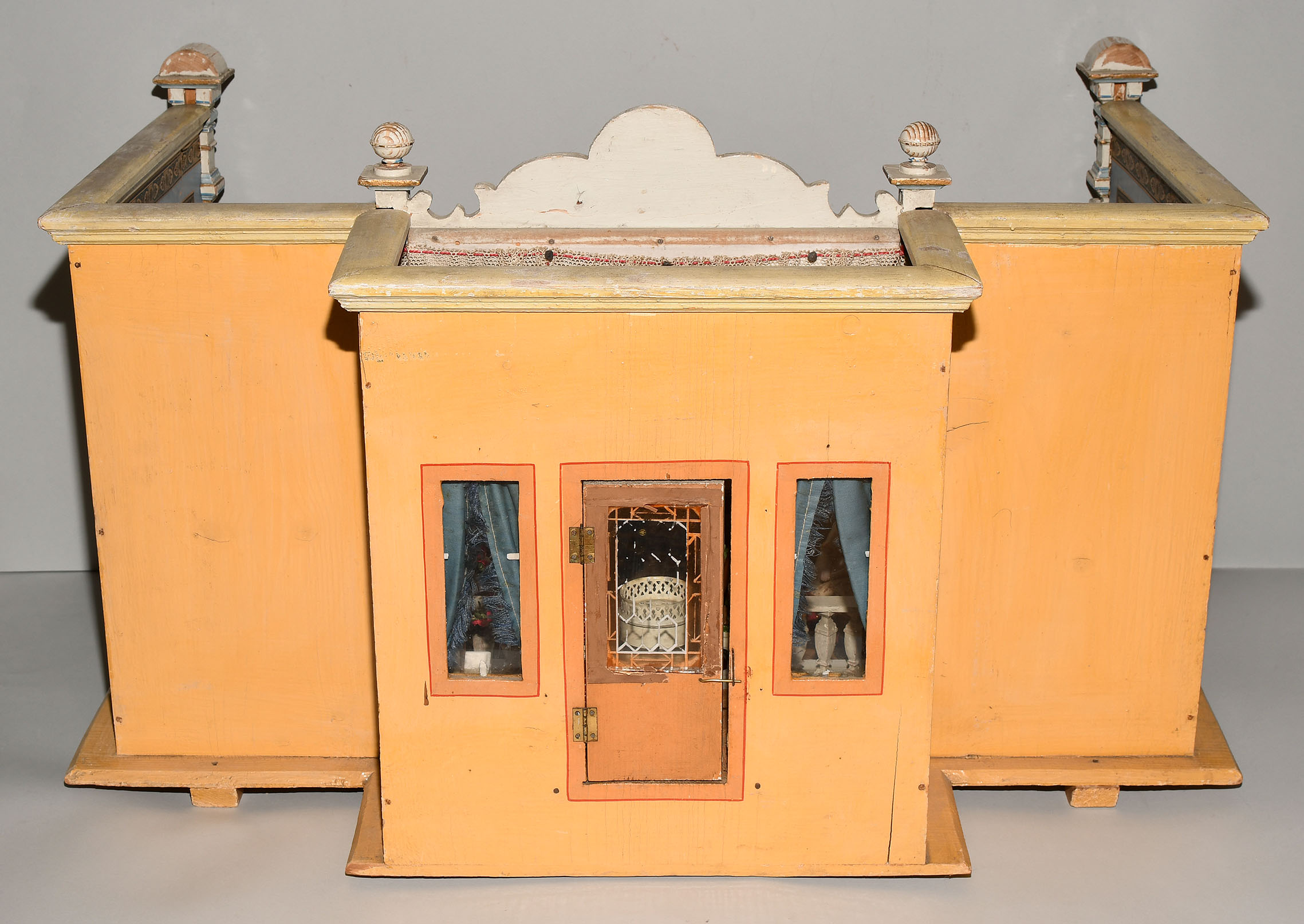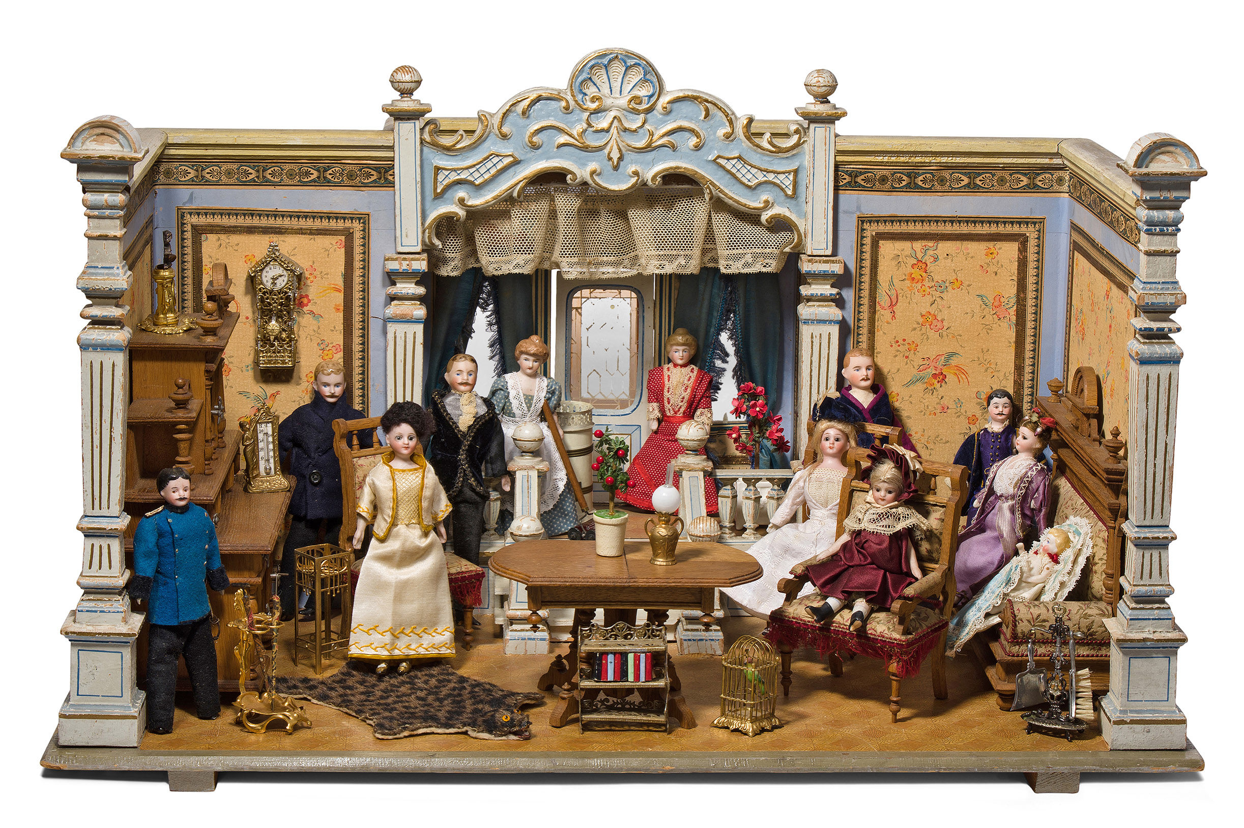 Deutschland, wohl Gottschalck, um 1910. Rechteckiges Holzgehäuse mit zentralem Erker. Aussen hellgelb bemalt. Innen tapeziert, Fussboden mit Parkett imitierender Tapete kaschiert. Treppenaufgang und Balustrade zum Erker mit Türe und 2 Fenstern. Reich bestückt mit Möbeln aus Holz (Schreibtisch mit Aufsatz, Tisch, Sofa, 1 Sessel, 2 Stühle), Zimmerofen und div. Einrichtungsgegenständen aus Metall (Uhr, Thermometer, vergoldeter Schirmständer, Vogelbauer, Büchergestell etc.). 12 Stubenpuppen mit Köpfen aus Biscuit-Porzellan. 66x44x40 cm.
