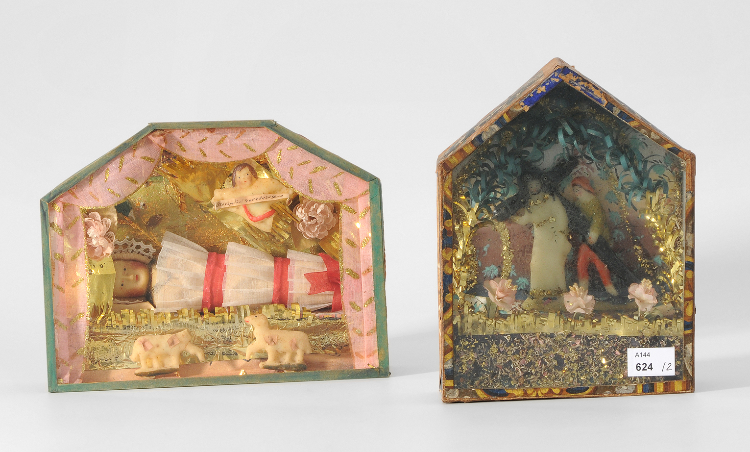 Alpenländisch, 19.Jh. Kästchen aus Pappe, mit Buntpapier kaschiert. (1) Hintergrund als Felsnische gestaltet, eingefasst von Fransenborte aus Goldfolie. Fatschenkind mit Kopf aus Wachs. H 15 cm. (2) Hintergrund als Altar gestaltet. Bemalte Wachsbossierung des kreuztragenden Christus. H 18 cm.