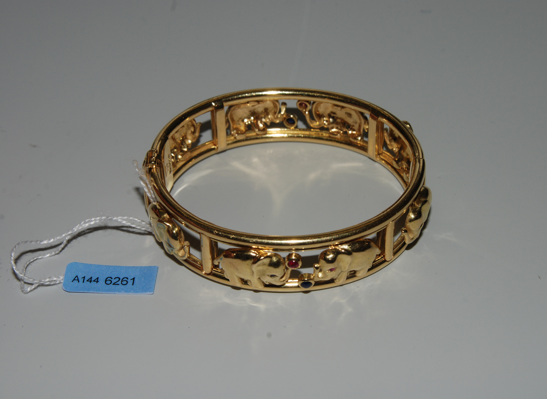 Heiden München. 750 Gelbgold. Bewegliche Elefanten mit kleinen Rubinen und Saphiren. L 17 cm, 82,2 g.