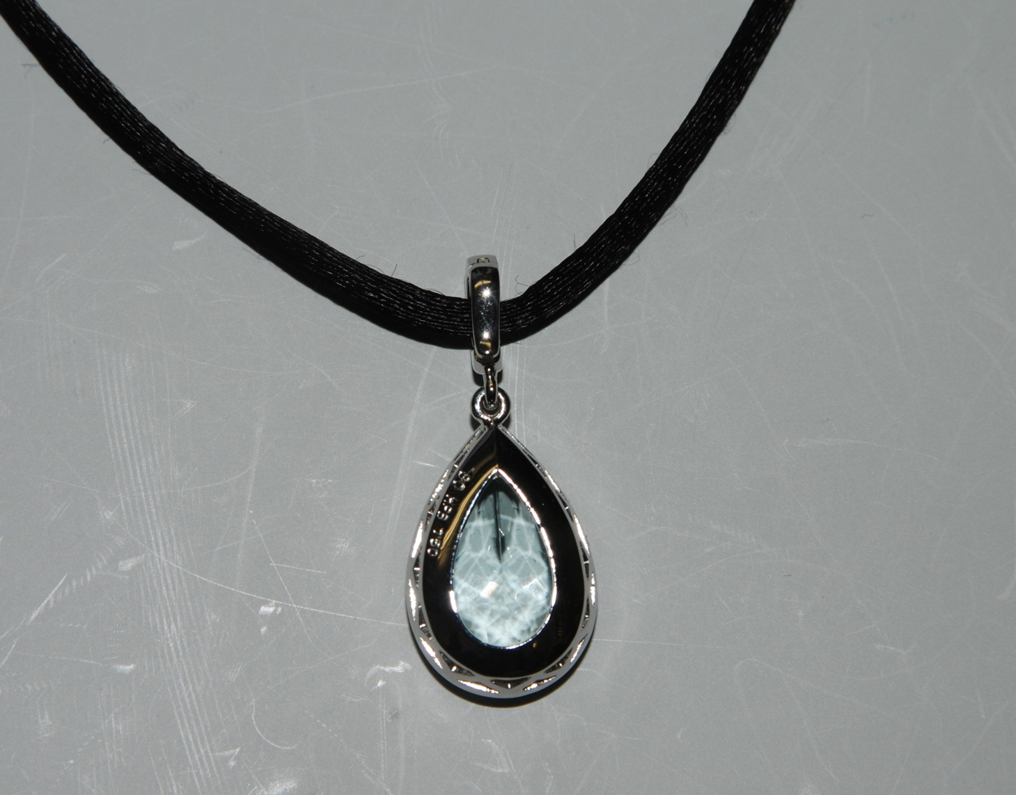 750 Weissgold/925 Silber. 1 Aquamarin-Tropfen ca. 5.70 ct und 38 Brillanten zus. ca. 0.38 ct, L 3,1 cm. Stoffcollier mit Silberschliesse L 41cm, 6,9 g. Neuwertig.