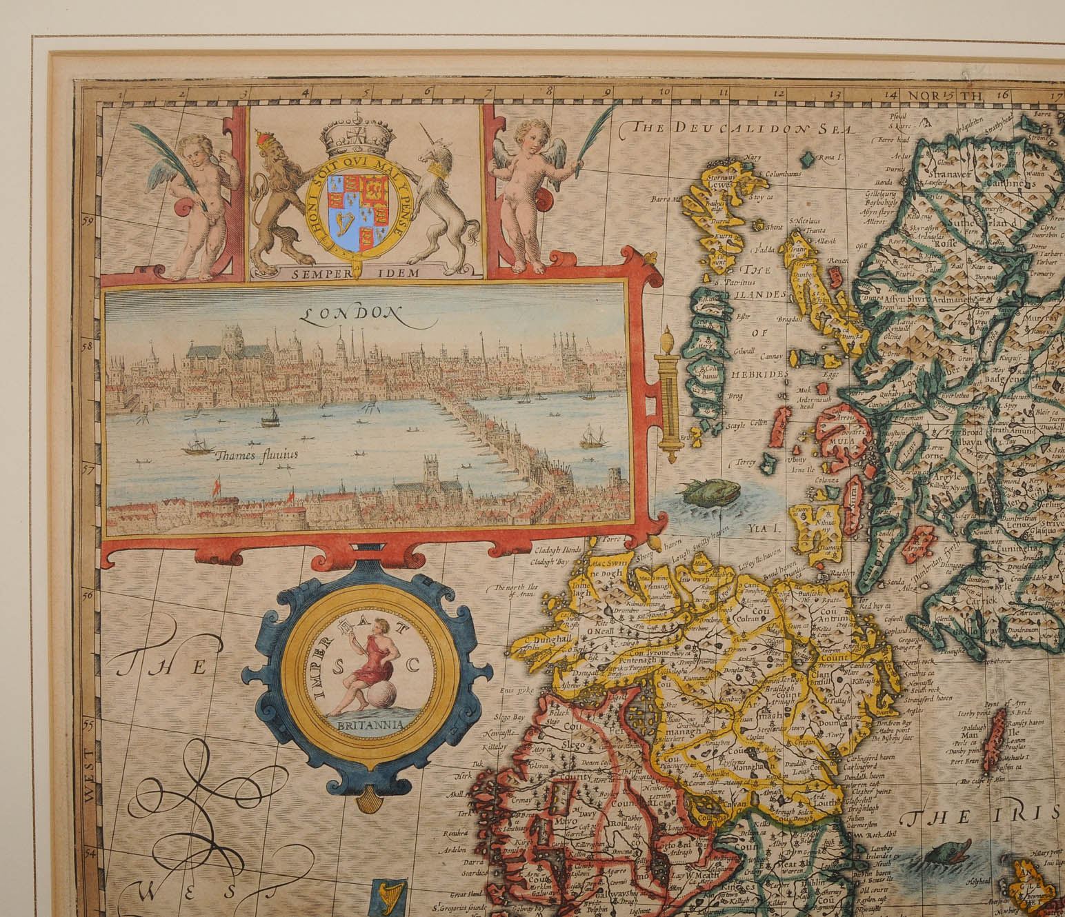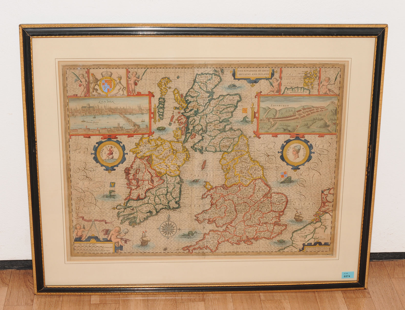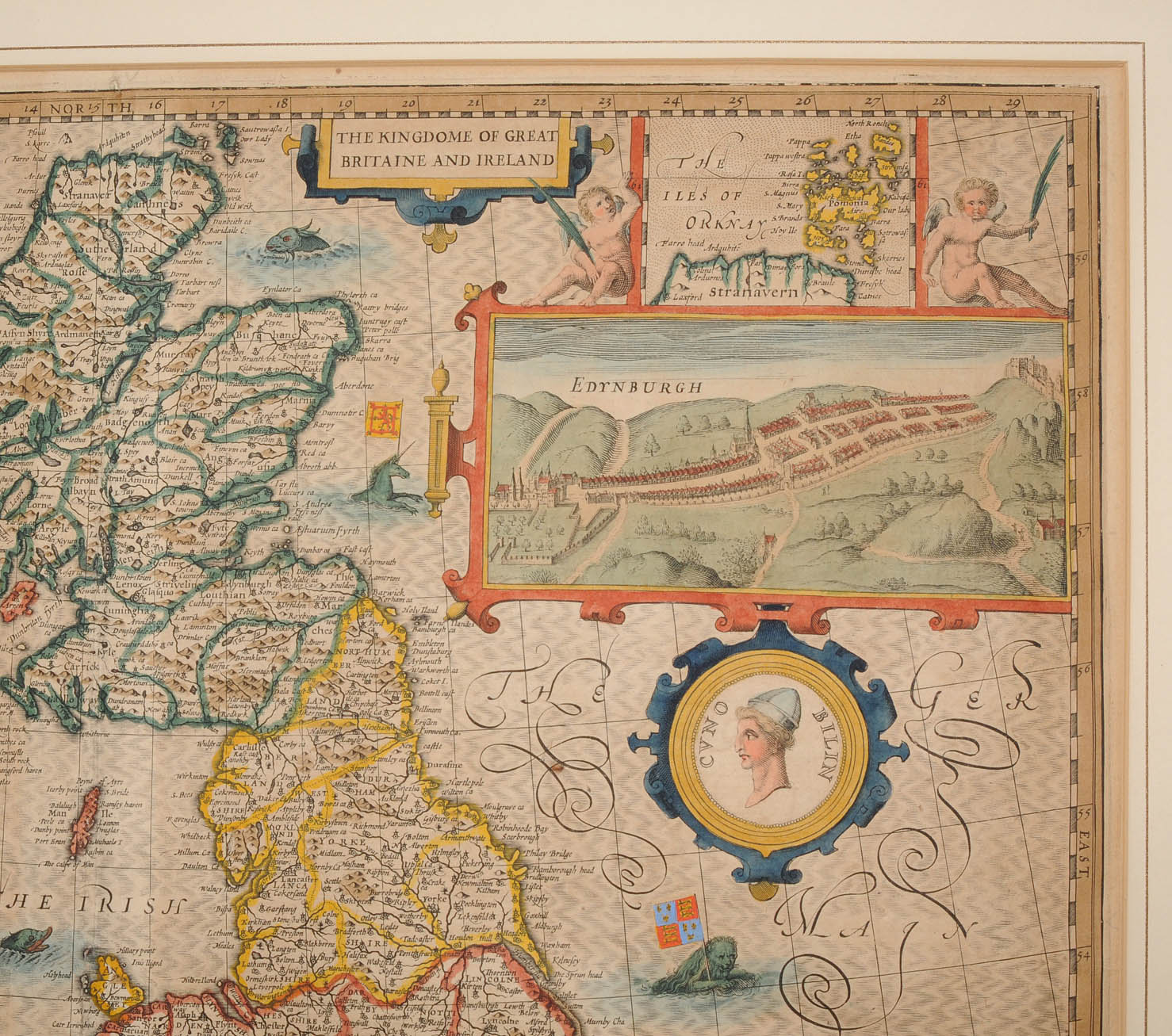 The Kingdome of Great Britaine and Irland. Kol. Kupferstichkarte, mit ausgem. Rollwerk- und Wappenkartuschen, kol. Ansichten von London und Edinburgh u. kleiner, kol. Nebenkarte der Orkneyinseln, von J. Hondius für J. Speed's "Theatre of the Empire of Great Britain", hrsg. v. John Sudbury & George Humble, 1611/12. 37,8x51,3 cm. Gerahmt.