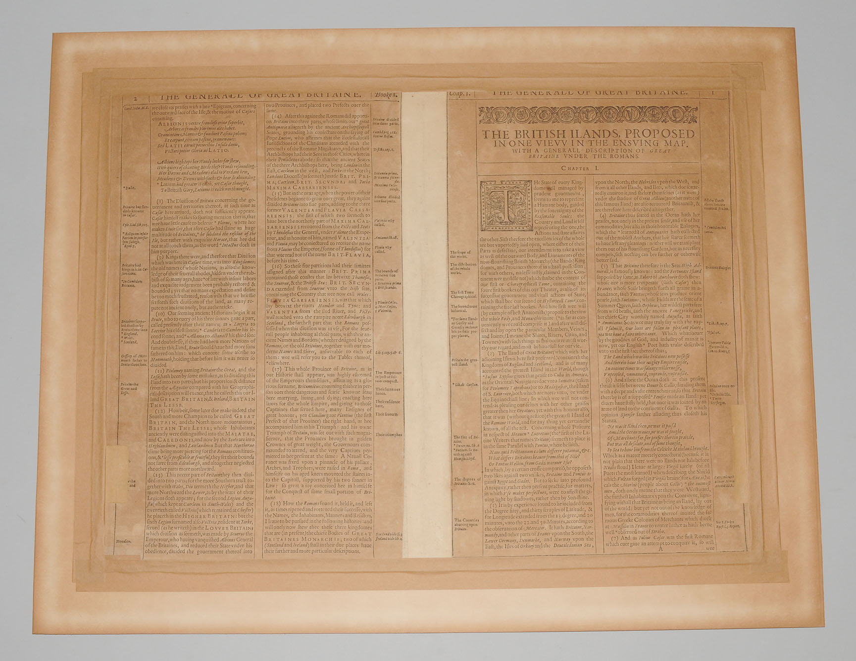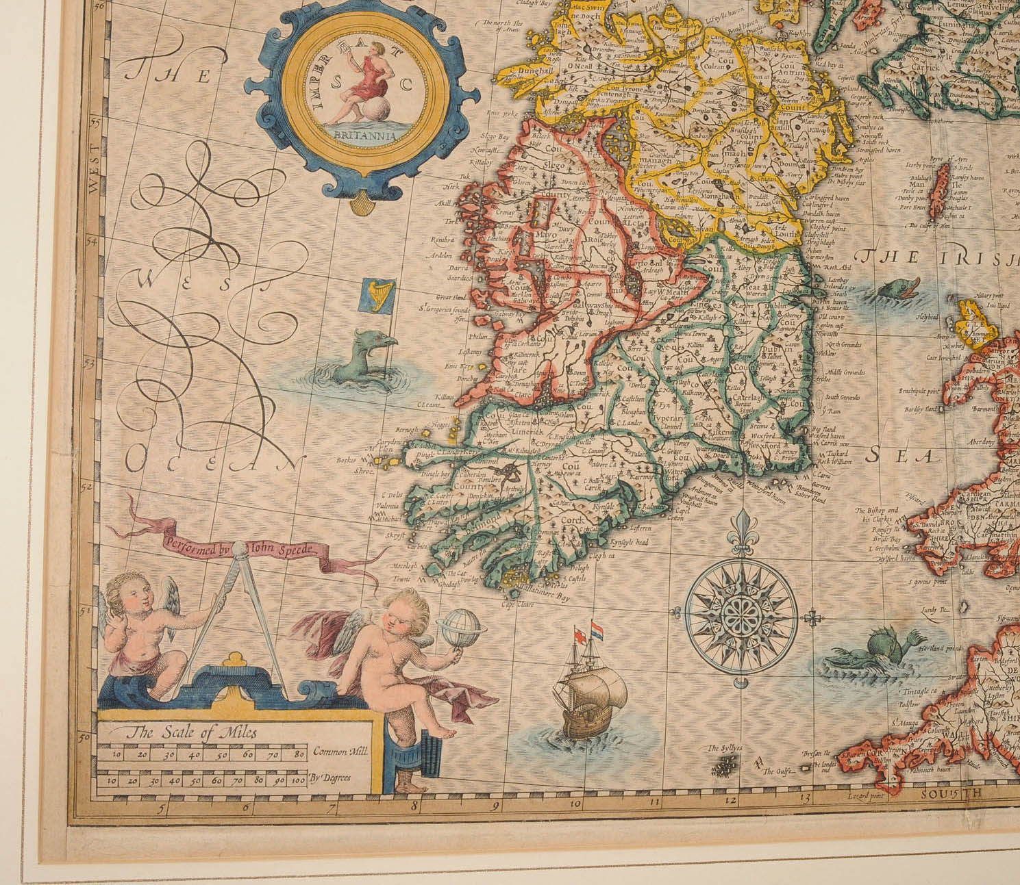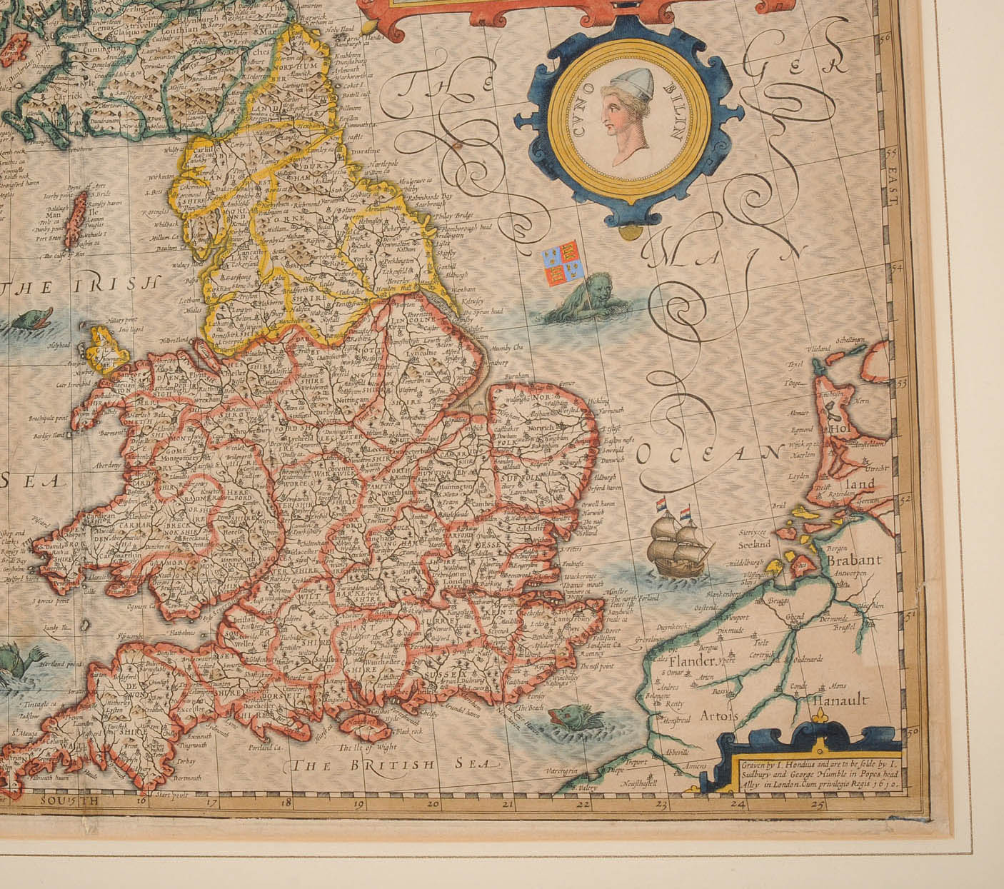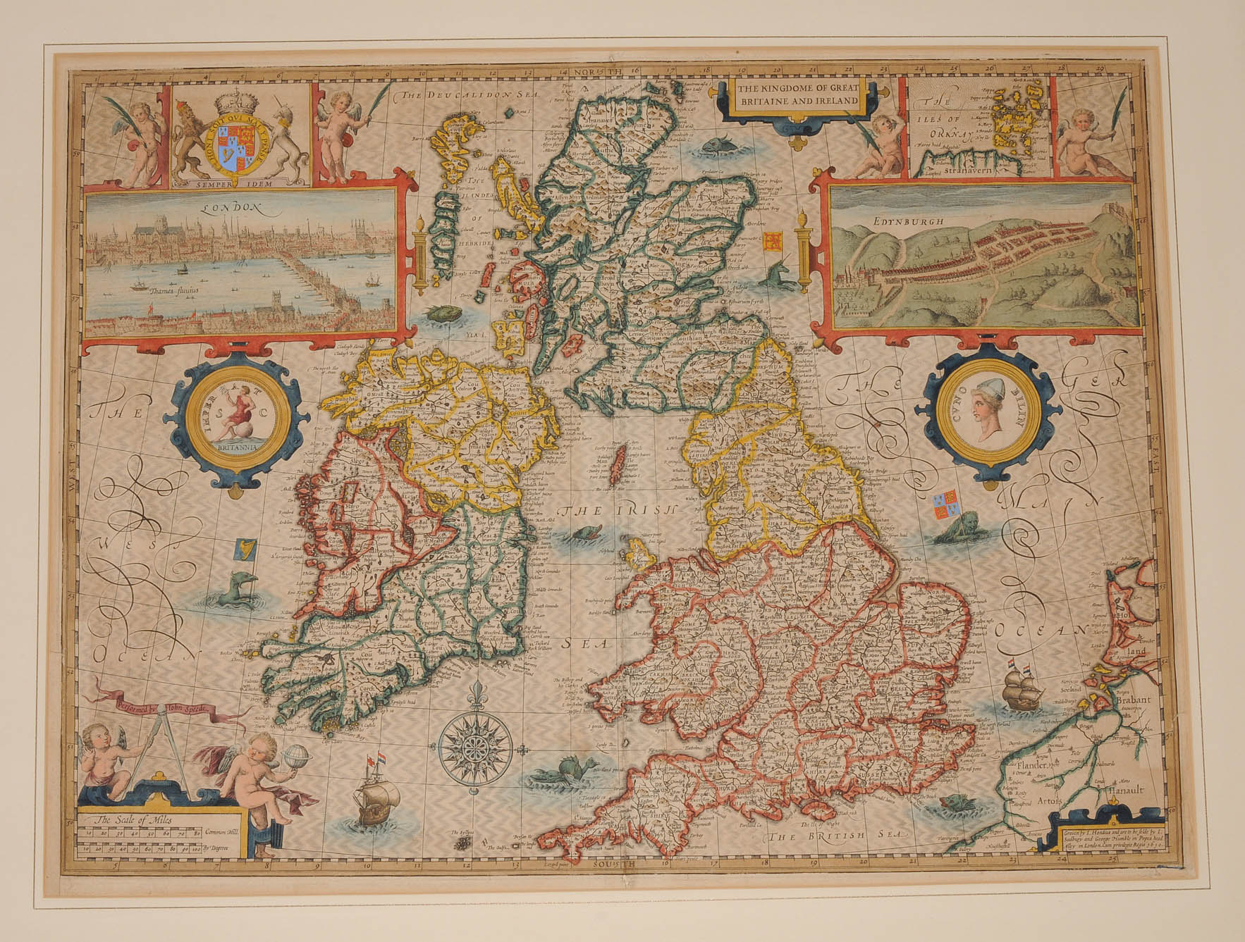 The Kingdome of Great Britaine and Irland. Kol. Kupferstichkarte, mit ausgem. Rollwerk- und Wappenkartuschen, kol. Ansichten von London und Edinburgh u. kleiner, kol. Nebenkarte der Orkneyinseln, von J. Hondius für J. Speed's "Theatre of the Empire of Great Britain", hrsg. v. John Sudbury & George Humble, 1611/12. 37,8x51,3 cm. Gerahmt.