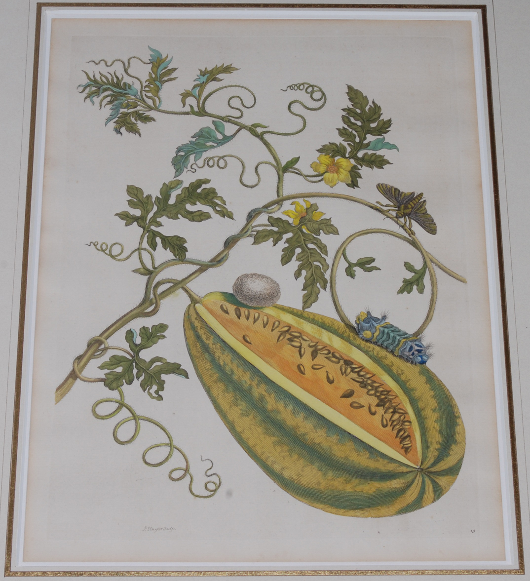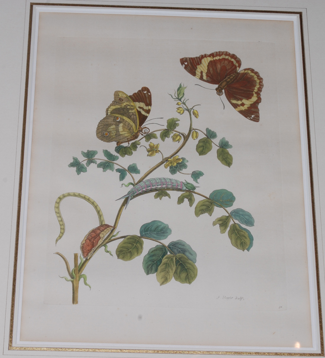 2 kol. Kupferstiche aus dem Werk "Metamorphosis Insectorum Surinamensium", Amsterdam 1730. Blatt 15 u. 32 von P. Sluyter. Plattengrösse je ca. 37x26,5 cm. Gerahmt.