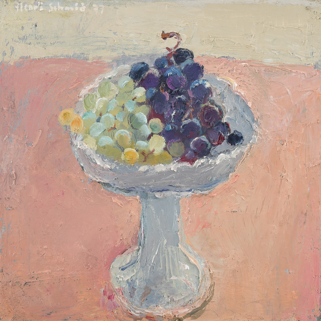 Stillleben mit weissen und blauen Trauben, 1977. Öl auf Leinwand. Oben links signiert und datiert. 33x33 cm.