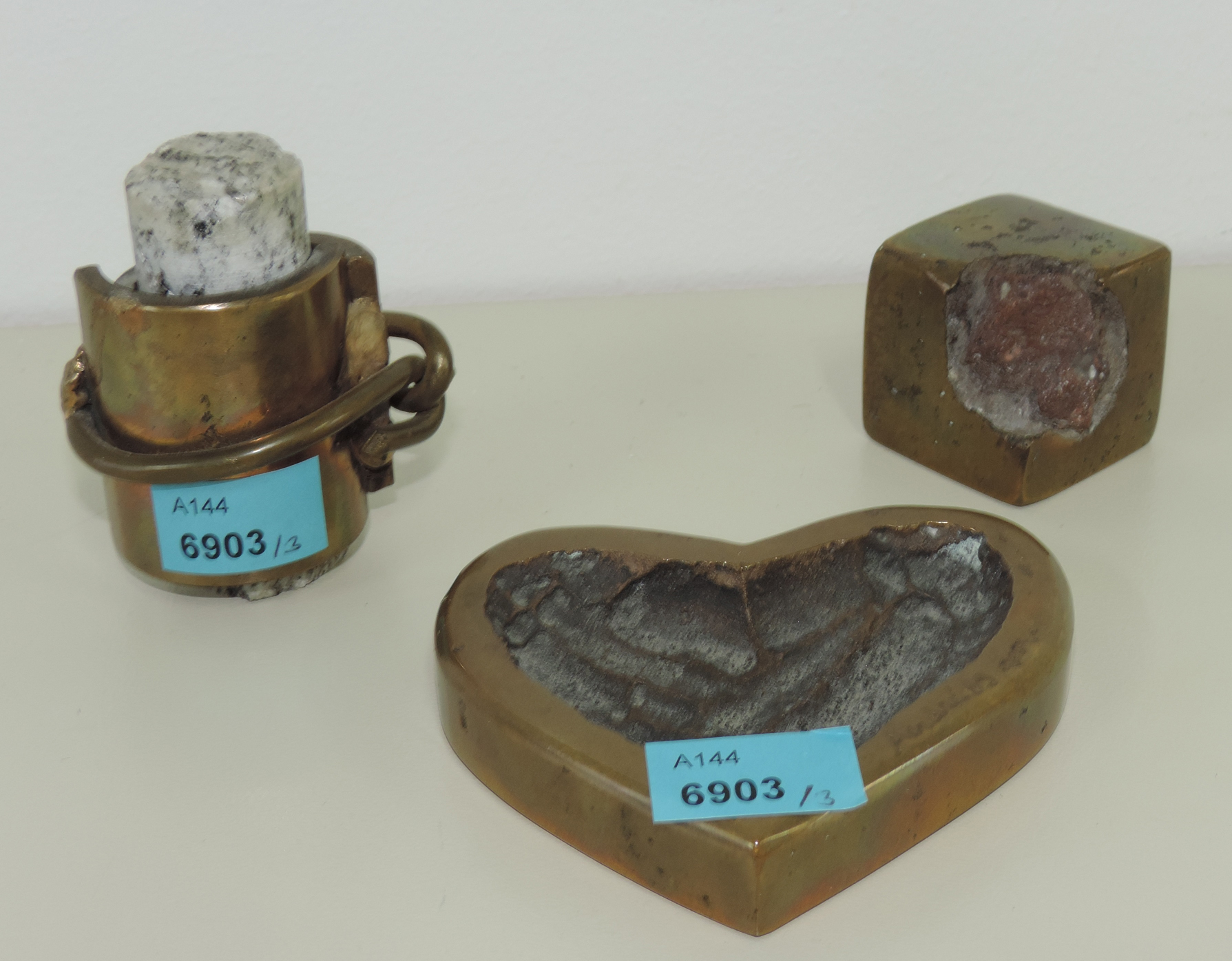 Lot 3 Bronzen. Herz, Würfel (mit Lava) und Säule (mit Stein). Herz datiert 1989. Alle drei signiert. 1,5x8,5x8; 3,5x3,5x3,5 und 6,5x4x6 cm.