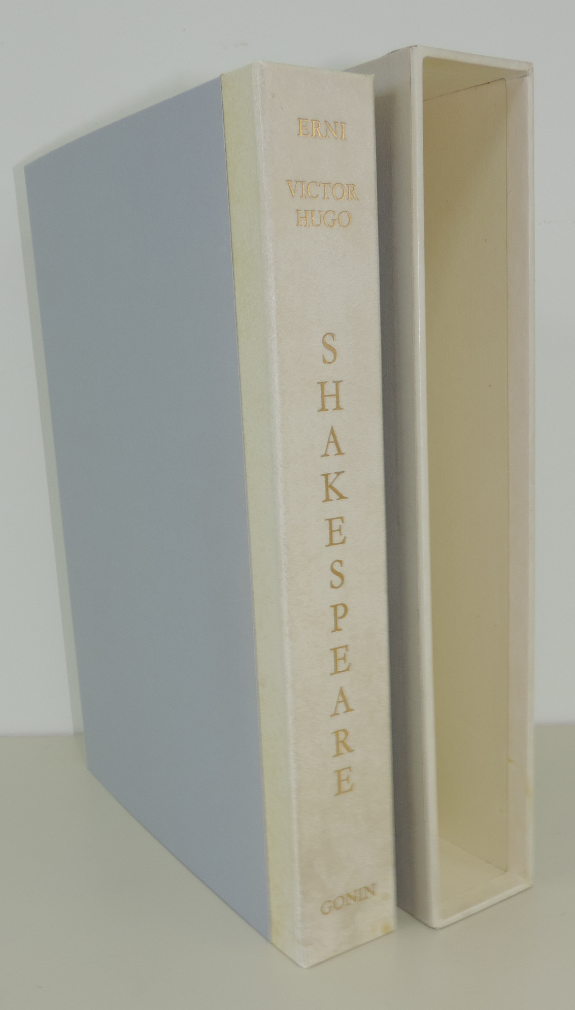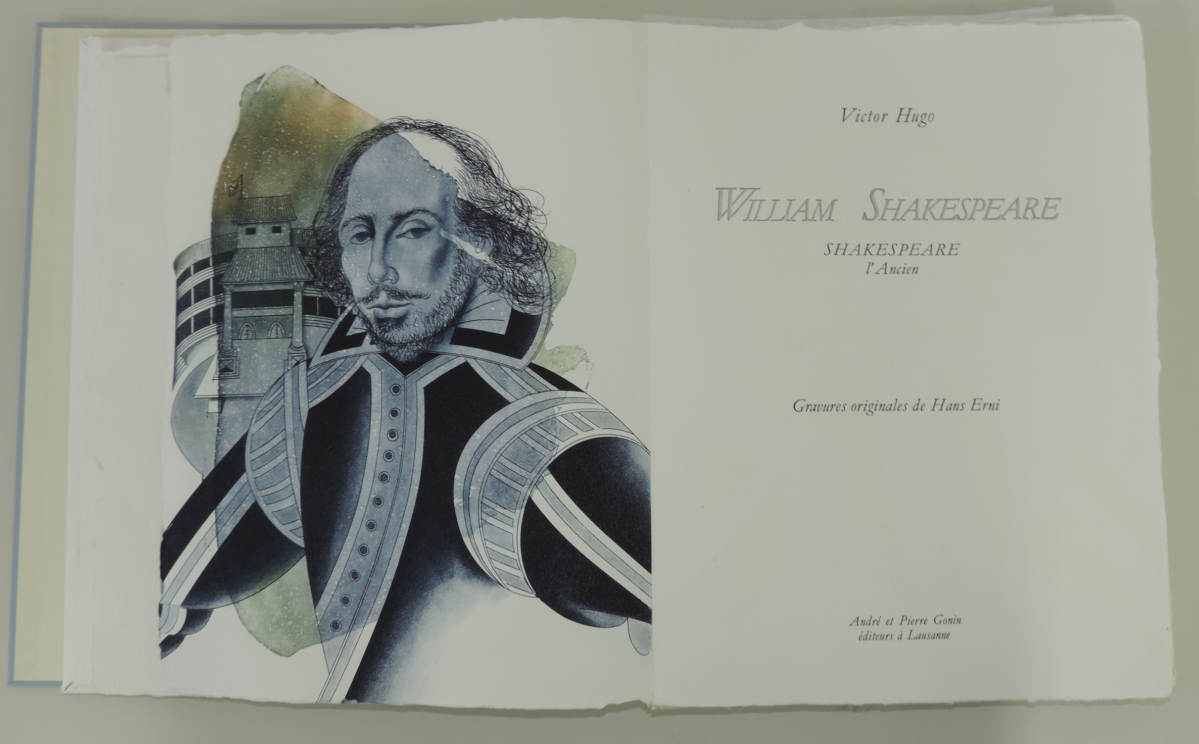 "William Shakespeare". Text: Victor Hugo. André & Pierre Gonin. Lausanne. 1976. Ex. 49 (v. 160). Mit 10 Radierungen. Mit Gefälligkeitszeichnung. Quart. In Schuber.