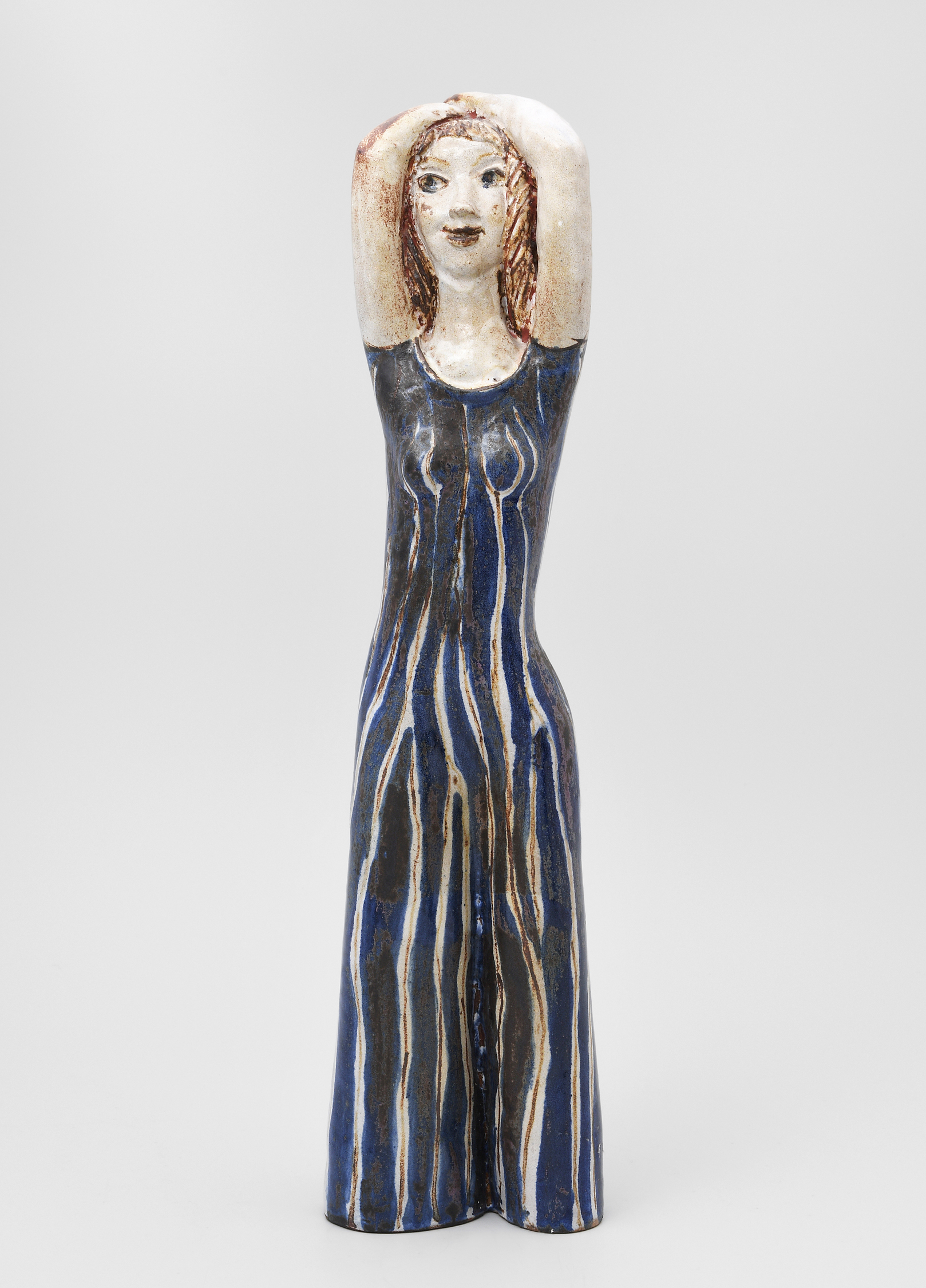 Grosse Stehende. Keramik, blau-braun bemalt. Bezeichnet: Geiger. H 48 cm.