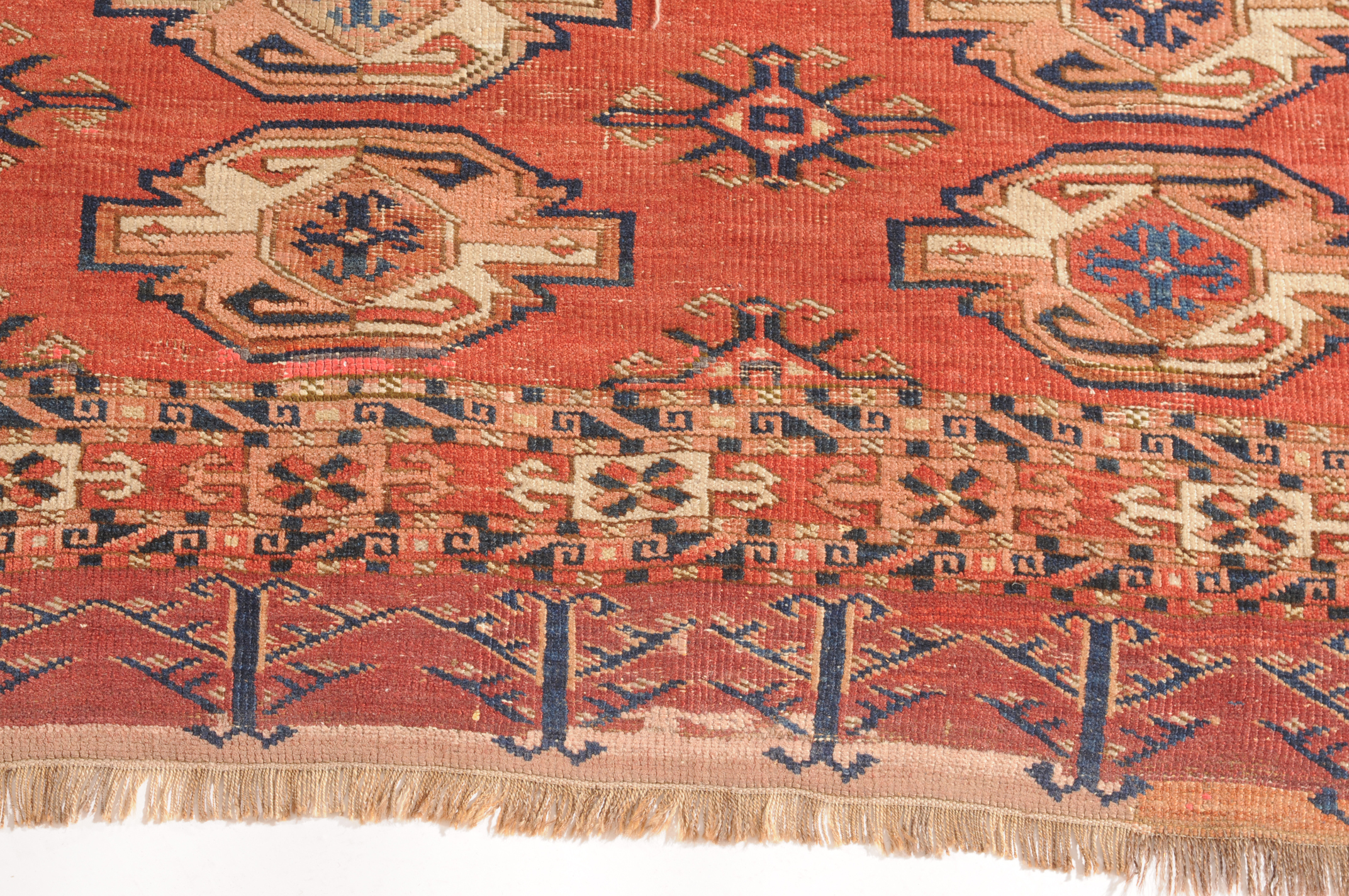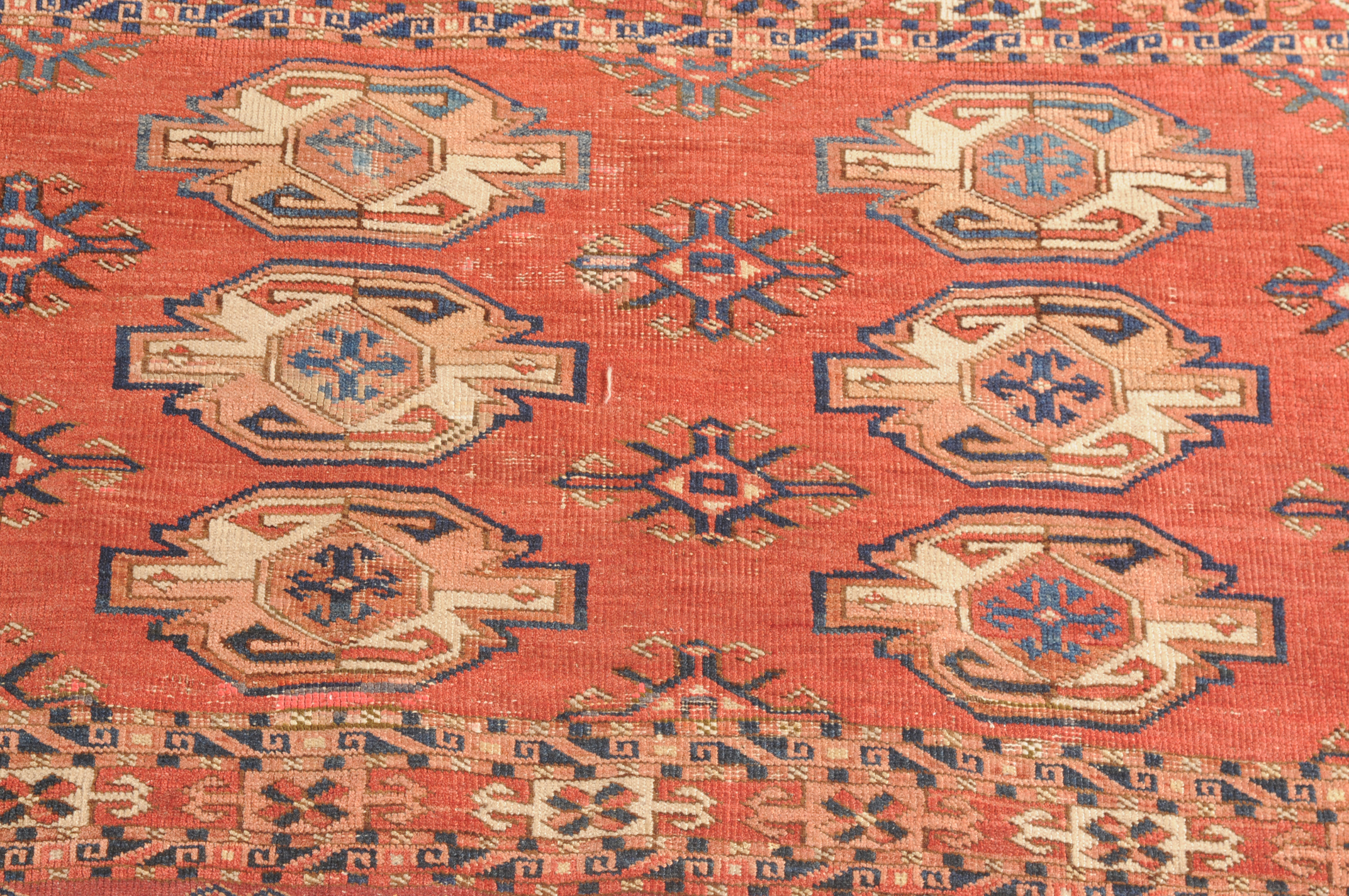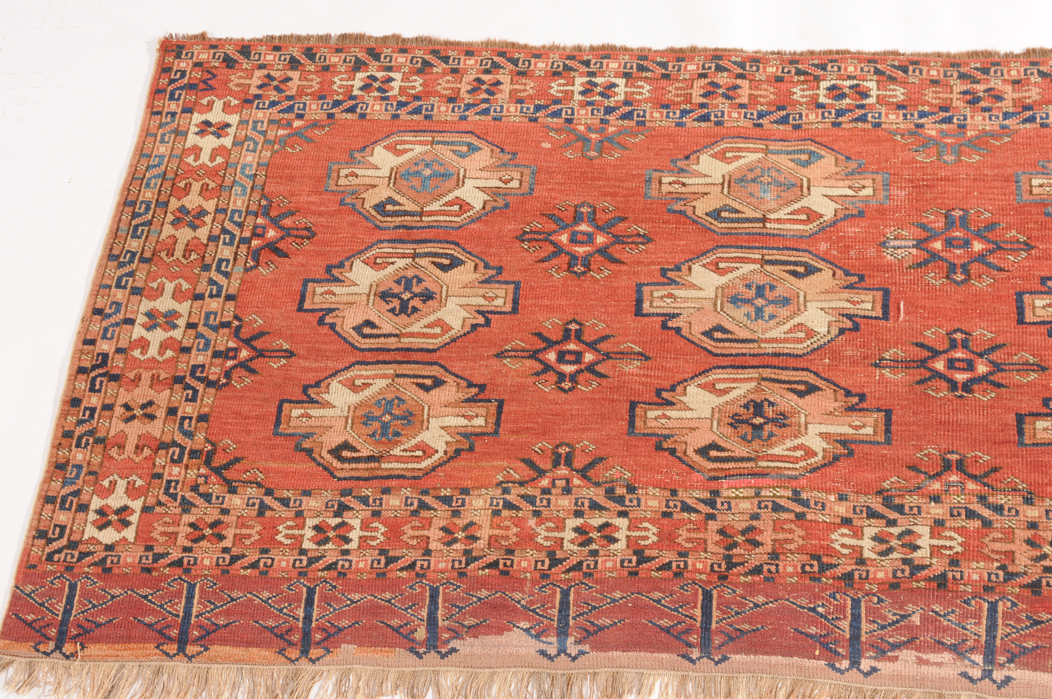 S-Turkmenistan, um 1900. Sehr feine Knüpfung. Im roten Tekke-Innenfeld sind 3 vertikale Reihen mit je 3 Tekke-Göls angelegt. Eine dekorative Kotschanak-Hauptbordüre säumt das Feld. Interessante Schürze. Alte reparierte Stelle in der Schürze. Minimale Gebrauchsspuren. 84x164 cm (ft. 2.8x5.4).