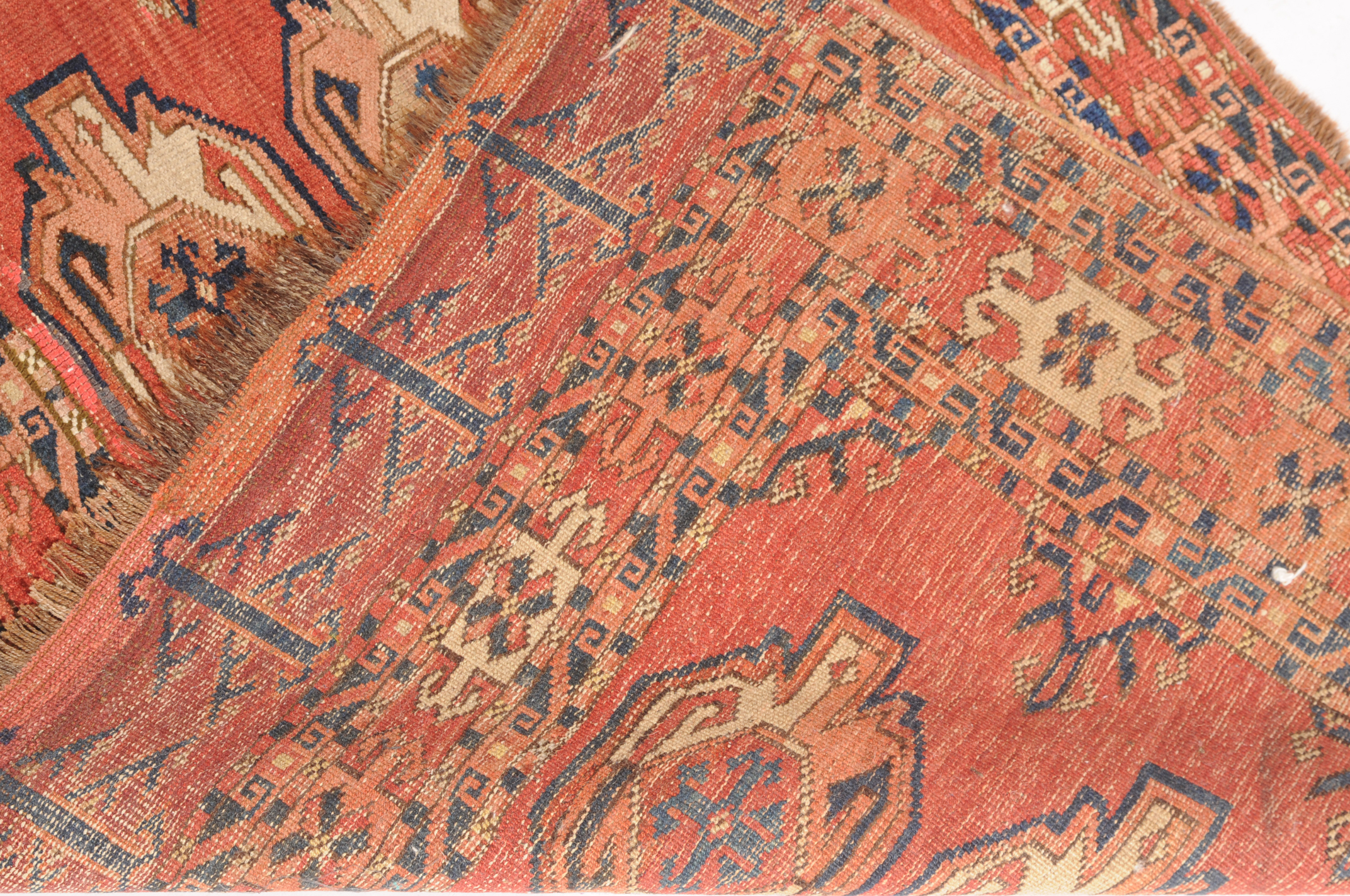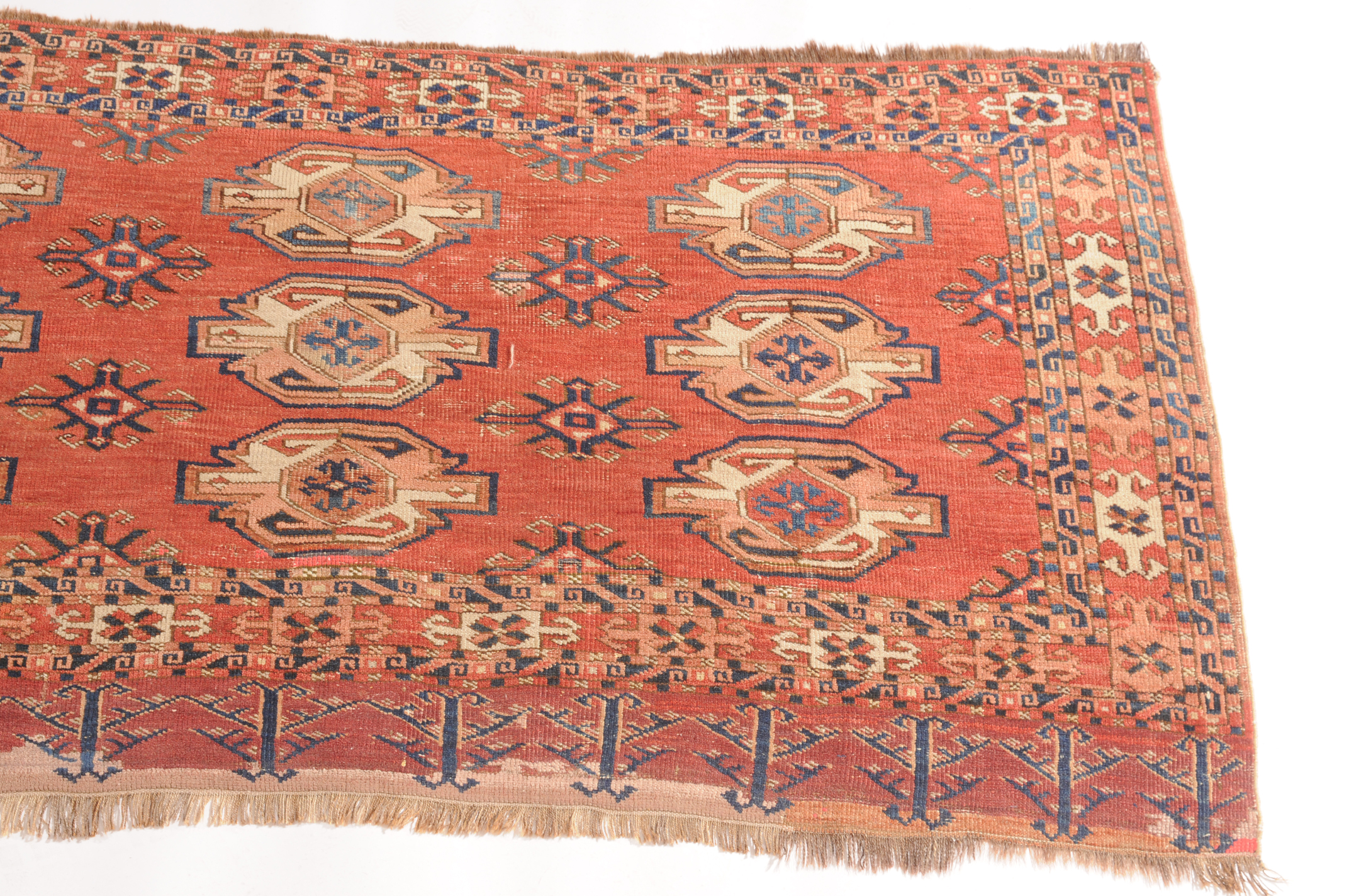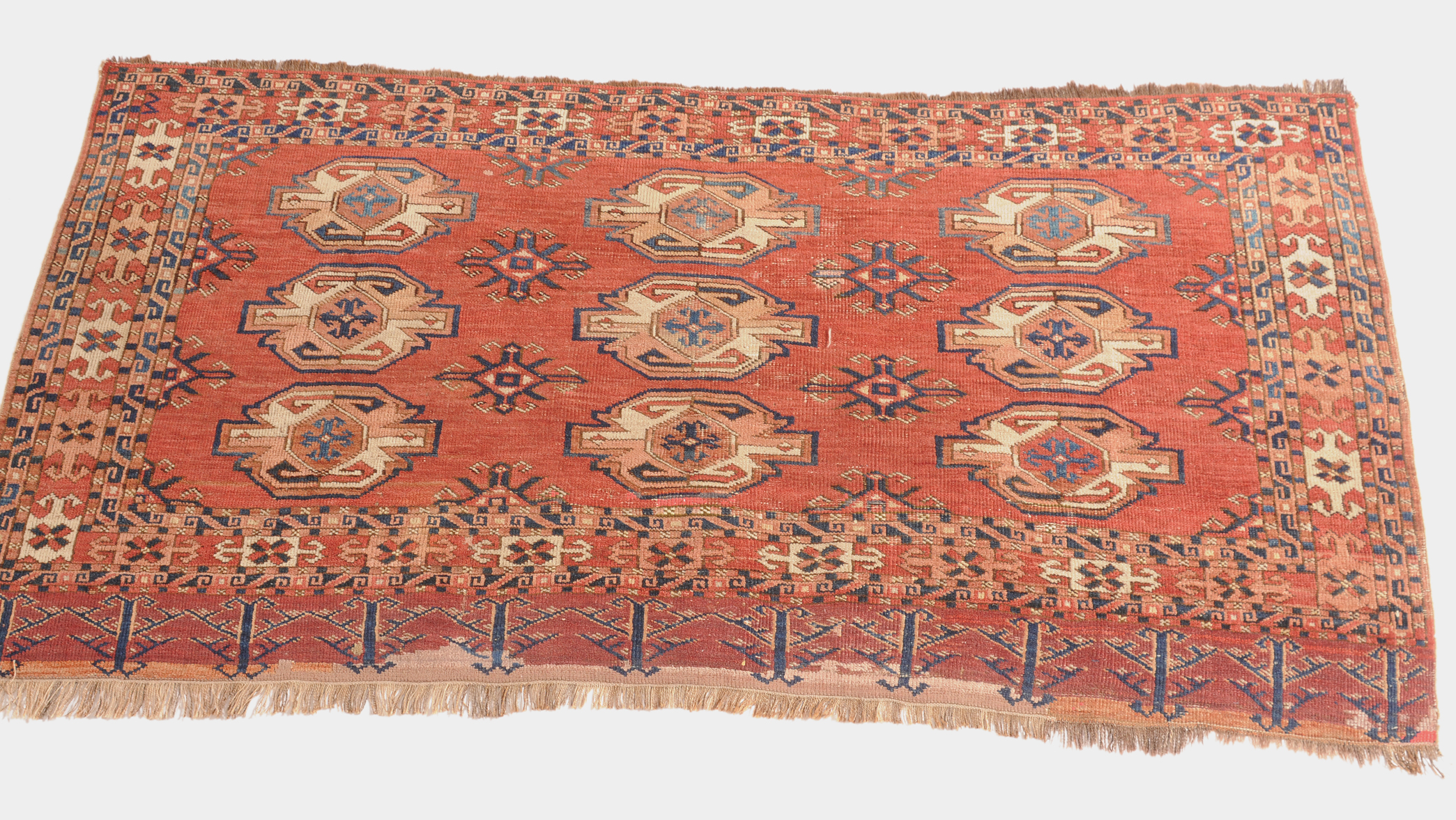 S-Turkmenistan, um 1900. Sehr feine Knüpfung. Im roten Tekke-Innenfeld sind 3 vertikale Reihen mit je 3 Tekke-Göls angelegt. Eine dekorative Kotschanak-Hauptbordüre säumt das Feld. Interessante Schürze. Alte reparierte Stelle in der Schürze. Minimale Gebrauchsspuren. 84x164 cm (ft. 2.8x5.4).