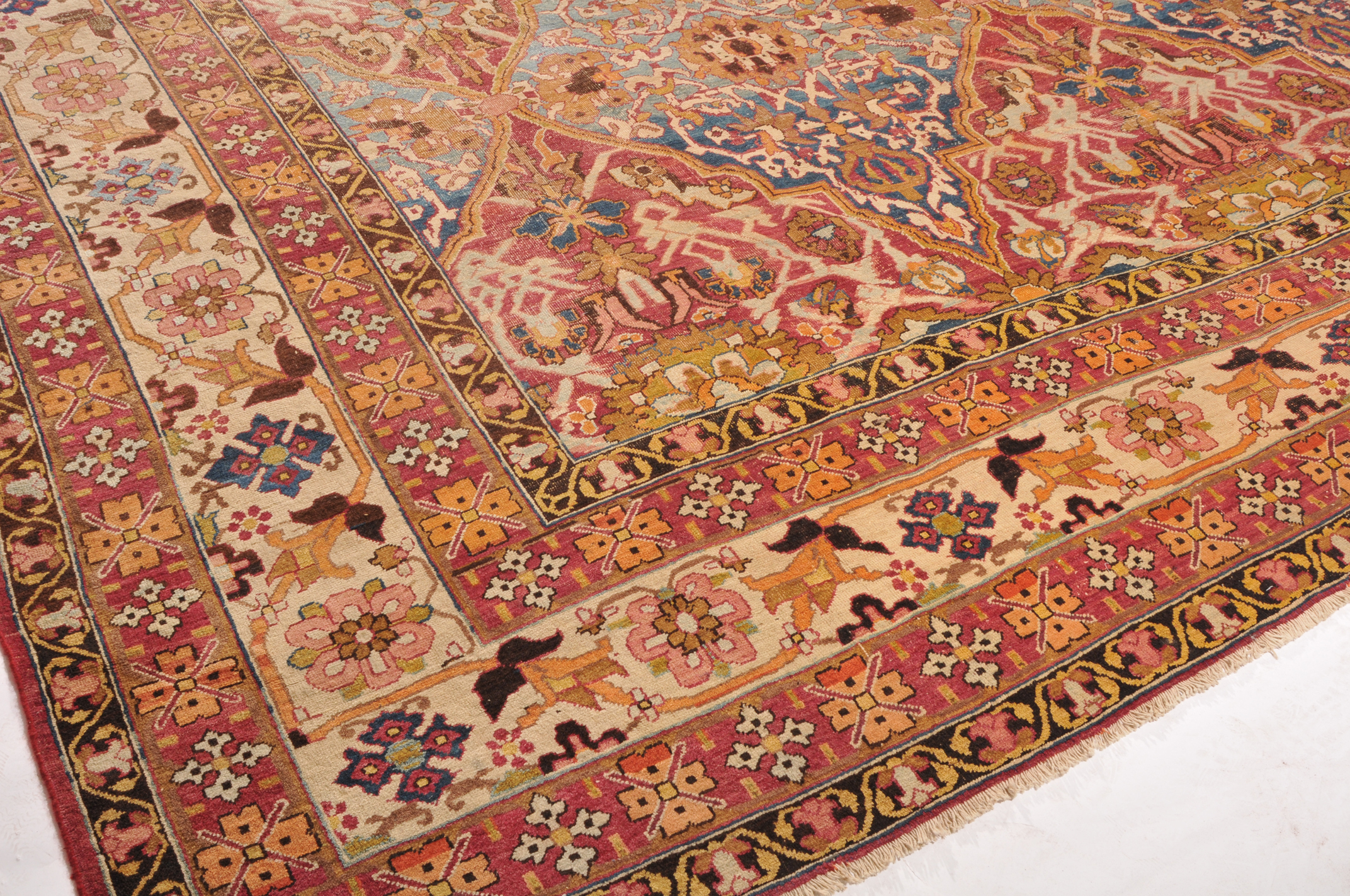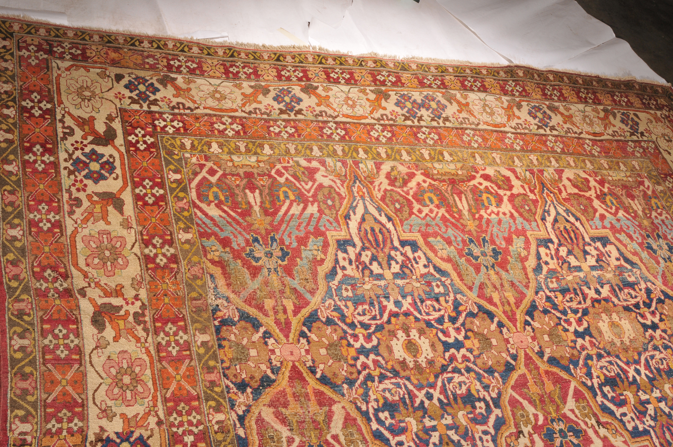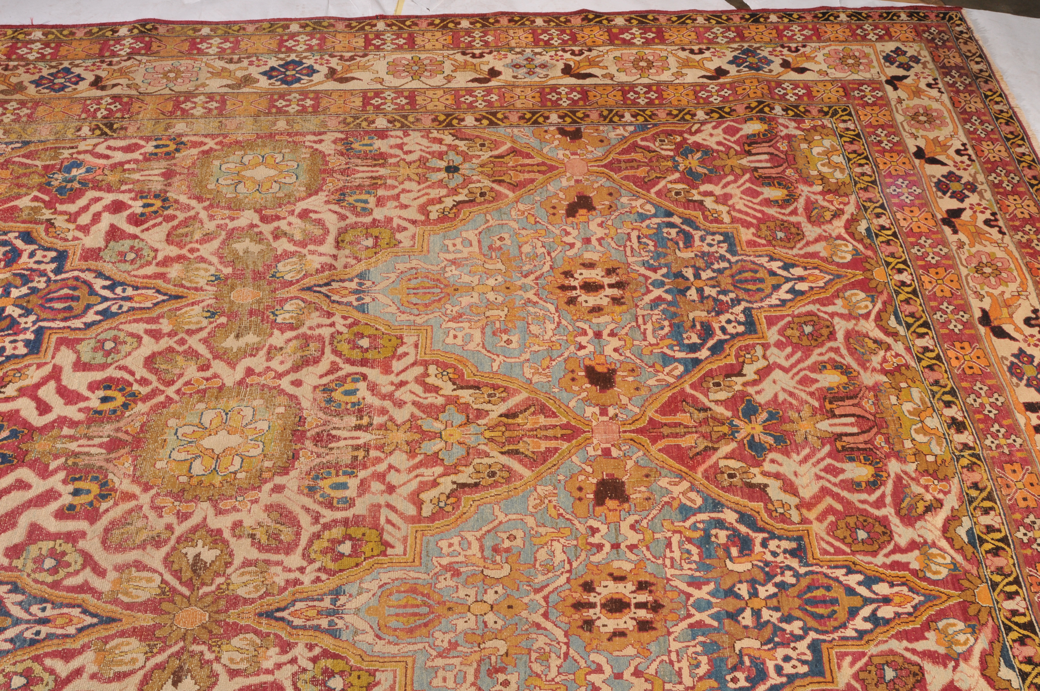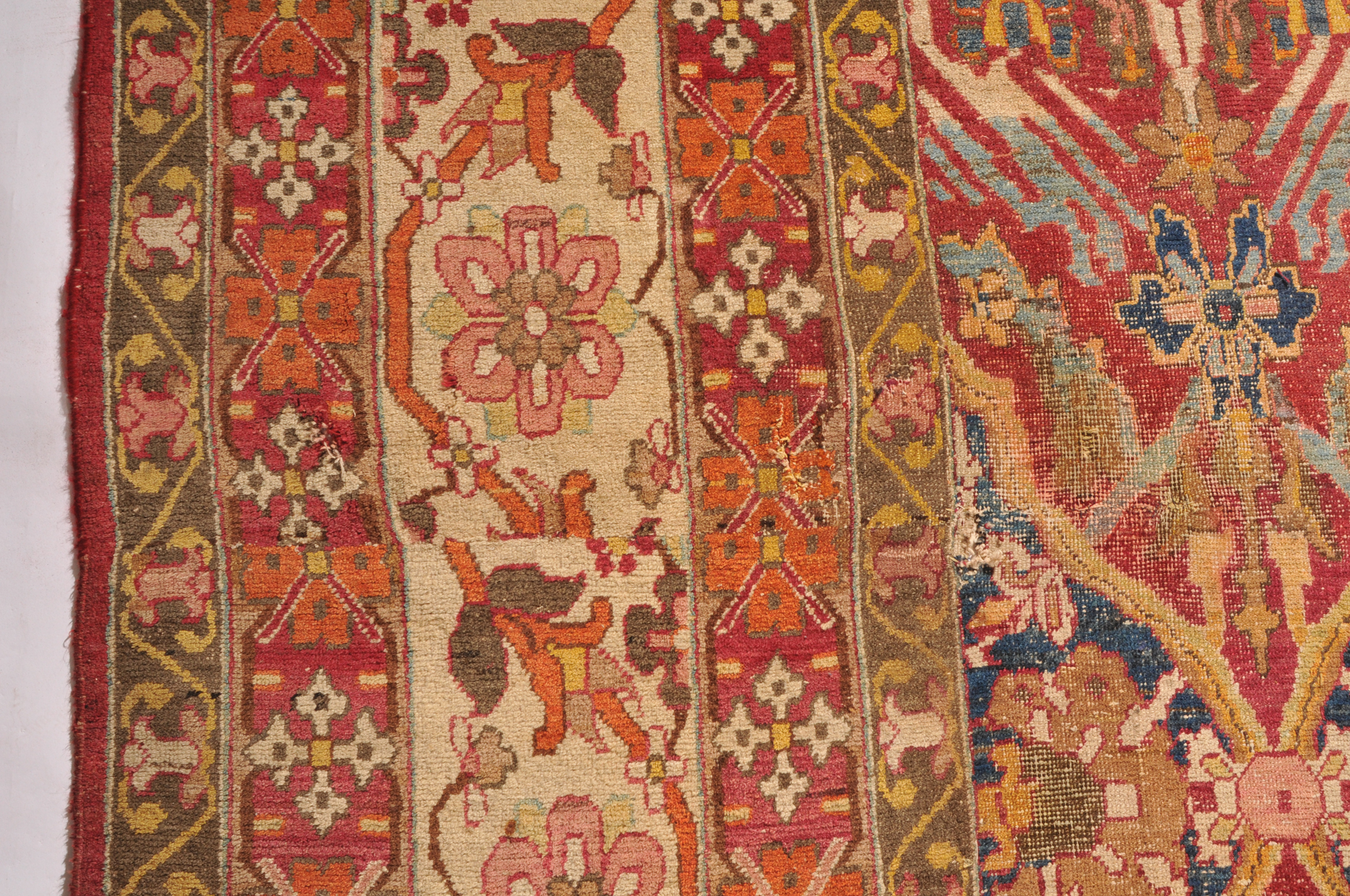 N-Indien, um 1900. Das rote Innenfeld ist durchgehend in grosse dekorative blaue und rote Rauten-Medaillons geteilt, die mit Blattranken und Blütenpalmetten dekoriert sind. 2 breite Nebenbordüren und Borten umranden die breite, fein gezeichnete weisse Bordüre. Der Teppich ist an einer Seite von der Breite her verkürzt und wieder zusammengenäht. Starke Gebrauchsspuren. 355x470 cm (ft. 11.7x15.5).