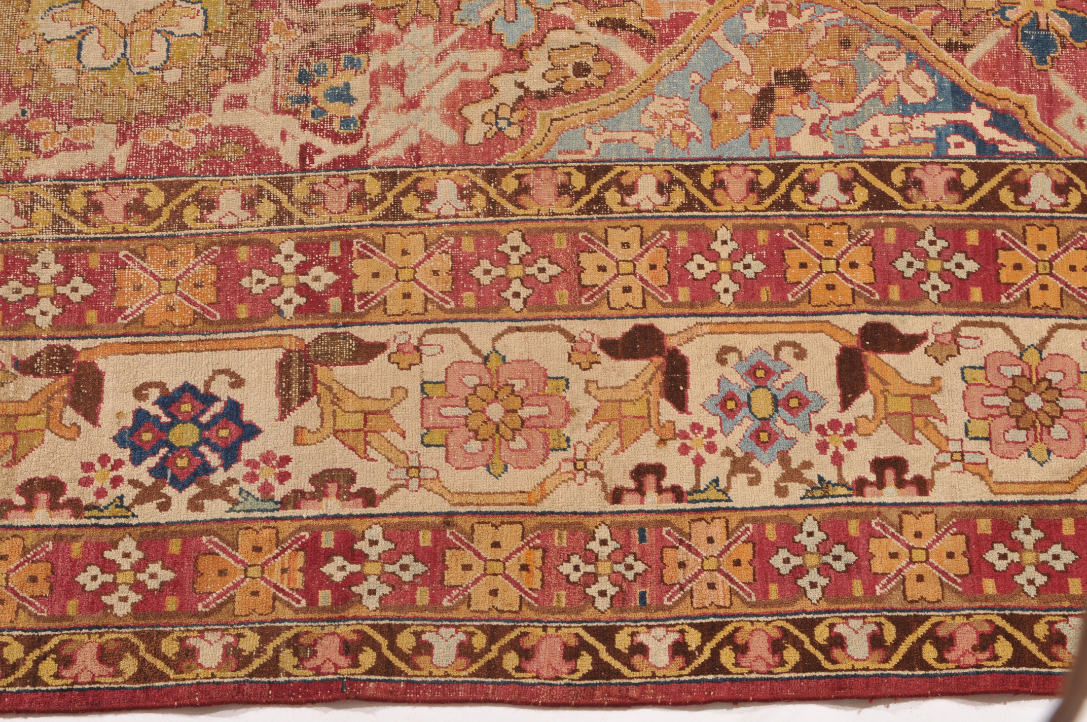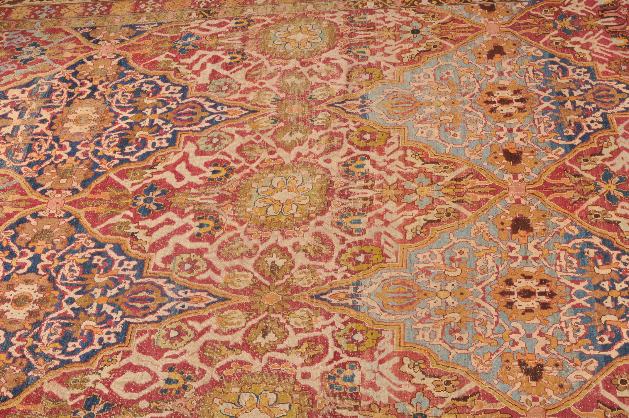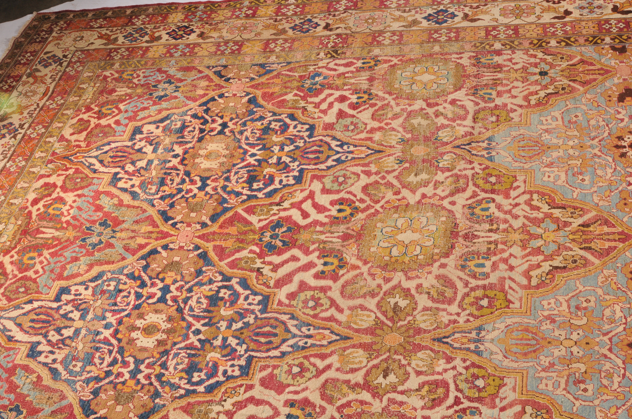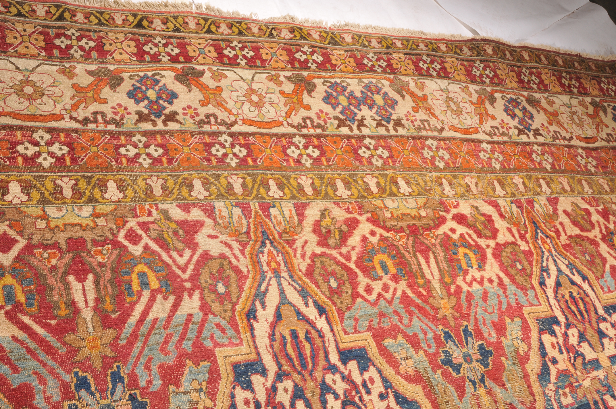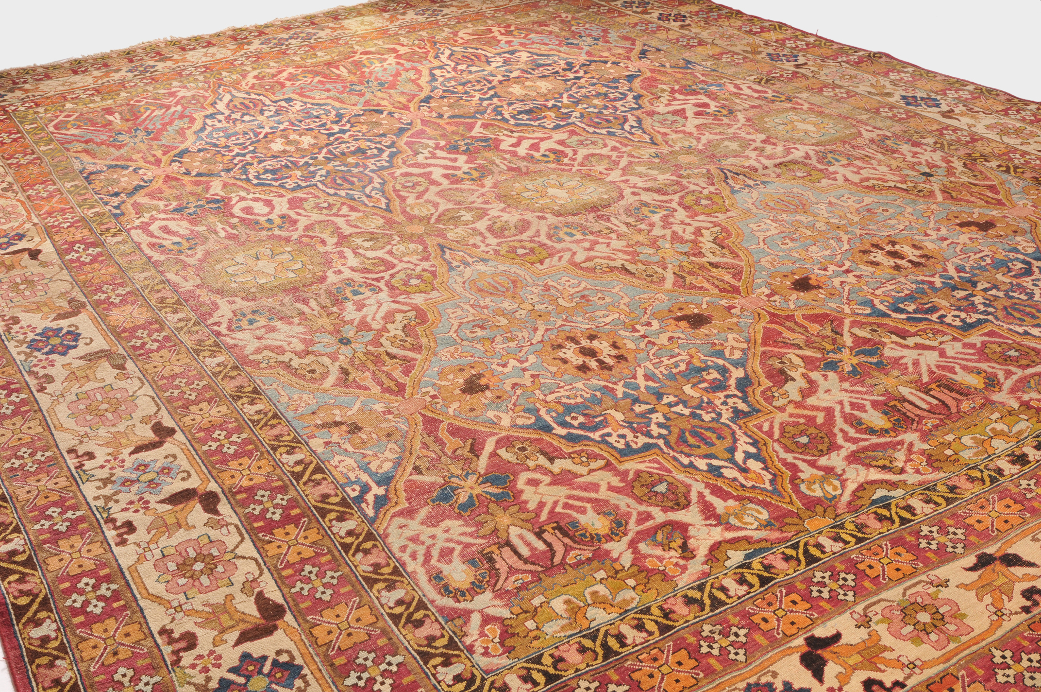 N-Indien, um 1900. Das rote Innenfeld ist durchgehend in grosse dekorative blaue und rote Rauten-Medaillons geteilt, die mit Blattranken und Blütenpalmetten dekoriert sind. 2 breite Nebenbordüren und Borten umranden die breite, fein gezeichnete weisse Bordüre. Der Teppich ist an einer Seite von der Breite her verkürzt und wieder zusammengenäht. Starke Gebrauchsspuren. 355x470 cm (ft. 11.7x15.5).