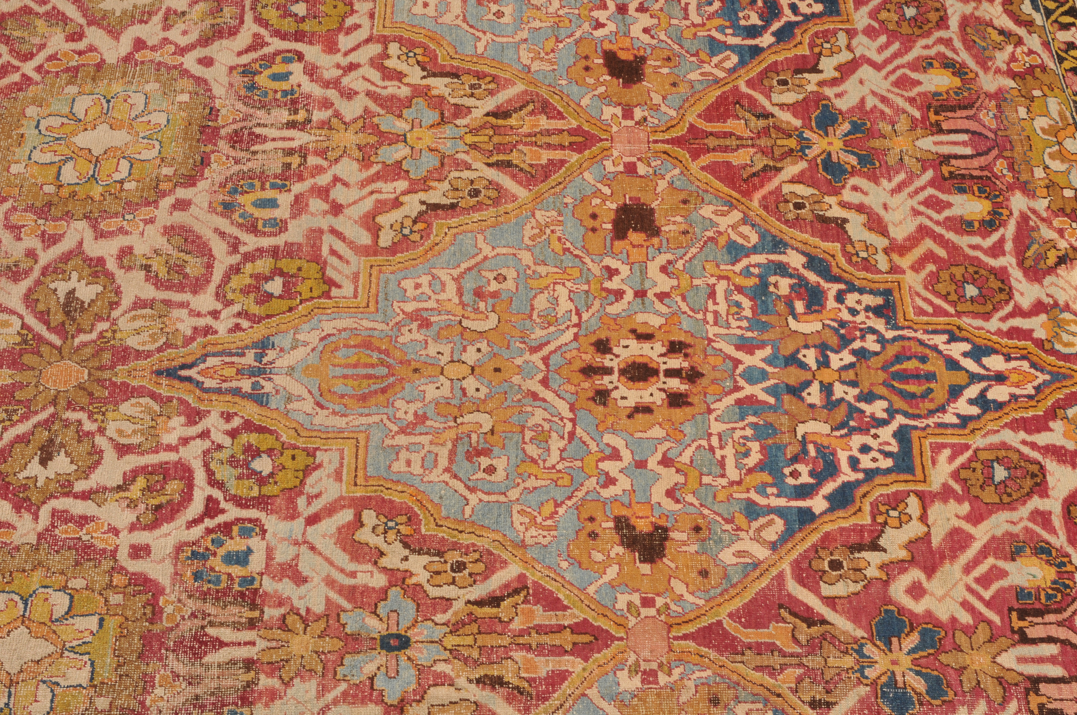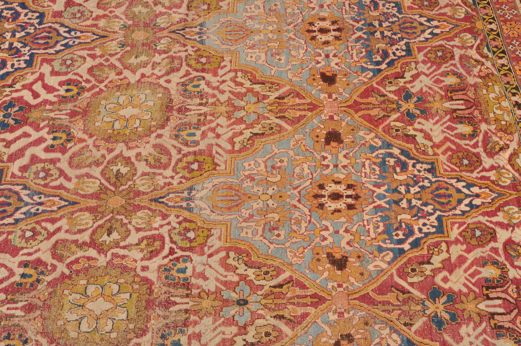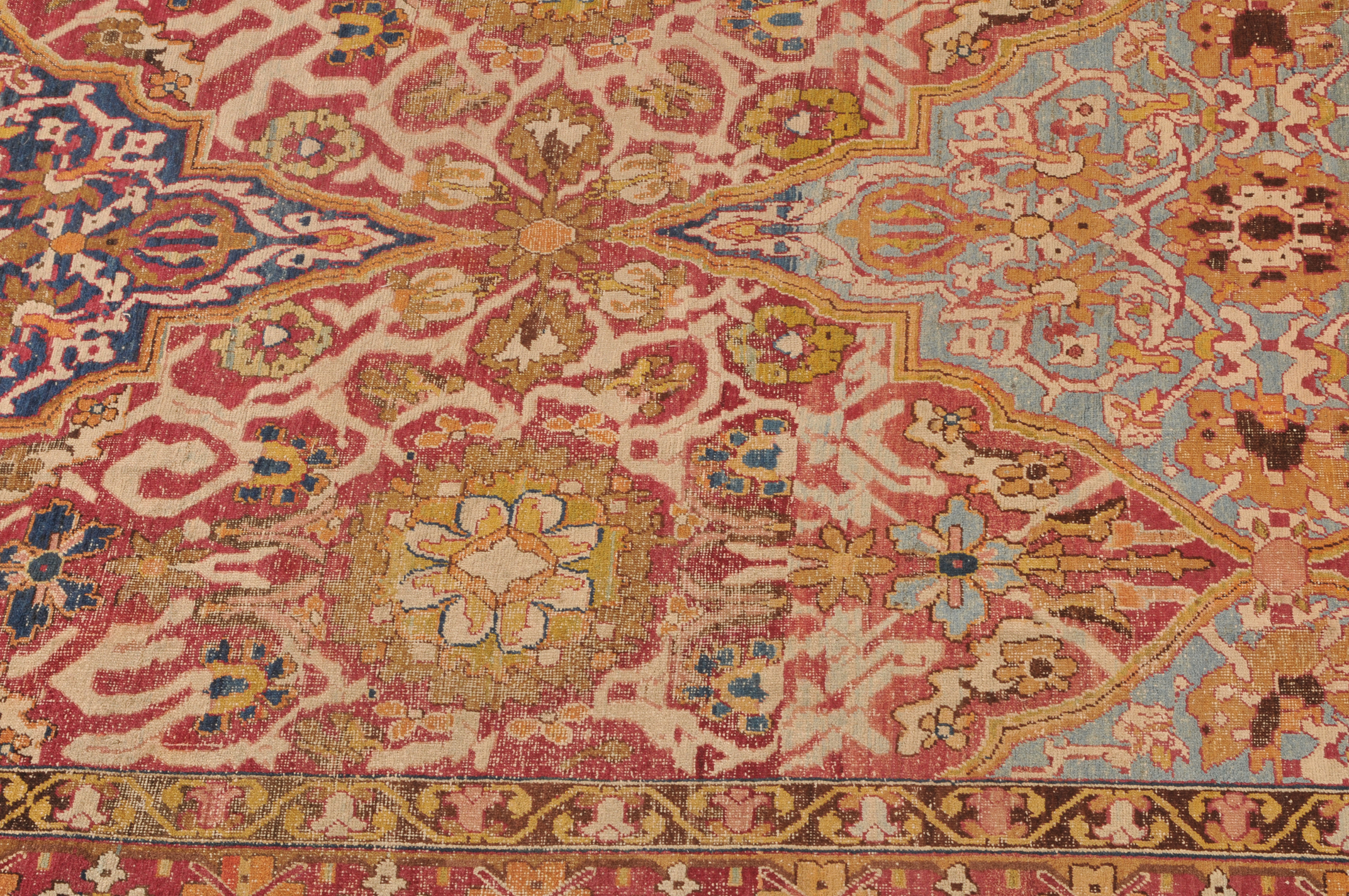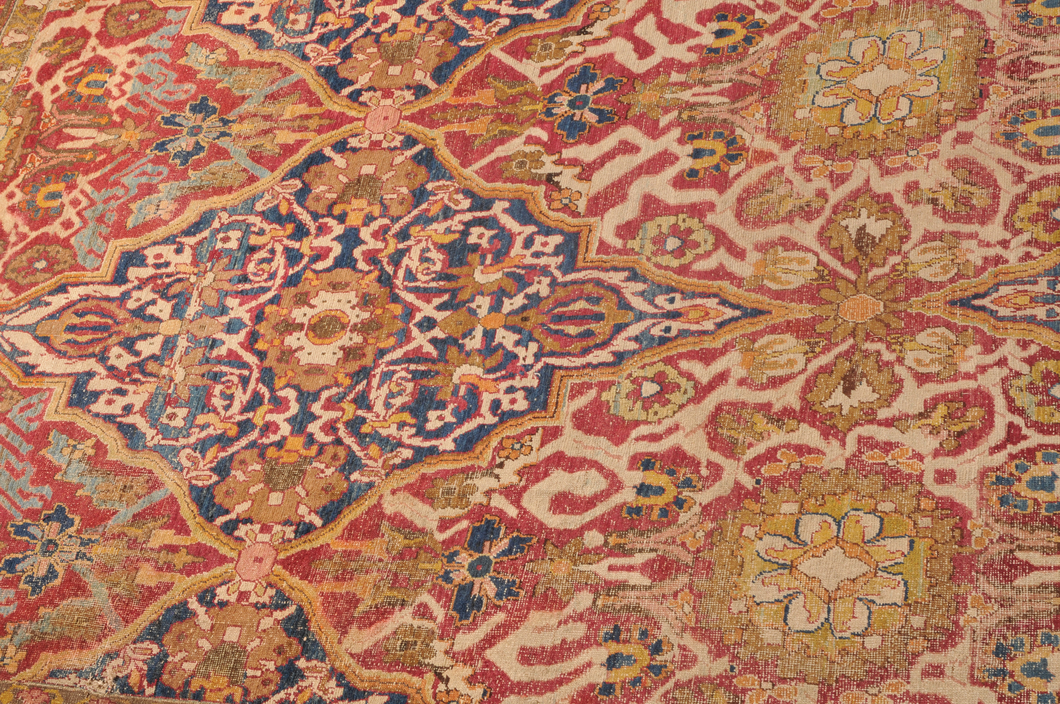 N-Indien, um 1900. Das rote Innenfeld ist durchgehend in grosse dekorative blaue und rote Rauten-Medaillons geteilt, die mit Blattranken und Blütenpalmetten dekoriert sind. 2 breite Nebenbordüren und Borten umranden die breite, fein gezeichnete weisse Bordüre. Der Teppich ist an einer Seite von der Breite her verkürzt und wieder zusammengenäht. Starke Gebrauchsspuren. 355x470 cm (ft. 11.7x15.5).
