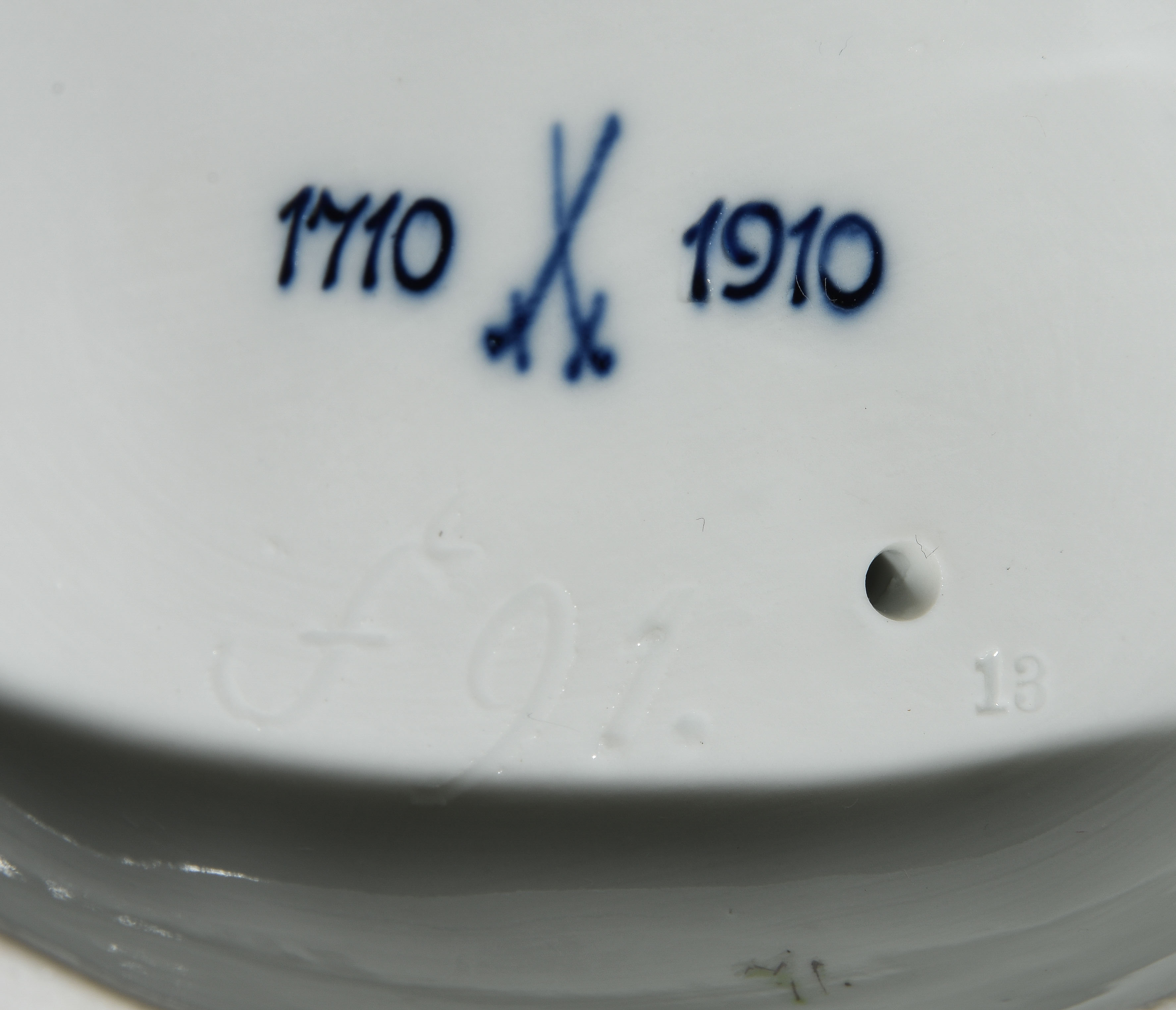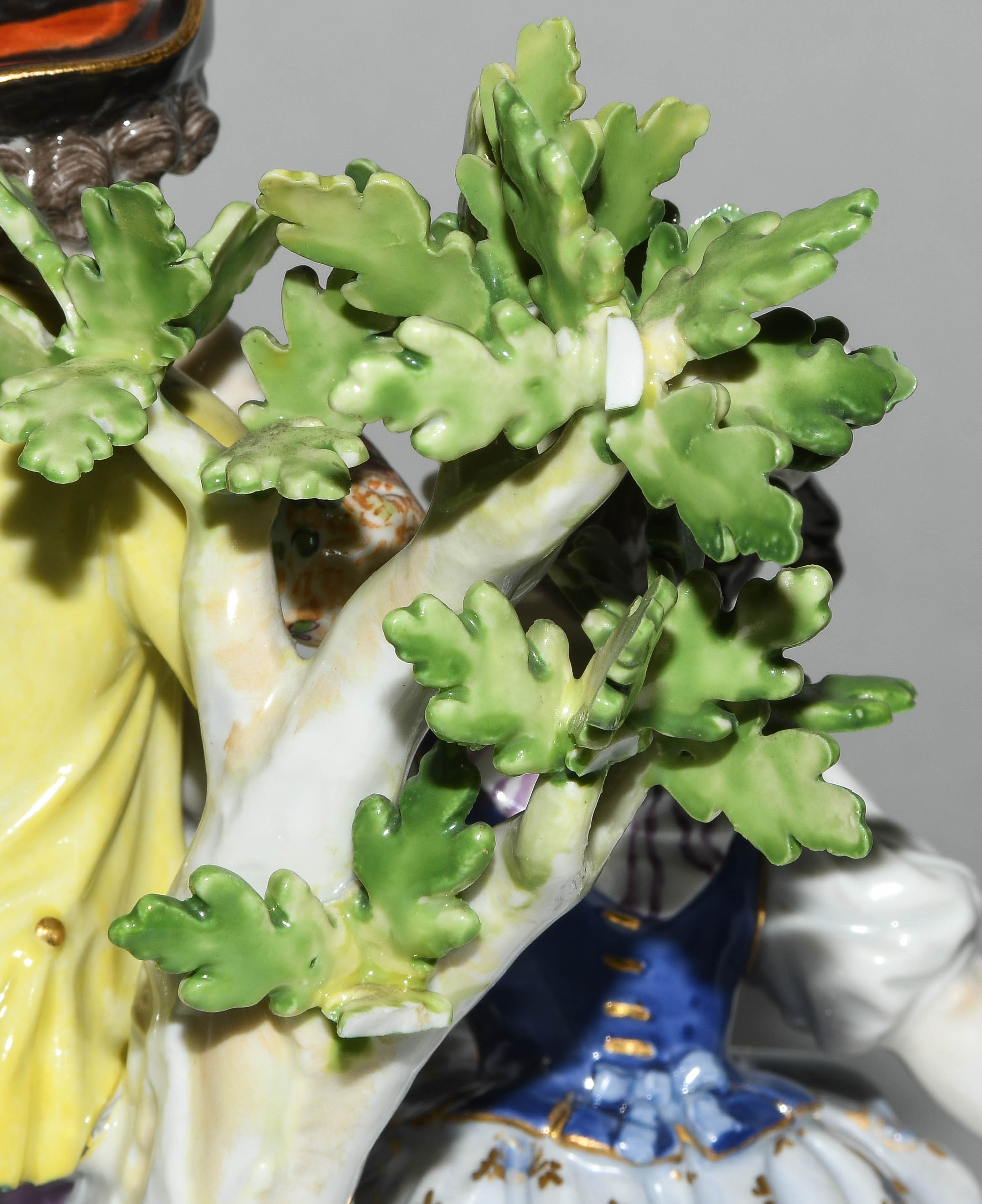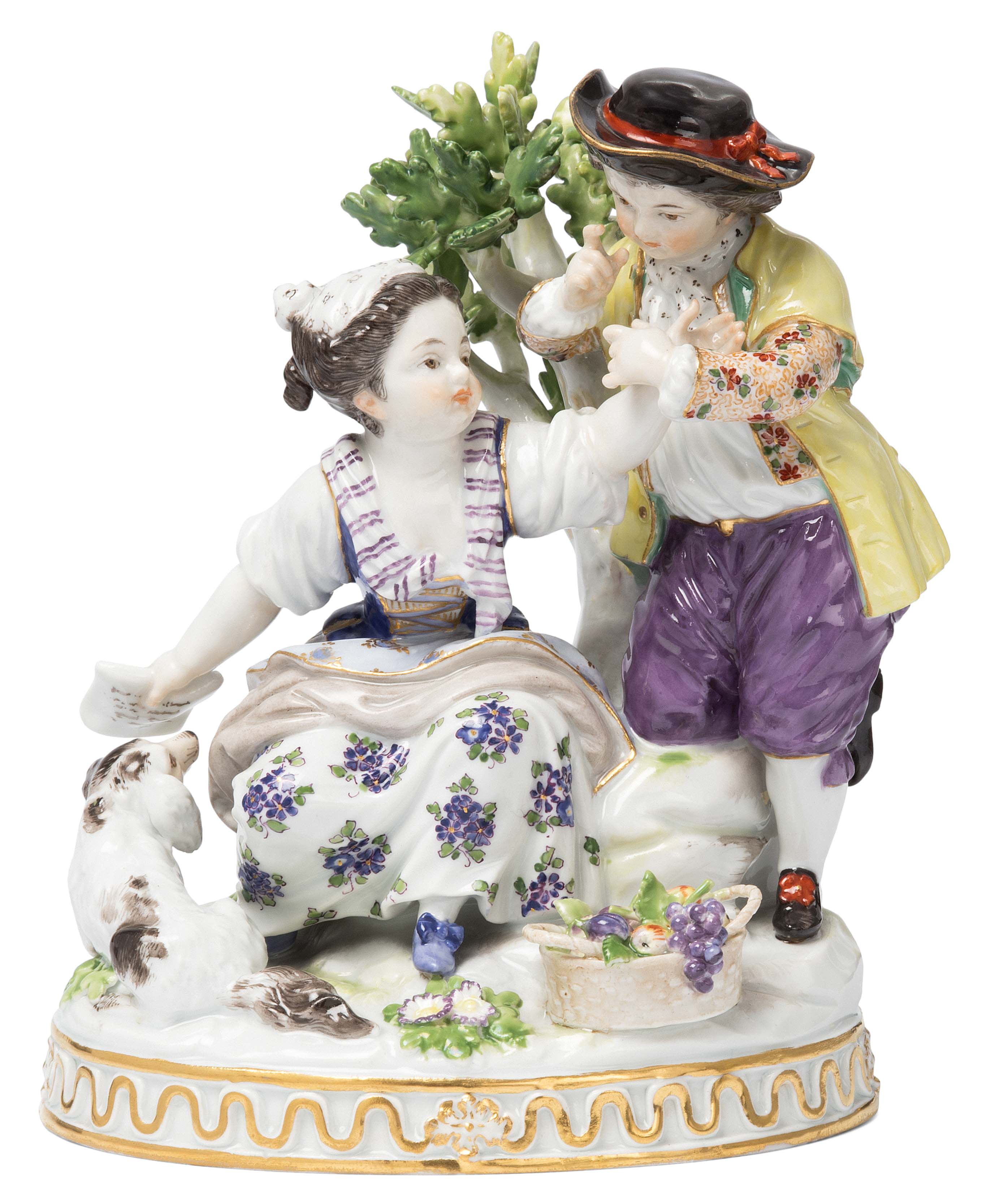 1910. Aus einer Serie die "Vier Jahreszeiten". Modell von Michel Victor Acier, Modell-Jahr 1778. 1. Wahl. Porzellan, bemalt. Knabe und Mädchen mit Hund. Bezeichnet: Schwertermarke, Modell-Nummer F 91, blaue Jahreszahlen 1710–1910. H 15,5 cm.