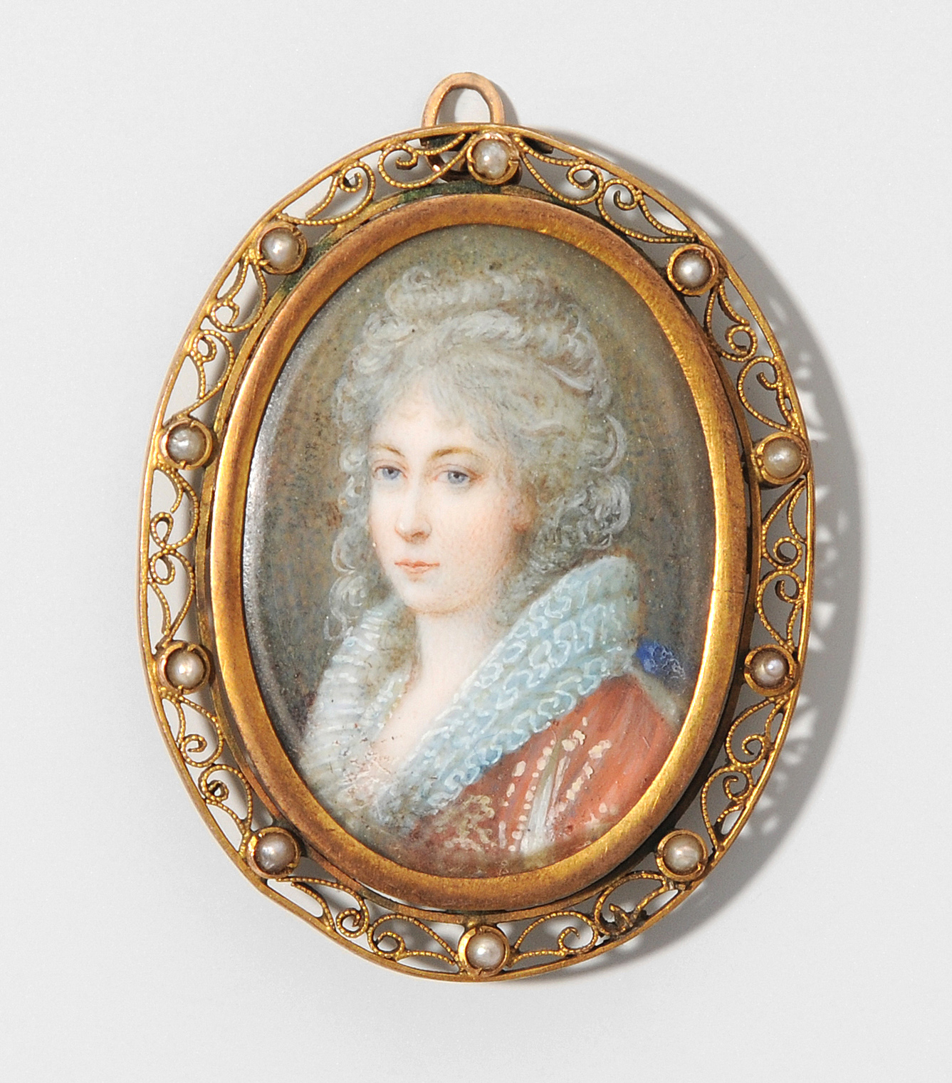 19.Jh. Gouachemalerei auf Elfenbein, oval. Junge Dame mit Lockenfrisur, in rotem Kleid mit Rüschenkragen. 14K-Goldfassung mit Flussperlen besetzt. 2,5x3,5 cm.