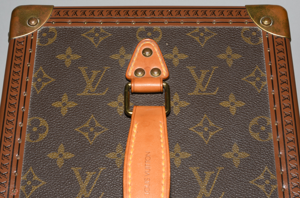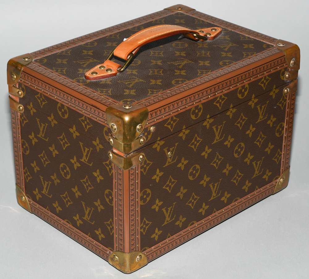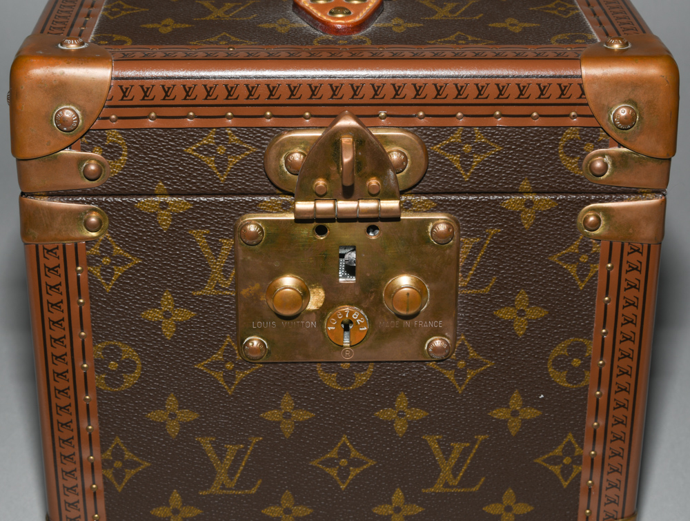 Monogram Canvas. Innen ein herausnehmbares Köfferchen und drei Lederschlaufen für Fläschchen. 21x21x30 cm. Ohne Schlüssel. Sehr guter Zustand, minimale Gebrauchsspuren.