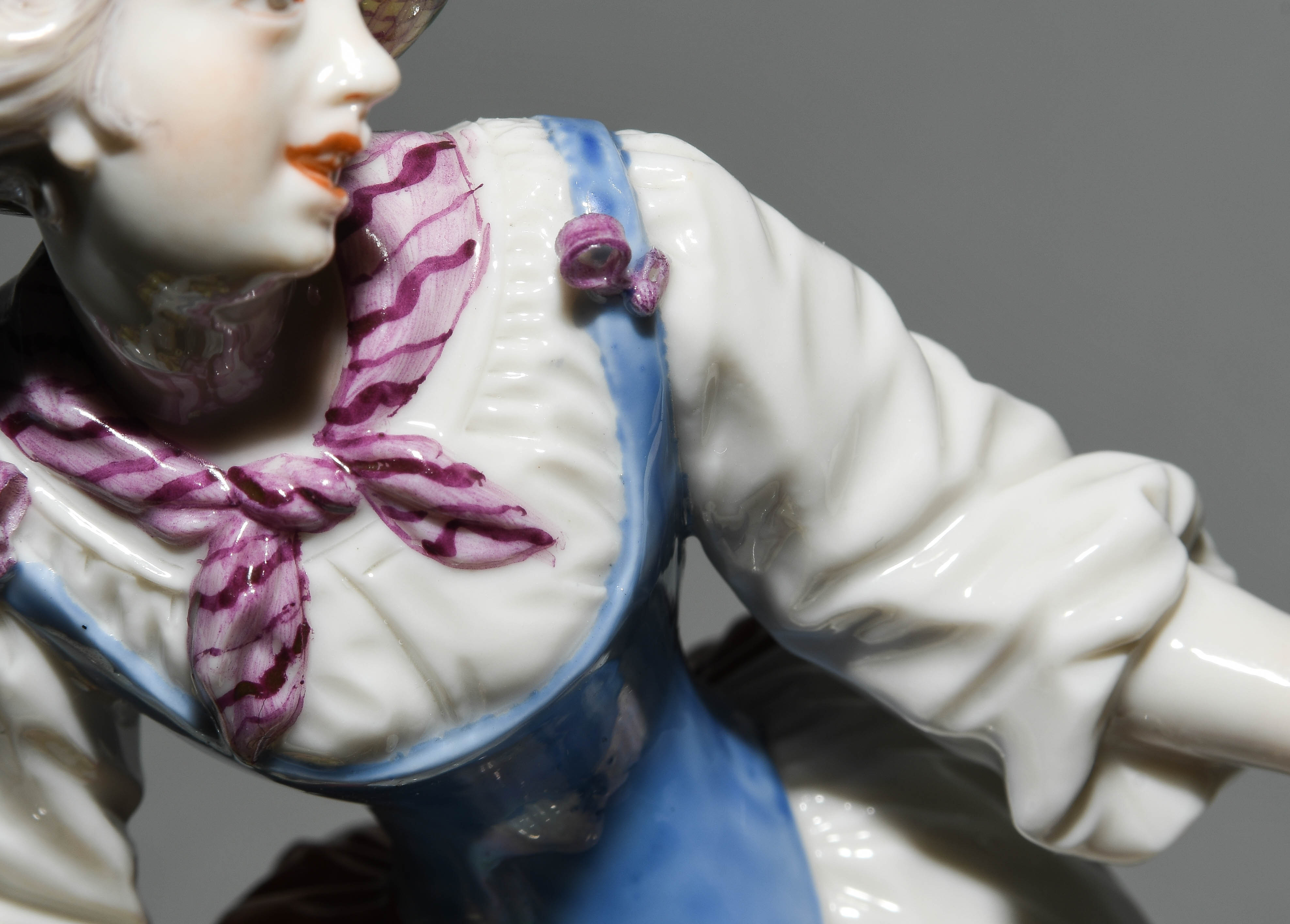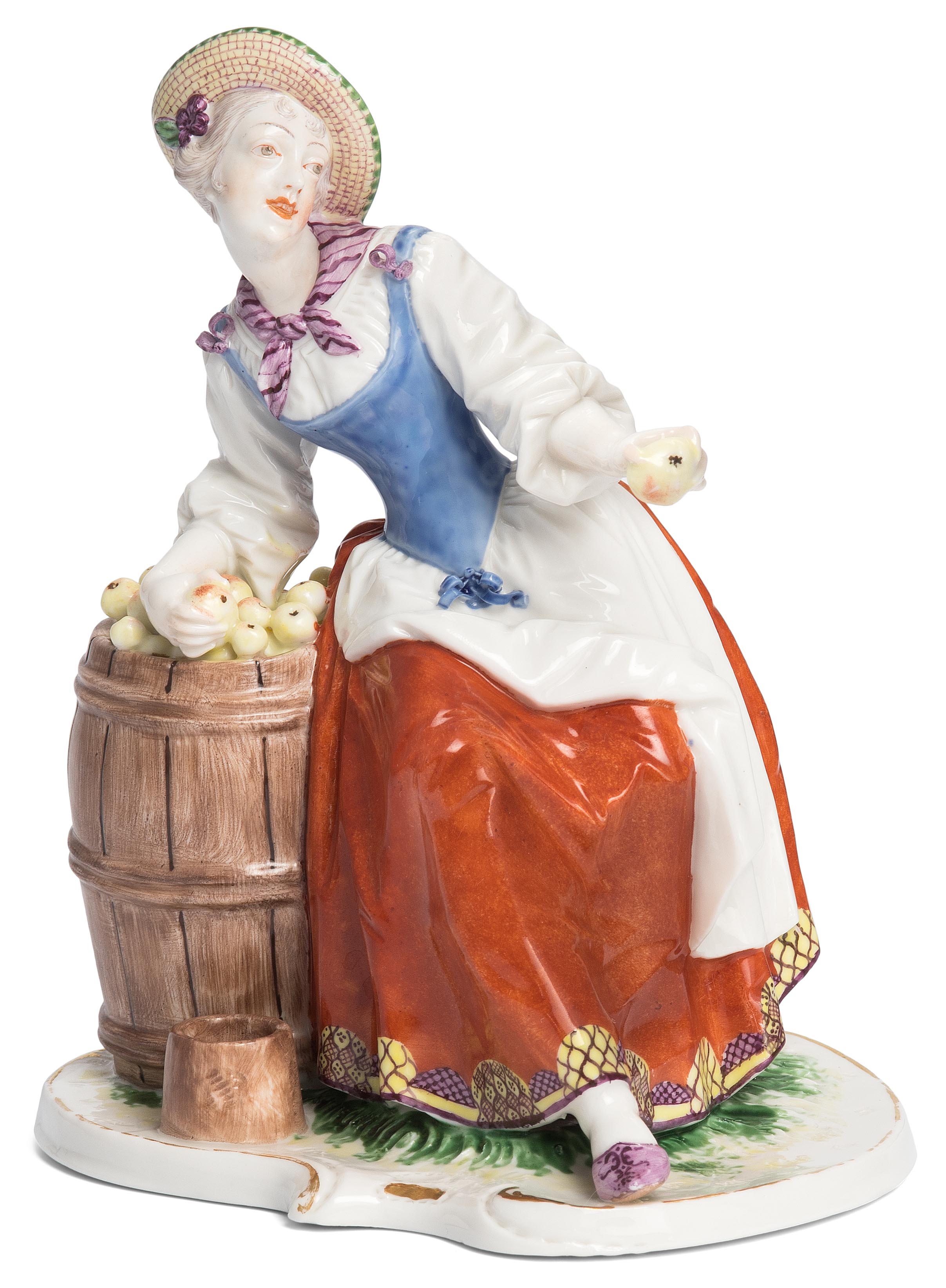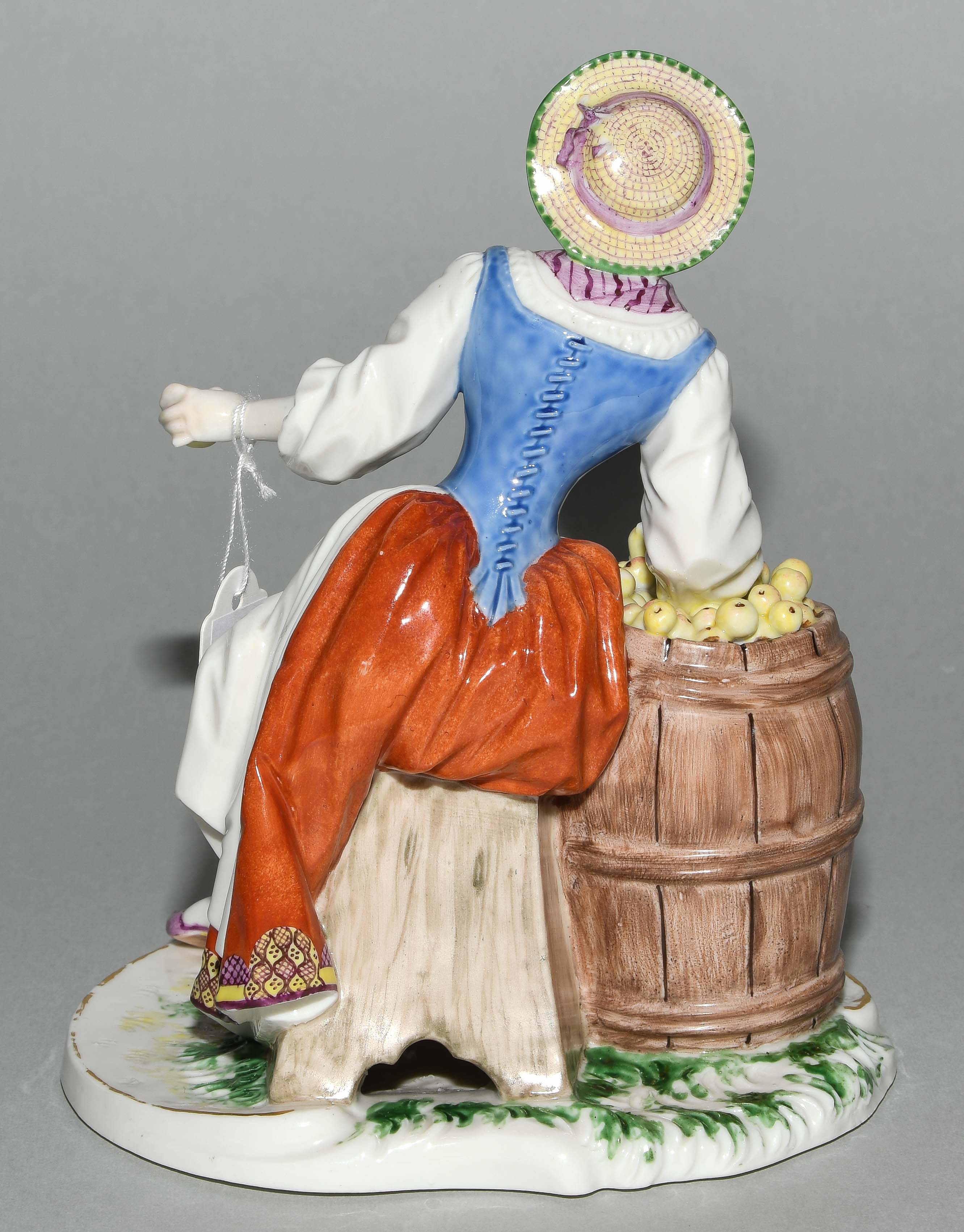 Nach 1900. "Apfelkramerin". Modell von Franz Anton Bustelli (tätig in Nymphenburg 1754–1763). Porzellan, farbige Bemalung. Bezeichnet: Rautenschild (blind), Modell-Nummer 311, 0. H 14,5 cm.