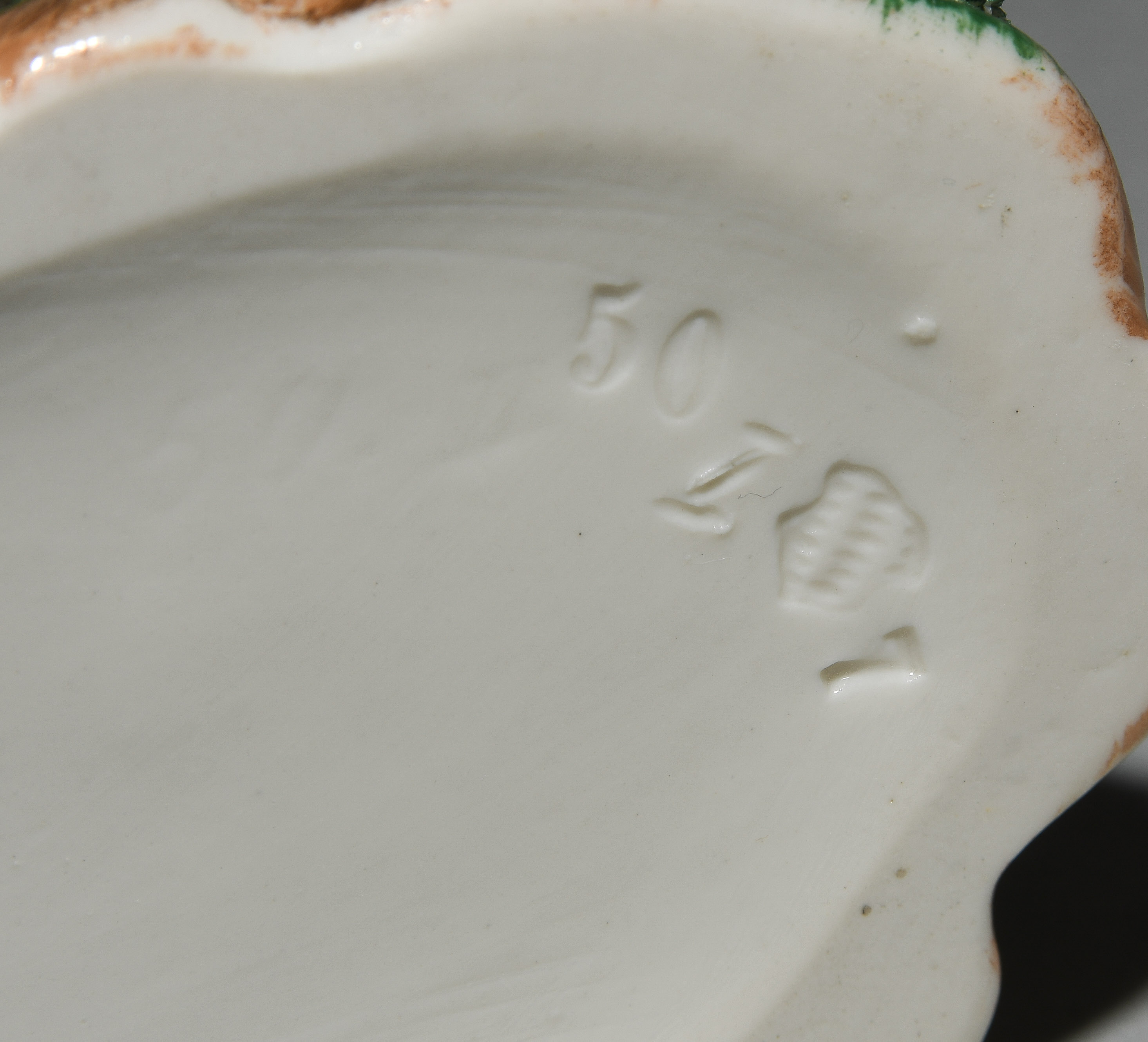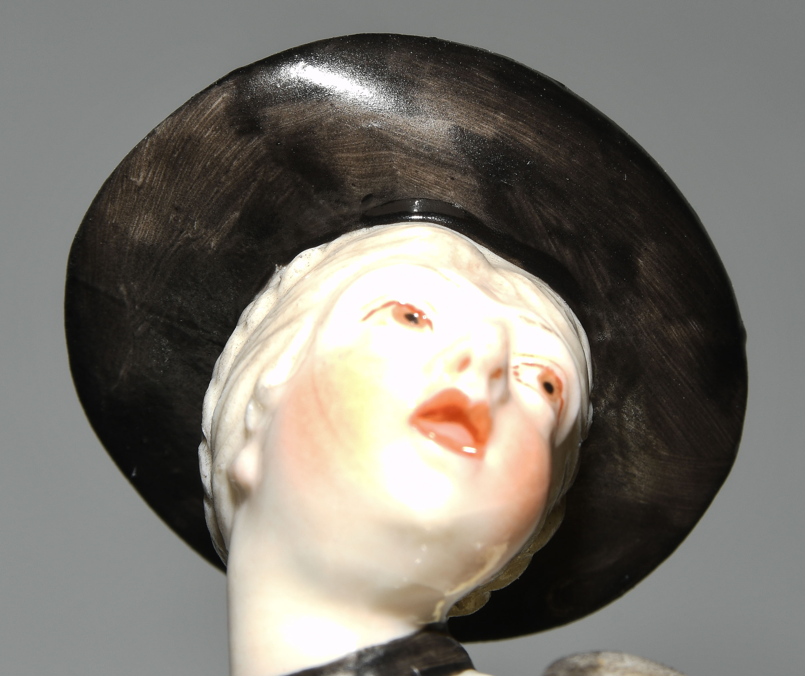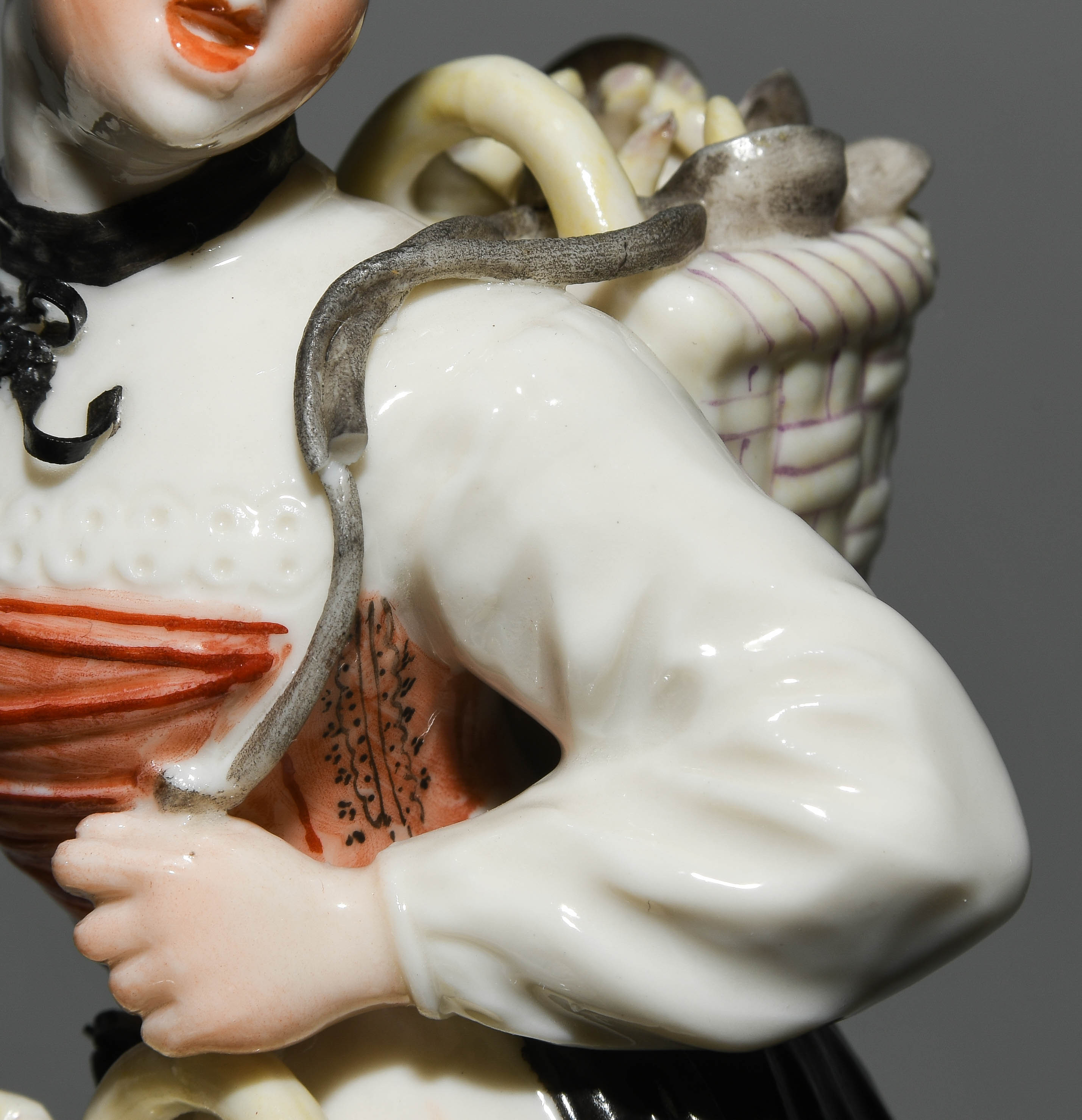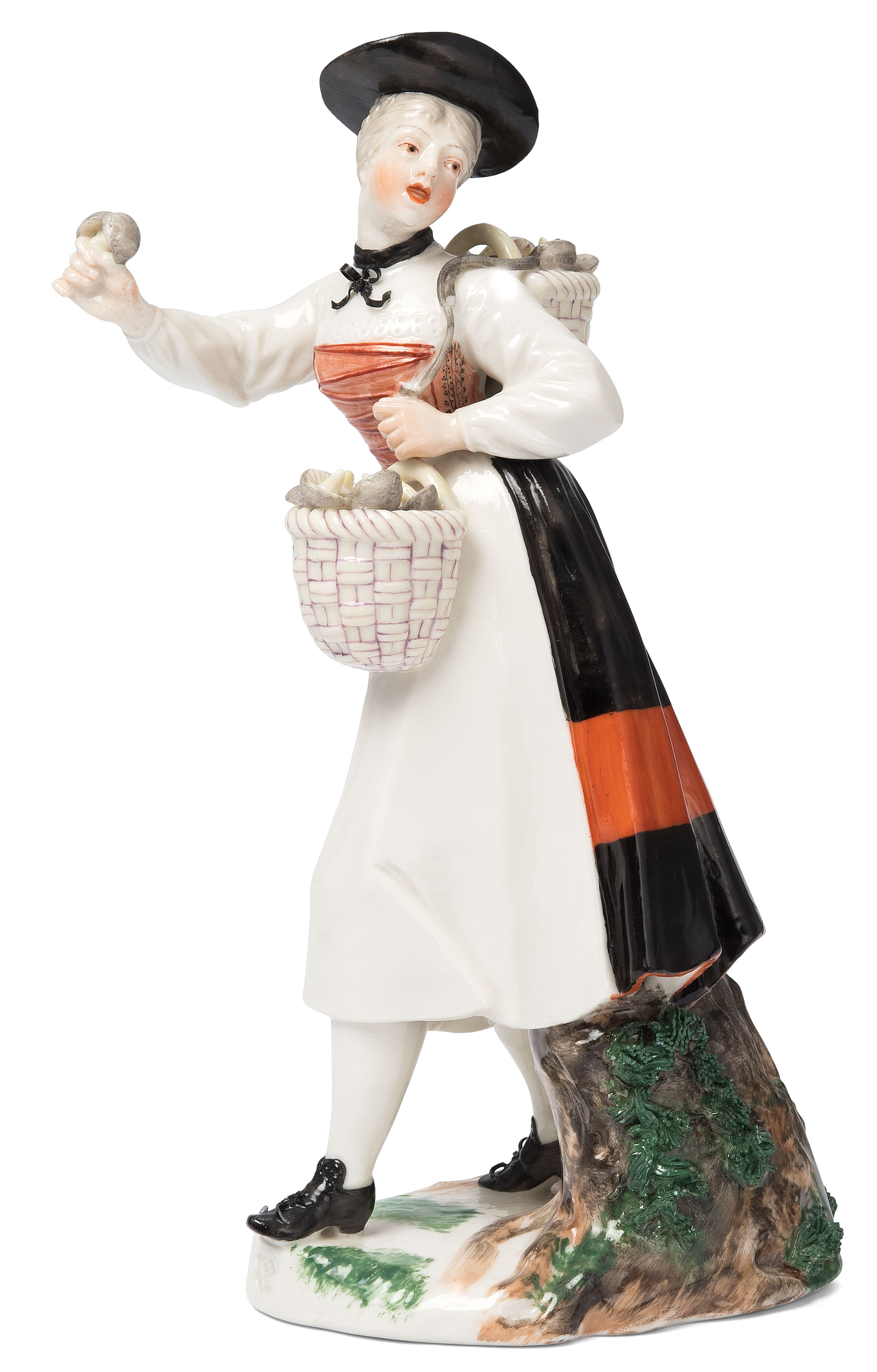 Nach 1900. "Schwammerlfrau". Modell von Franz Anton Bustelli (tätig in Nymphenburg 1754–1763). Porzellan, farbige Bemalung. Bezeichnet: Rautenschild (blind), Modell-Nummer 50, 7. H 19 cm.