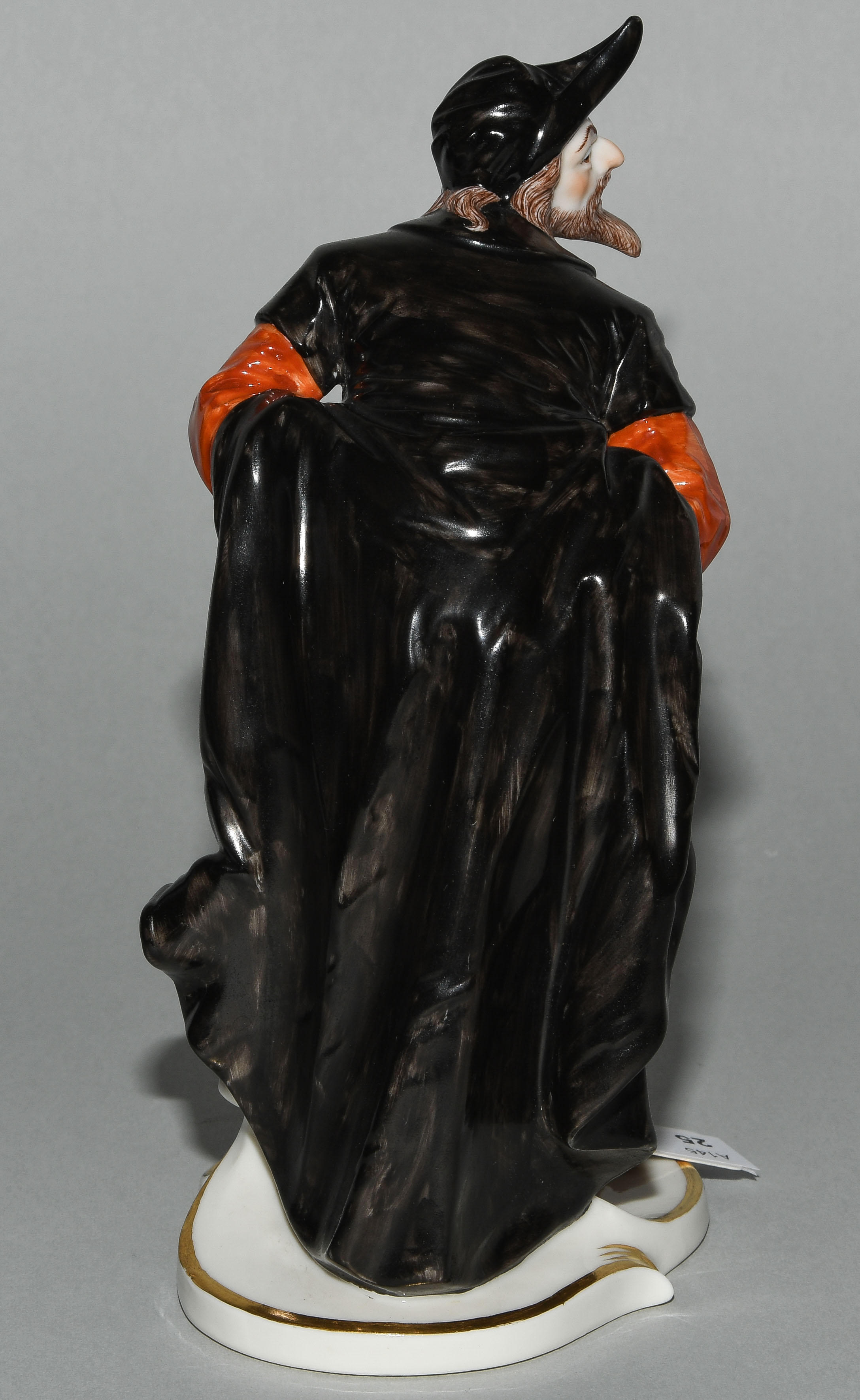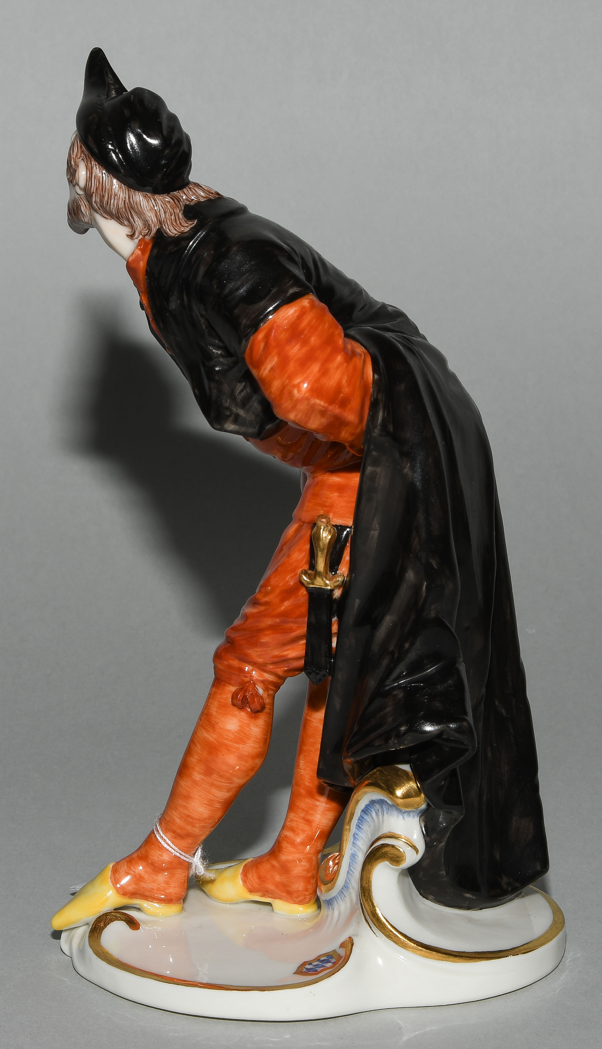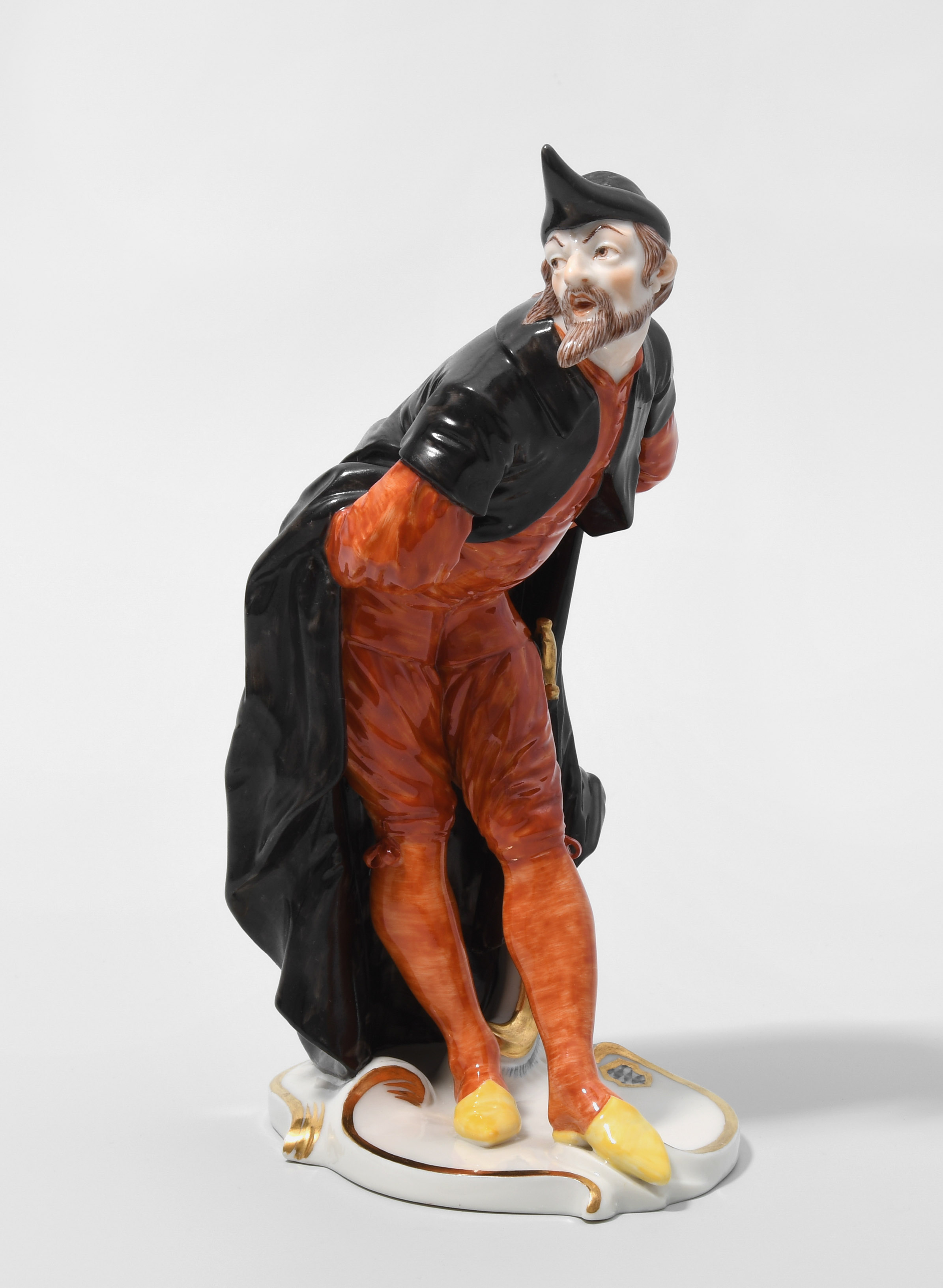 Nach 1900. Aus der Commedia dell'arte. Modell von Franz Anton Bustelli (tätig in Nymphenburg 1754–1763). Porzellan, farbige Bemalung. Bezeichnet: Schwertermarke (blind), Modell-Nummer 57, 0. H 18 cm.